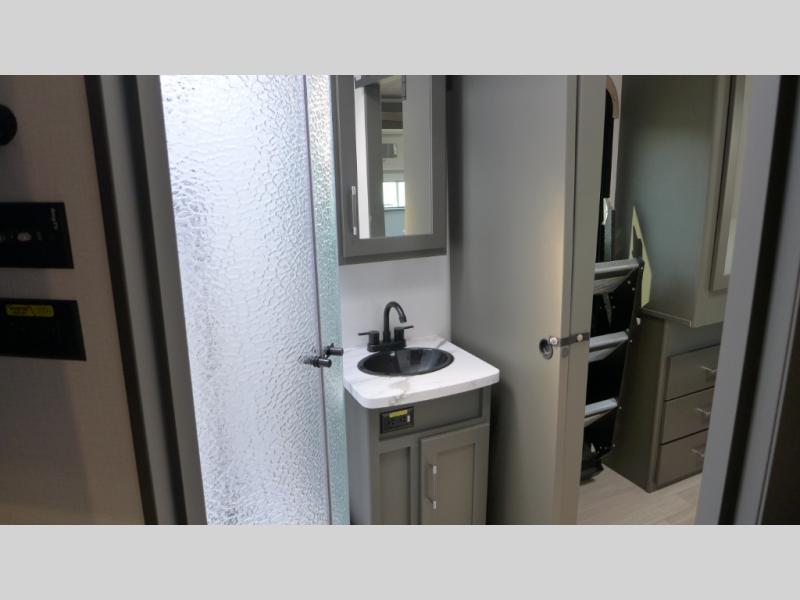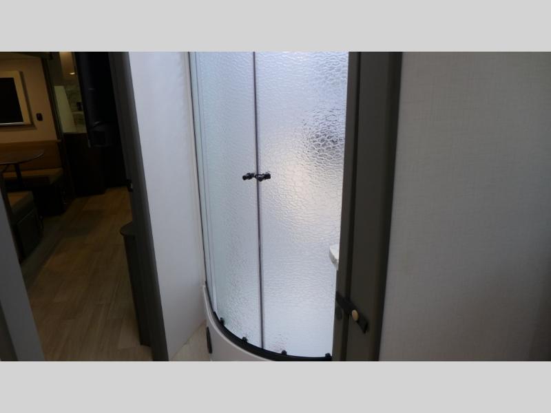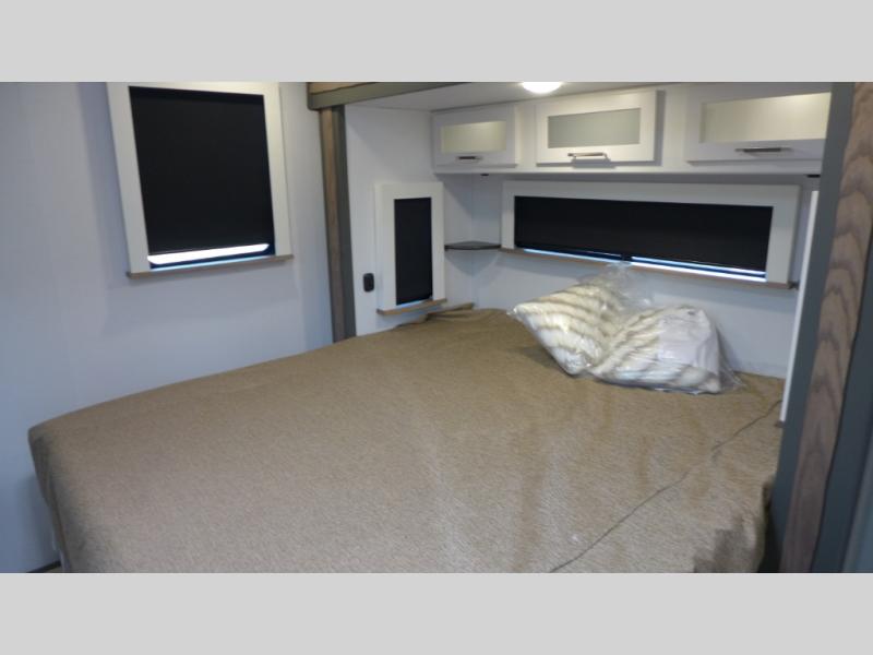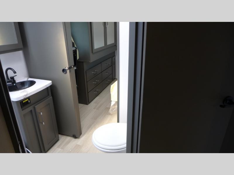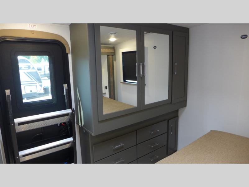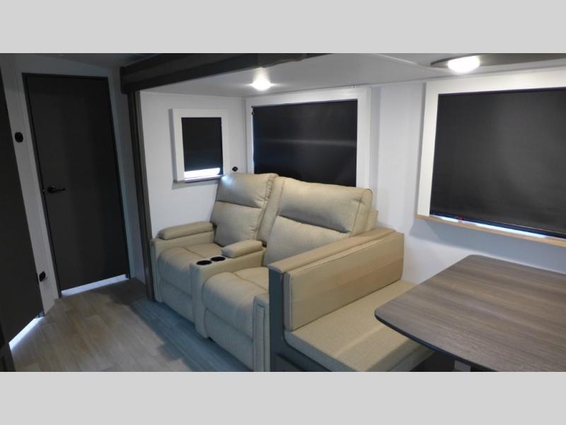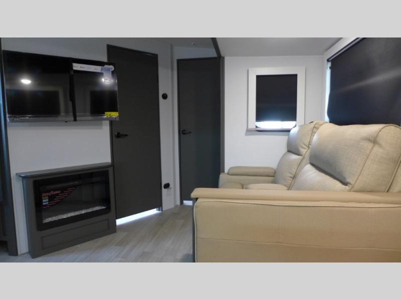 It won't be hard to feel right at home in this dual entry, front kitchen travel trailer! You will be impressed by the amount of counter space you have, along with a two kitchen pantries, a three burner range, and a 10 cu. ft. refrigerator. A Do-More dinette table and tri-fold sofa sit within a slide for more space, and the entertainment center with a fireplace is in great viewing for movie night. This model includes a dual entry bath with quick and easy access into the rear master bedroom, complete with a king bed slide out and a large wardrobe!