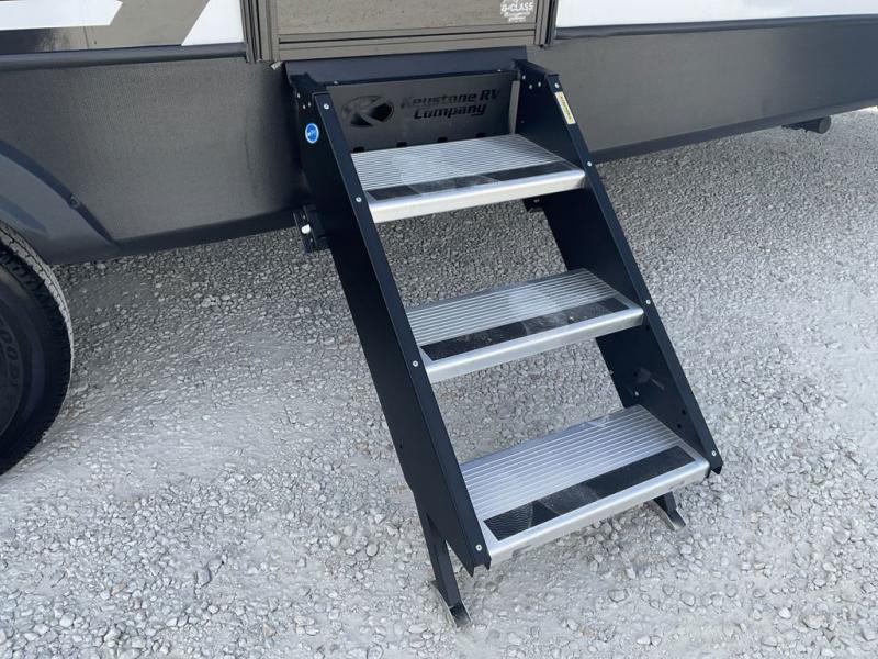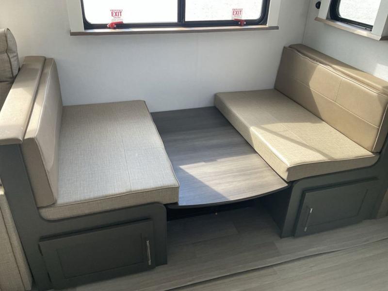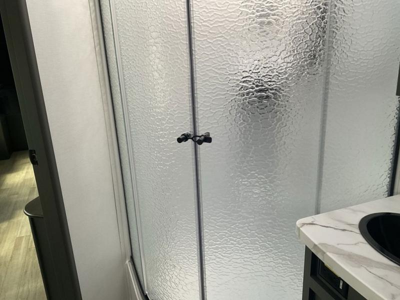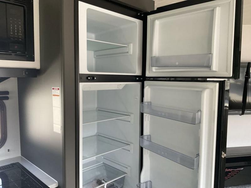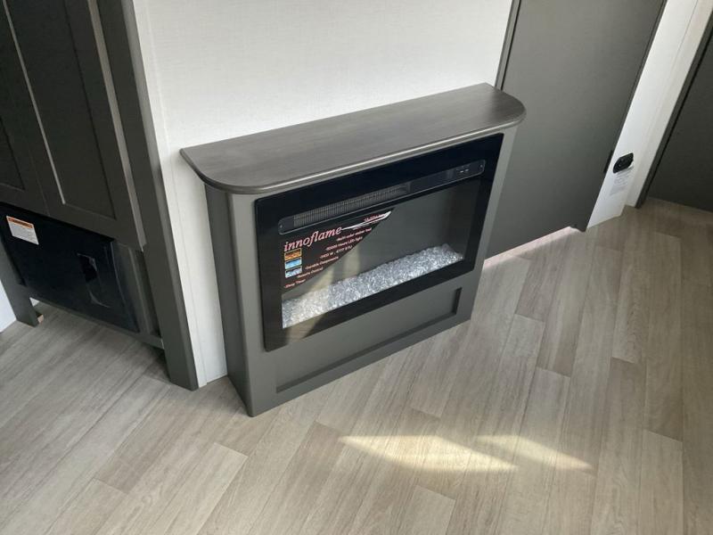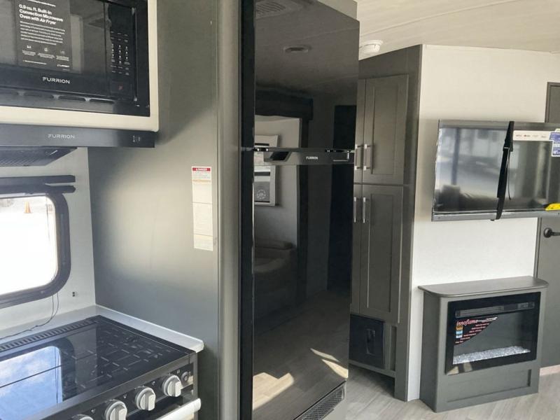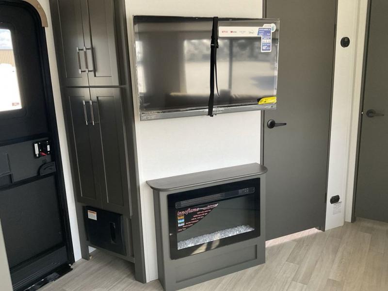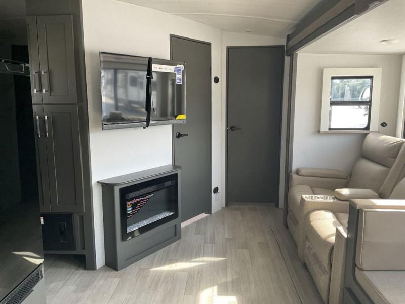 It won't be hard to feel right at home in this dual entry, front kitchen travel trailer! You will be impressed by the amount of counter space you have, along with a two kitchen pantries, a three burner range, and a 10 cu. ft. refrigerator. A Do-More dinette table and tri-fold sofa sit within a slide for more space, and the entertainment center with a fireplace is in great viewing for movie night. This model includes a dual entry bath with quick and easy access into the rear master bedroom, complete with a king bed slide out and a large wardrobe!