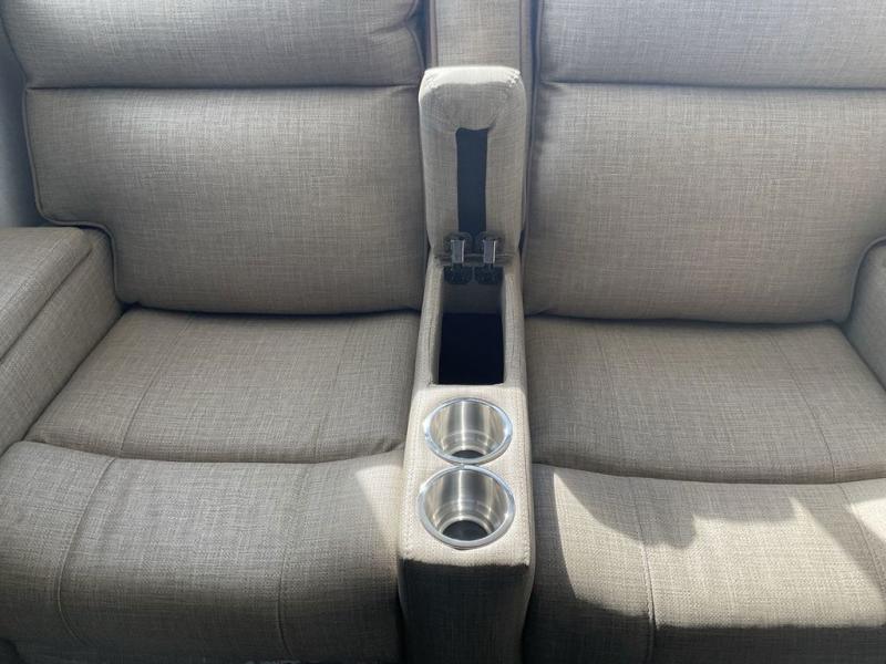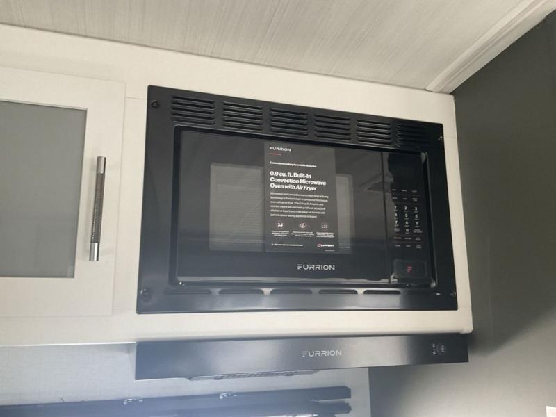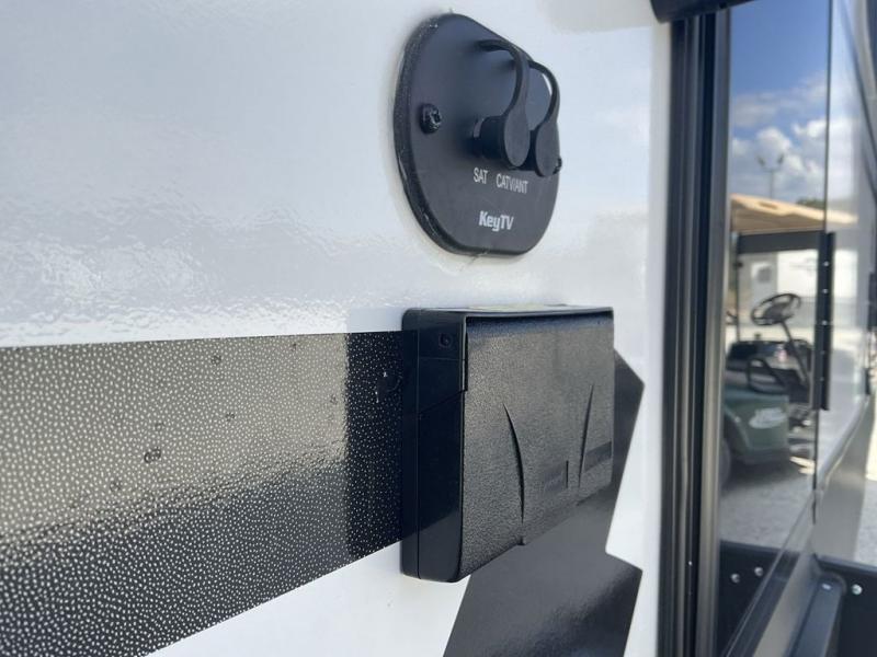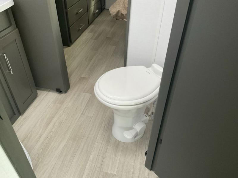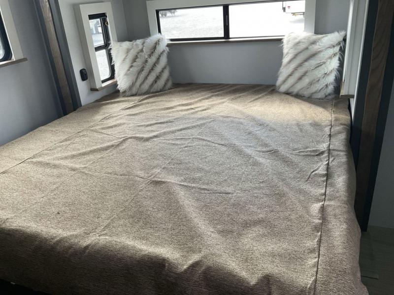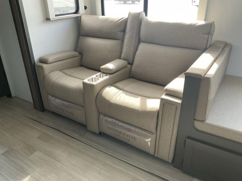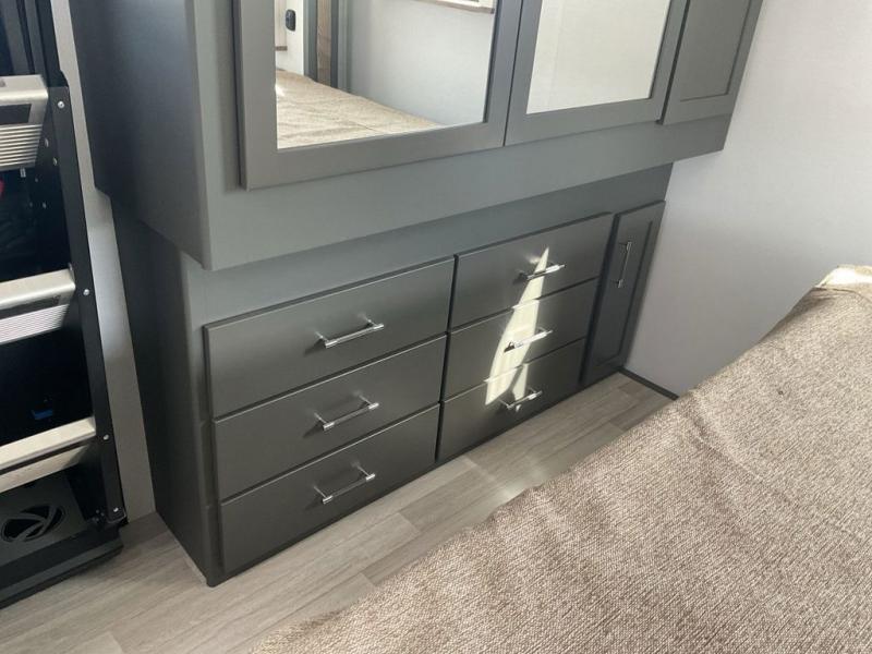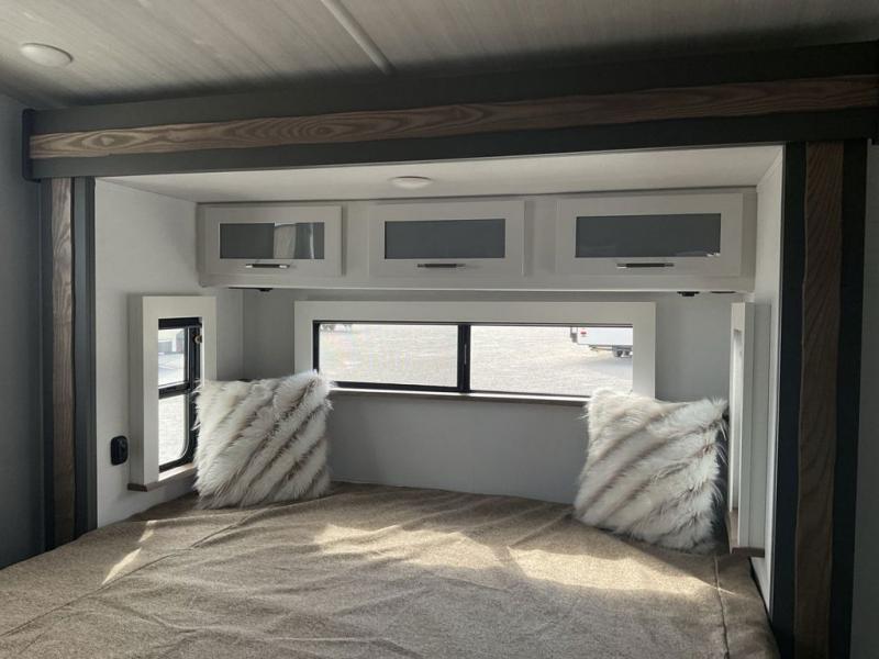 It won't be hard to feel right at home in this dual entry, front kitchen travel trailer! You will be impressed by the amount of counter space you have, along with a two kitchen pantries, a three burner range, and a 10 cu. ft. refrigerator. A Do-More dinette table and tri-fold sofa sit within a slide for more space, and the entertainment center with a fireplace is in great viewing for movie night. This model includes a dual entry bath with quick and easy access into the rear master bedroom, complete with a king bed slide out and a large wardrobe!