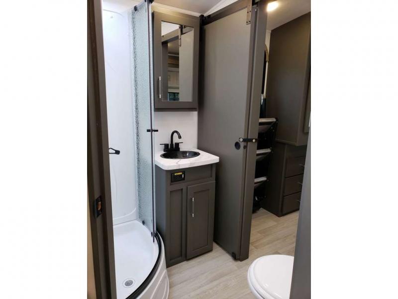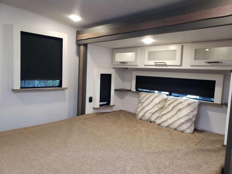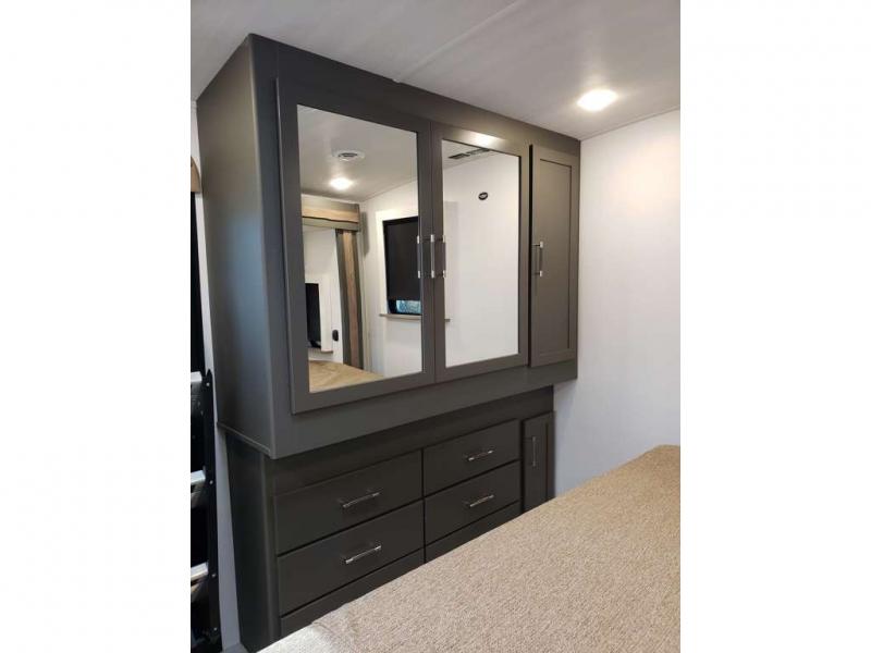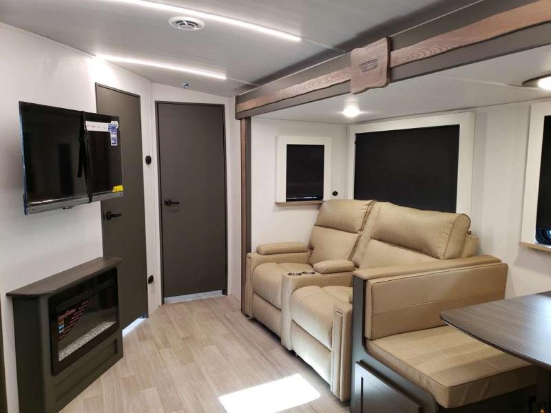 It won't be hard to feel right at home in this dual entry, front kitchen travel trailer! You will be impressed by the amount of counter space you have, along with a two kitchen pantries, a three burner range, and a 10 cu. ft. refrigerator. A Do-More dinette table and tri-fold sofa sit within a slide for more space, and the entertainment center with a fireplace is in great viewing for movie night. This model includes a dual entry bath with quick and easy access into the rear master bedroom, complete with a king bed slide out and a large wardrobe!
