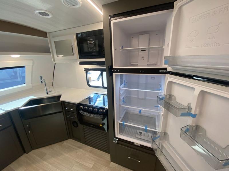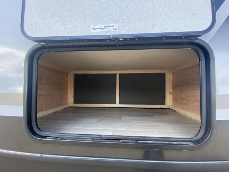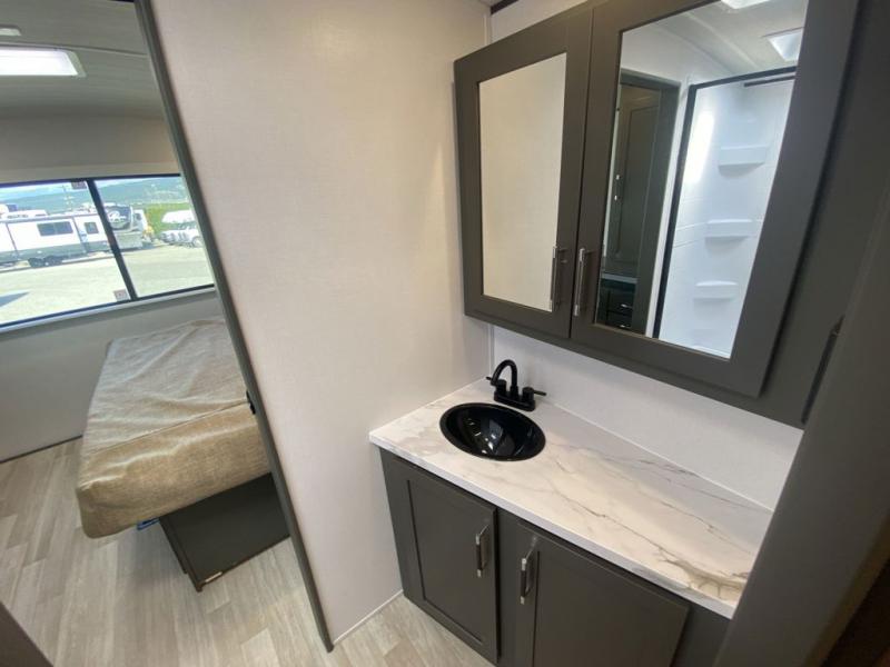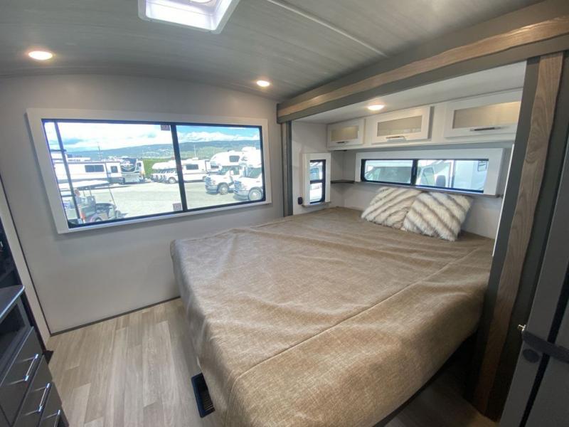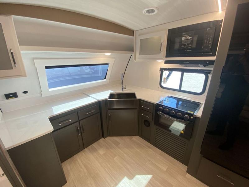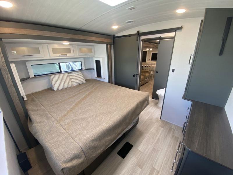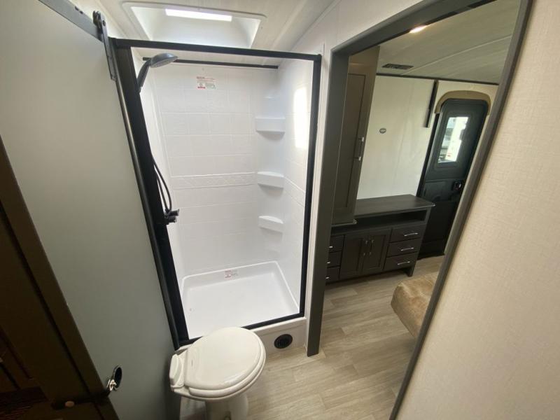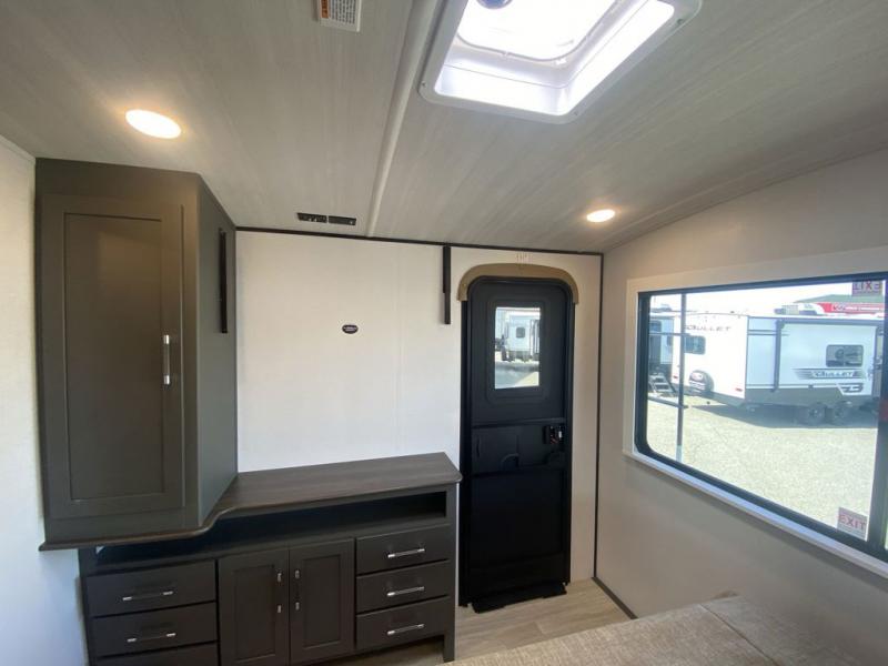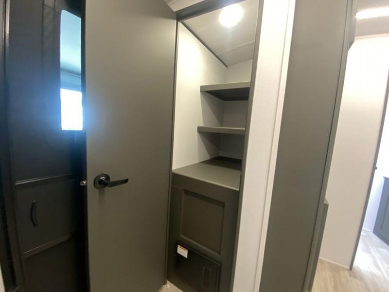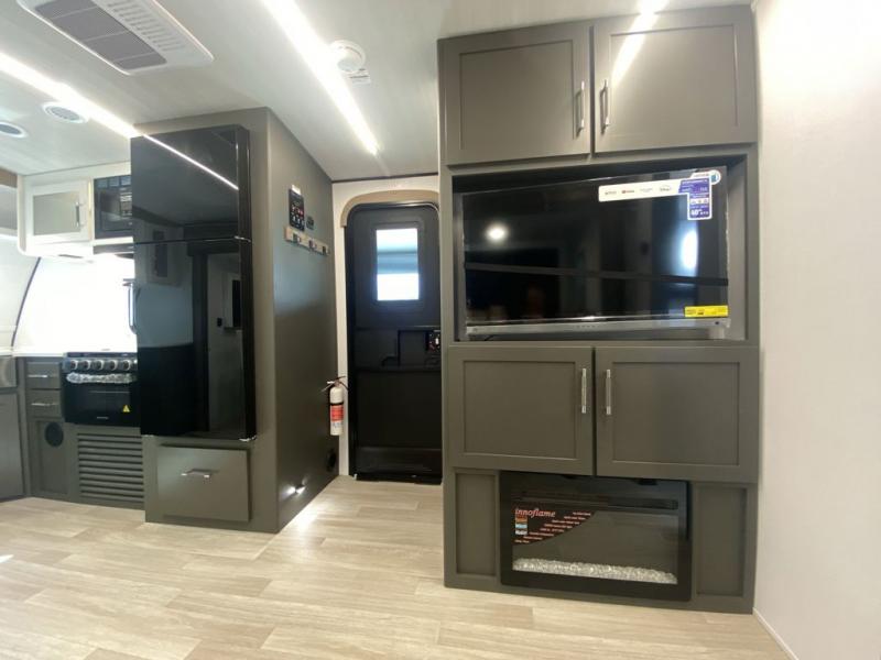 It won't be hard to feel right at home in this dual entry, front kitchen travel trailer! You will be impressed by the amount of counter space you have, along with a two kitchen pantries, a three burner range, and a 10 cu. ft. refrigerator. A Do-More dinette table and tri-fold sofa sit within a slide for more space, and the entertainment center with a fireplace is in great viewing for movie night. This model includes a dual entry bath with quick and easy access into the rear master bedroom, complete with a king bed slide out and a large wardrobe!