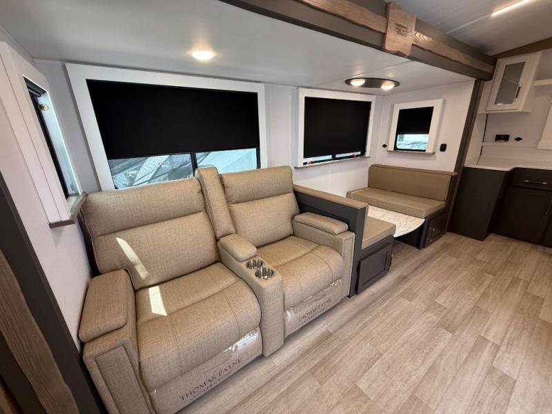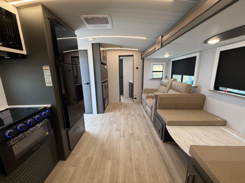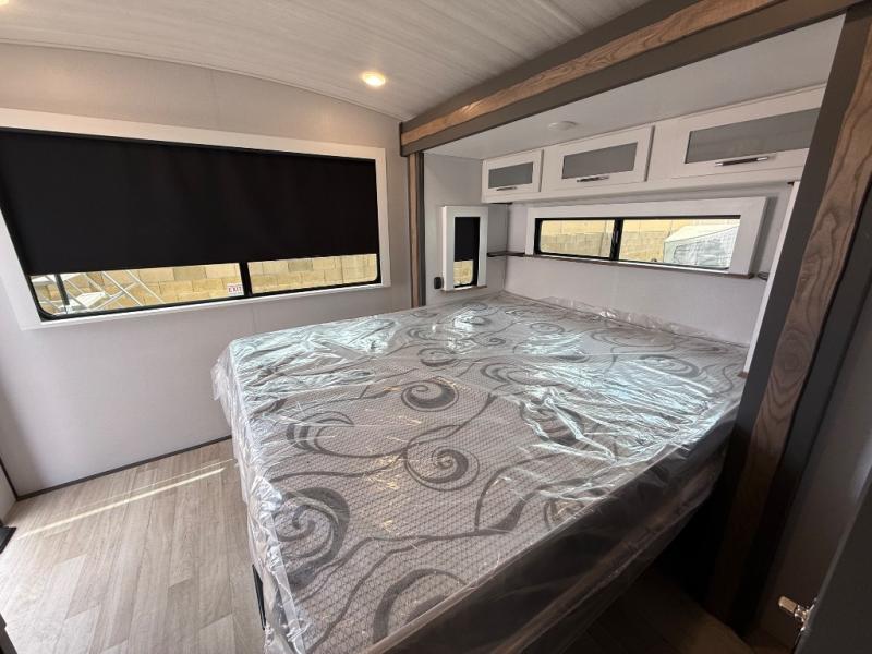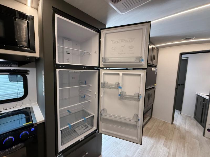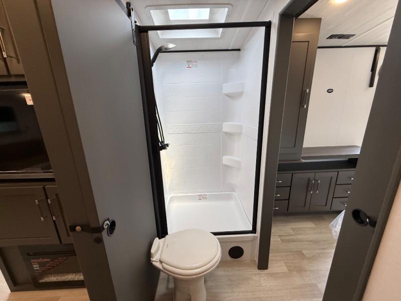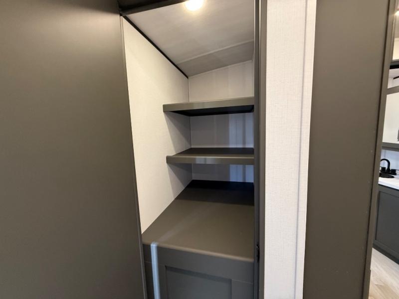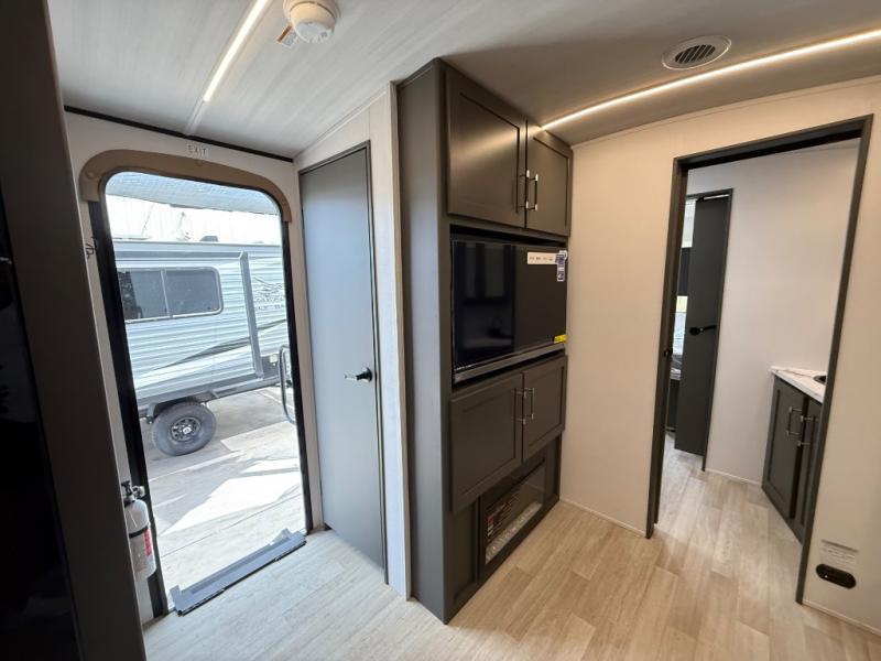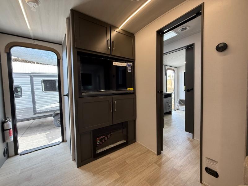 It won't be hard to feel right at home in this dual entry, front kitchen travel trailer! You will be impressed by the amount of counter space you have, along with a two kitchen pantries, a three burner range, and a 10 cu. ft. refrigerator. A Do-More dinette table and tri-fold sofa sit within a slide for more space, and the entertainment center with a fireplace is in great viewing for movie night. This model includes a dual entry bath with quick and easy access into the rear master bedroom, complete with a king bed slide out and a large wardrobe!