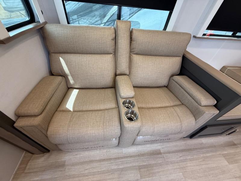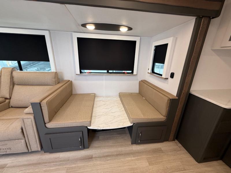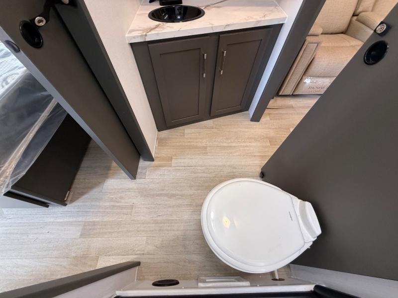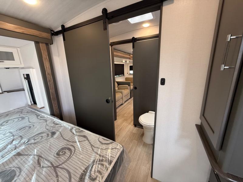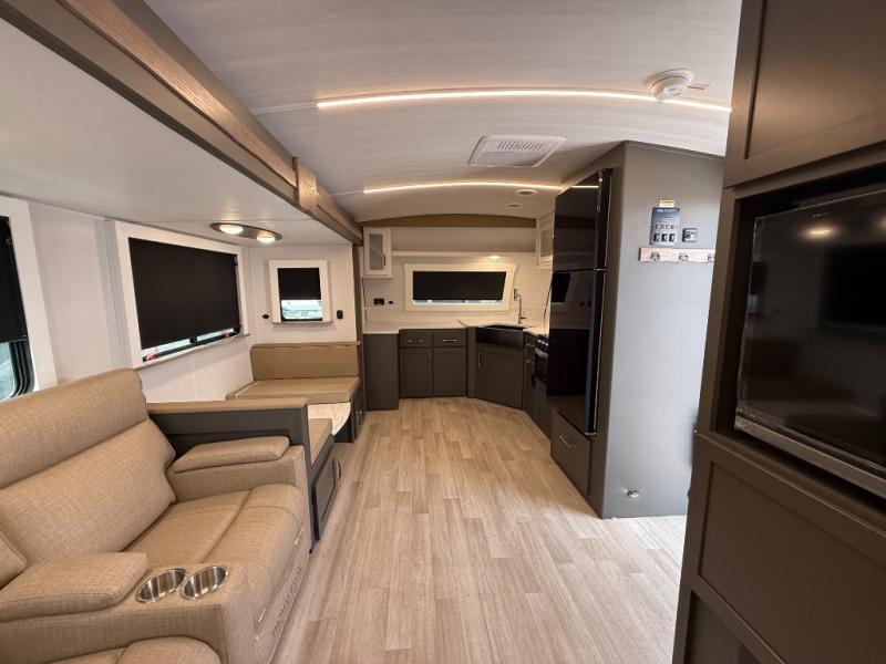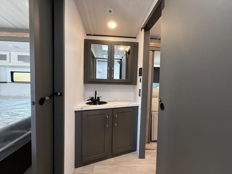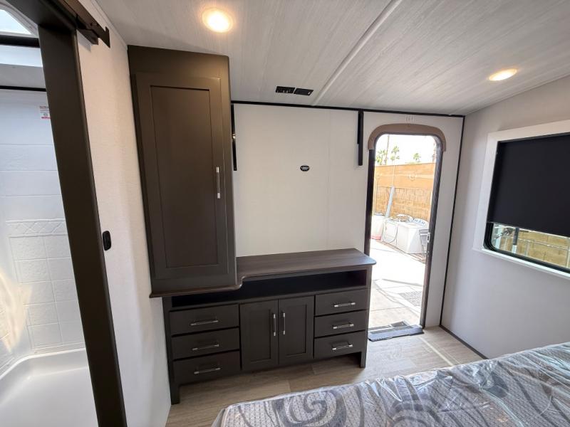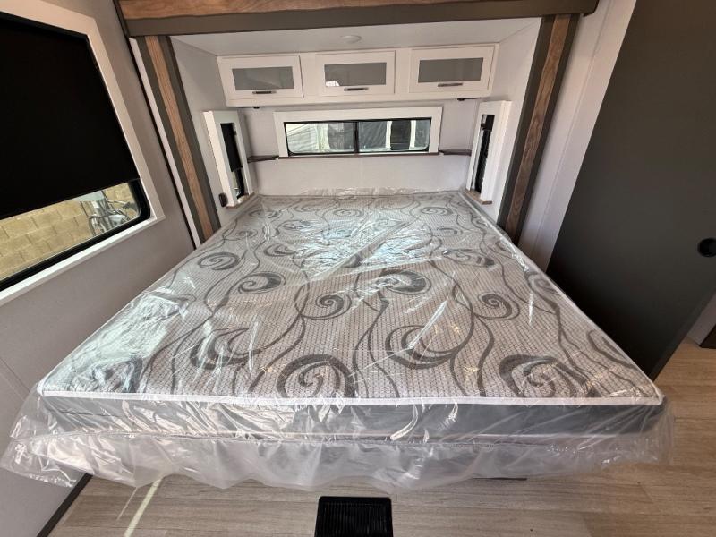 It won't be hard to feel right at home in this dual entry, front kitchen travel trailer! You will be impressed by the amount of counter space you have, along with a two kitchen pantries, a three burner range, and a 10 cu. ft. refrigerator. A Do-More dinette table and tri-fold sofa sit within a slide for more space, and the entertainment center with a fireplace is in great viewing for movie night. This model includes a dual entry bath with quick and easy access into the rear master bedroom, complete with a king bed slide out and a large wardrobe!