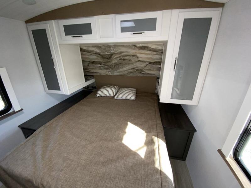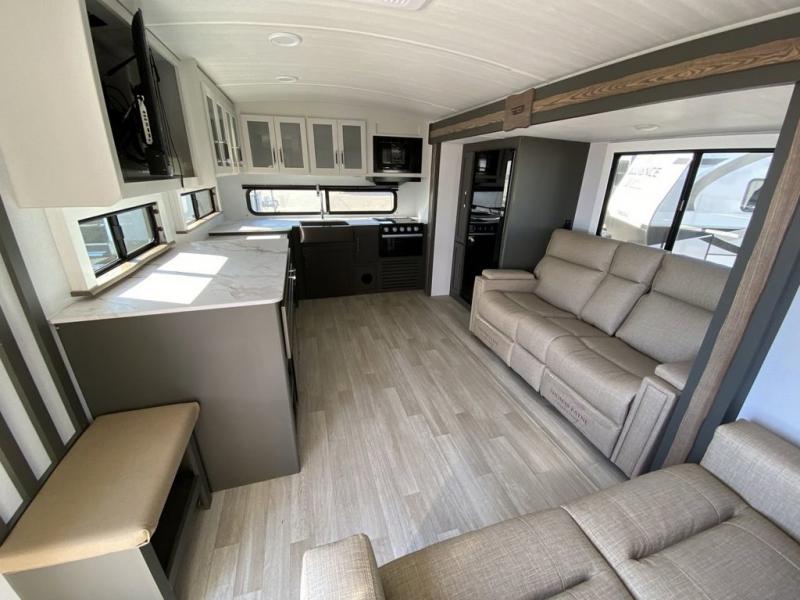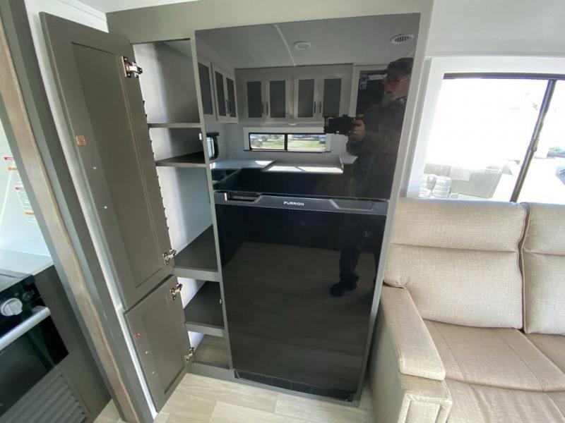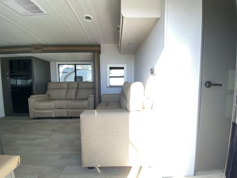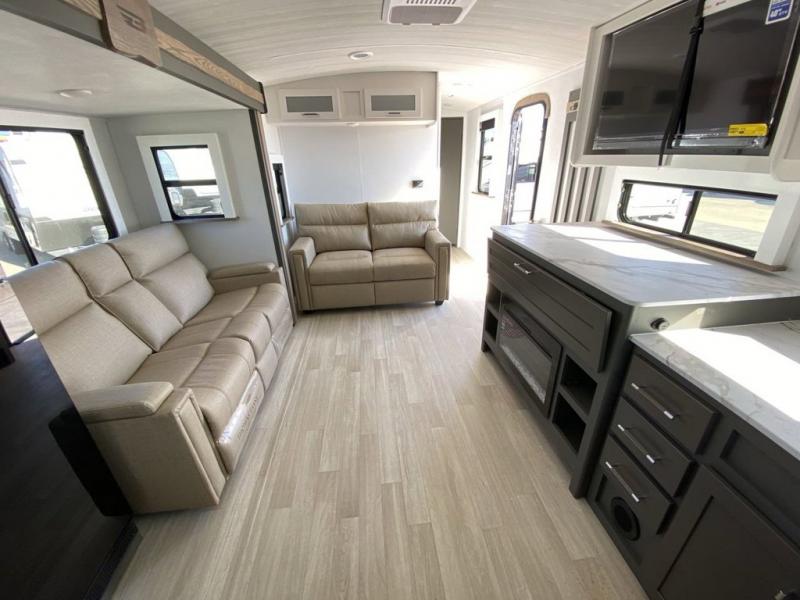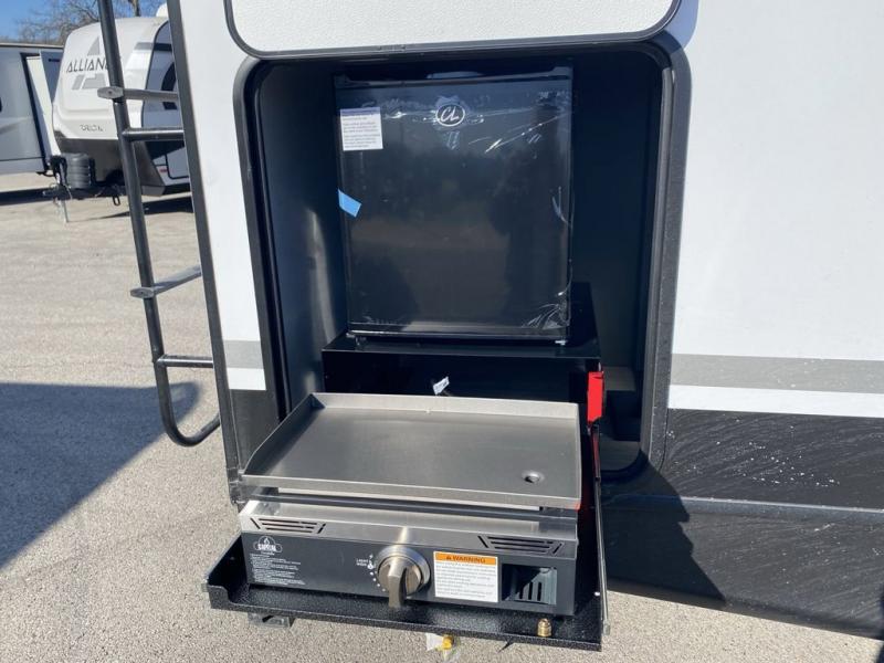 You'll enjoy the added space in this travel trailer thanks to the large slide out that houses the theater seating, pantry, and 12V refrigerator. And the 12V TV is in direct view so you can watch movies in the evenings. If you have guests staying over, they can sleep on the tri-fold sofa, while you take the queen bed in the front private bedroom. A rear kitchen includes extended counter space to prep meals, or you can use the outdoor kitchen with a mini fridge and griddle. The pull-out dinette table provides a place to dine together, or you can sit outdoors under the 19' awning. There is even an exterior TV here for added convenience!