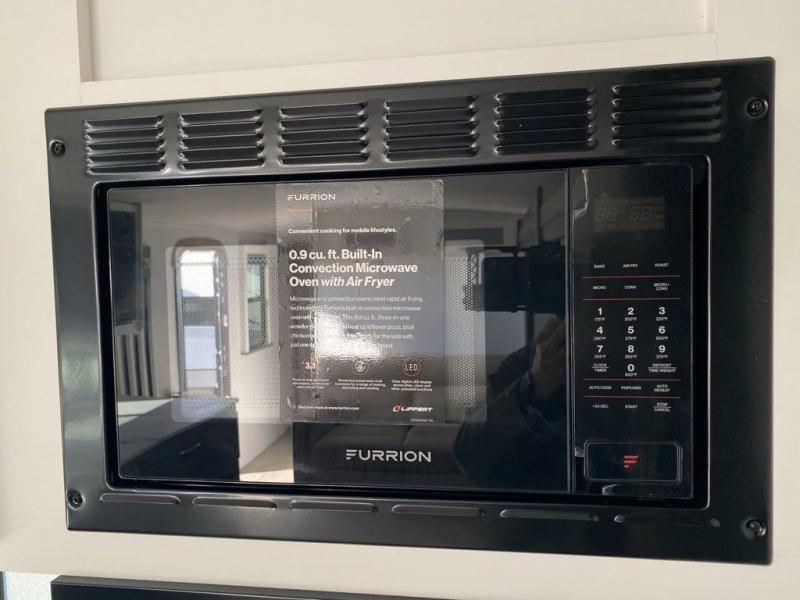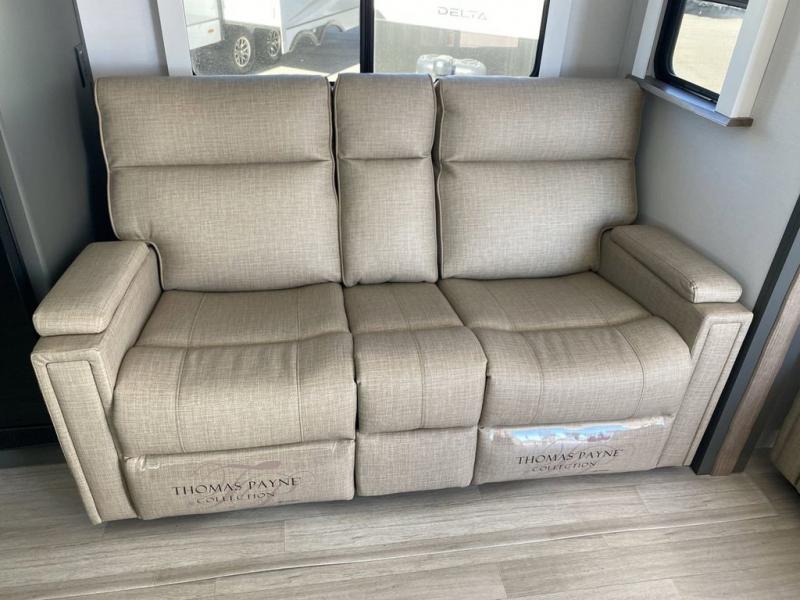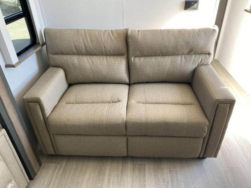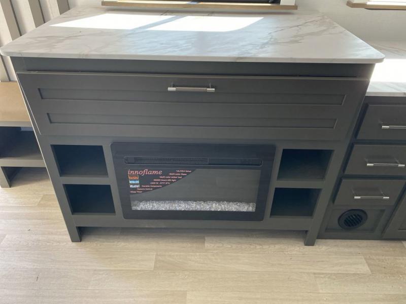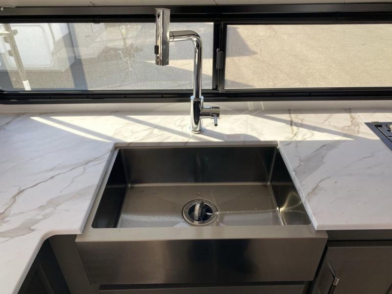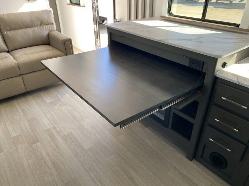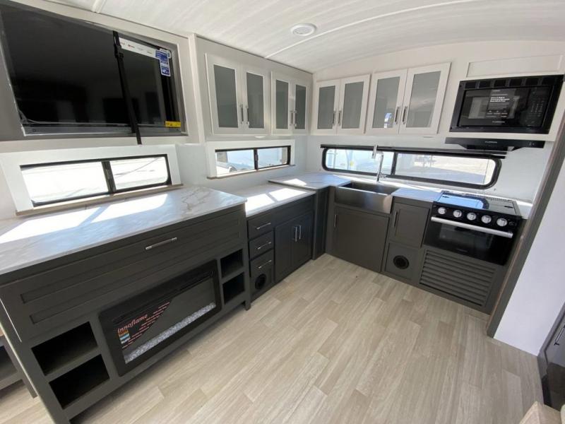 You'll enjoy the added space in this travel trailer thanks to the large slide out that houses the theater seating, pantry, and 12V refrigerator. And the 12V TV is in direct view so you can watch movies in the evenings. If you have guests staying over, they can sleep on the tri-fold sofa, while you take the queen bed in the front private bedroom. A rear kitchen includes extended counter space to prep meals, or you can use the outdoor kitchen with a mini fridge and griddle. The pull-out dinette table provides a place to dine together, or you can sit outdoors under the 19' awning. There is even an exterior TV here for added convenience!