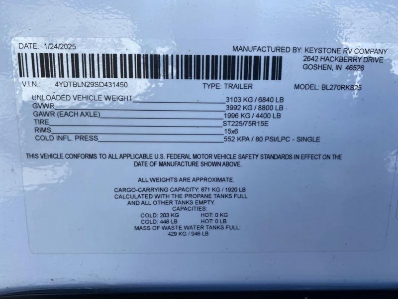 New 2025 Keystone RV Bullet 270RKS Travel Trailer