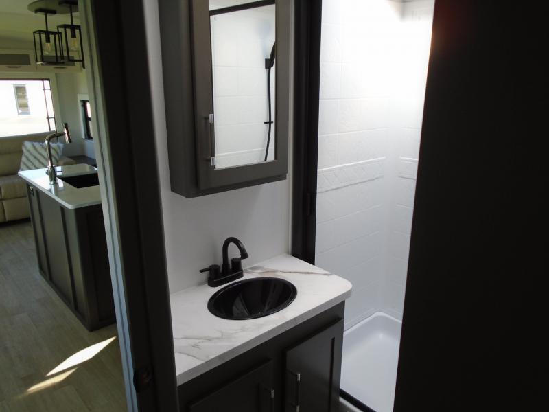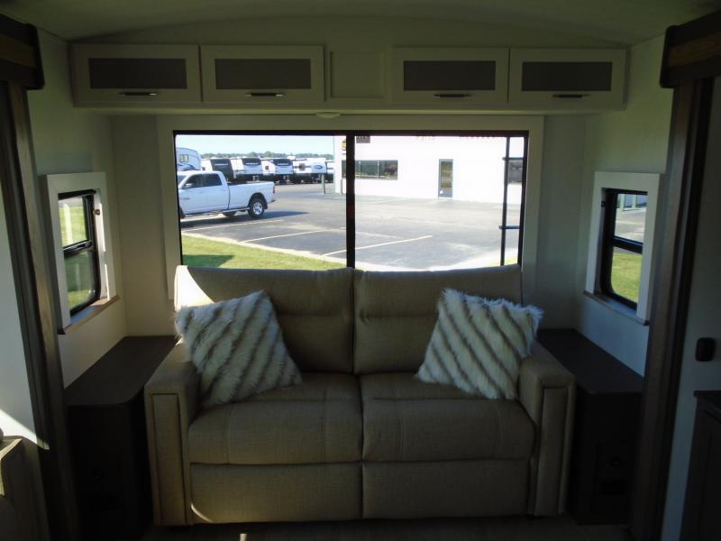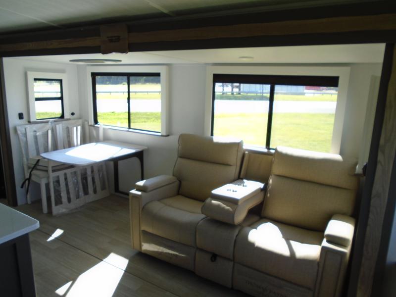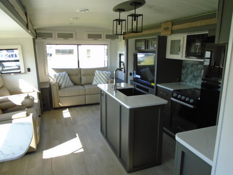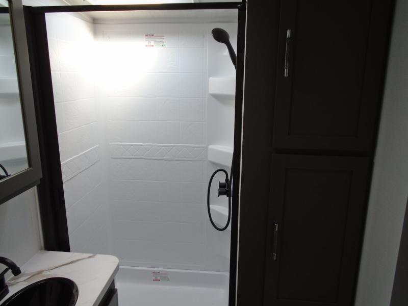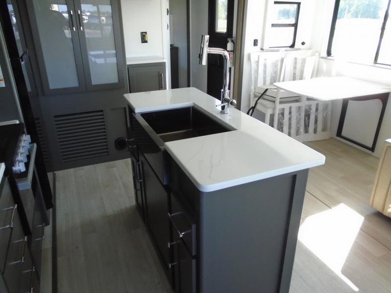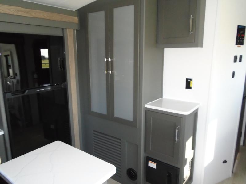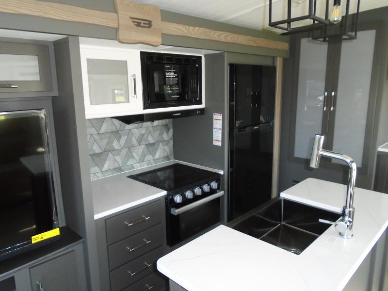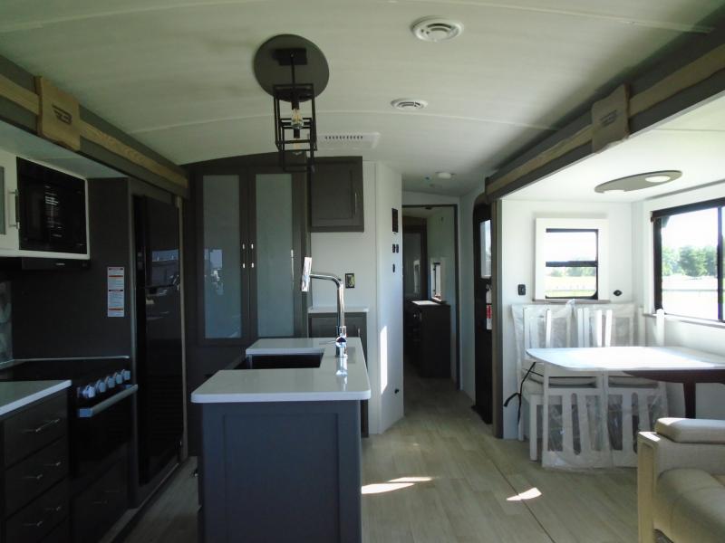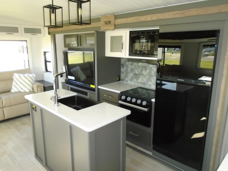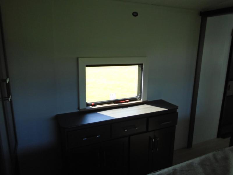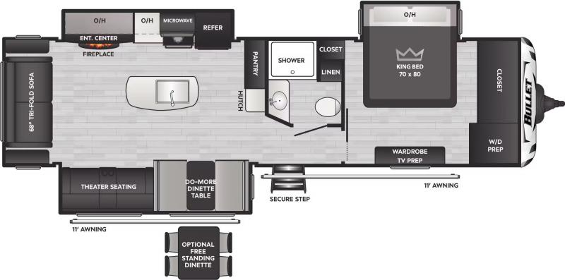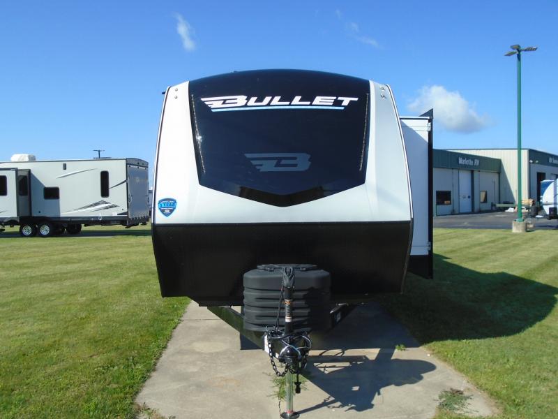 You'll be camping in style with this trailer in tow. You will wake up each morning on a king bed slide out, and there is a closet up front to easily get dressed. A wardrobe with TV prep is also found in the bedroom, along with washer/dryer prep to make wash day easier than ever. If you had guests stay over, they'll be waking up on the tri-fold sofa in the rear living area. Once everyone is ready for the day, you can make breakfast on the three burner cooktop or in the microwave oven, and there is a 10 cu. ft. refrigerator where milk and eggs can go back in. This Bullet kitchen also includes a kitchen island, a pantry, plus a hutch for ample storage space!