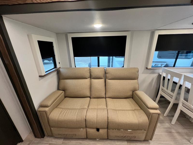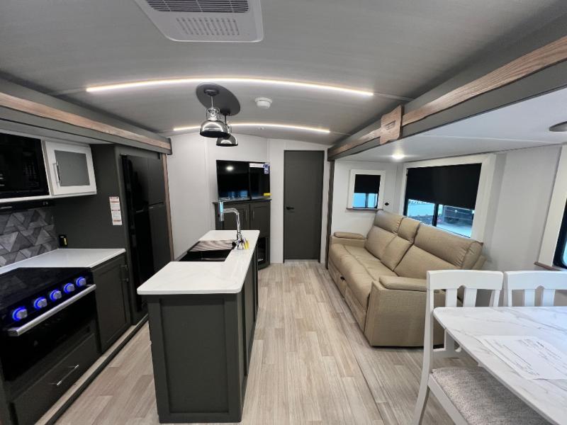 This travel trailer is one the whole gang will love! There is a rear private bunkhouse suite for your guests or the kids, plus a front master bedroom for you. The bunkhouse includes a tri-fold sofa with a flip-up bunk across from a second bunk, plus there is a half bath with its own exterior entry door! The full walk-through bath leads into the front bedroom where you'll find a queen bed, dual wardrobes and a laundry chute so you can throw clothes directly into the pass-through. A super slide in the combined living area and kitchen will provide ample space to move about, and you will find comfy seating on the tri-fold sofa and Do-More dinette table. There is even a fireplace and an entertainment center!