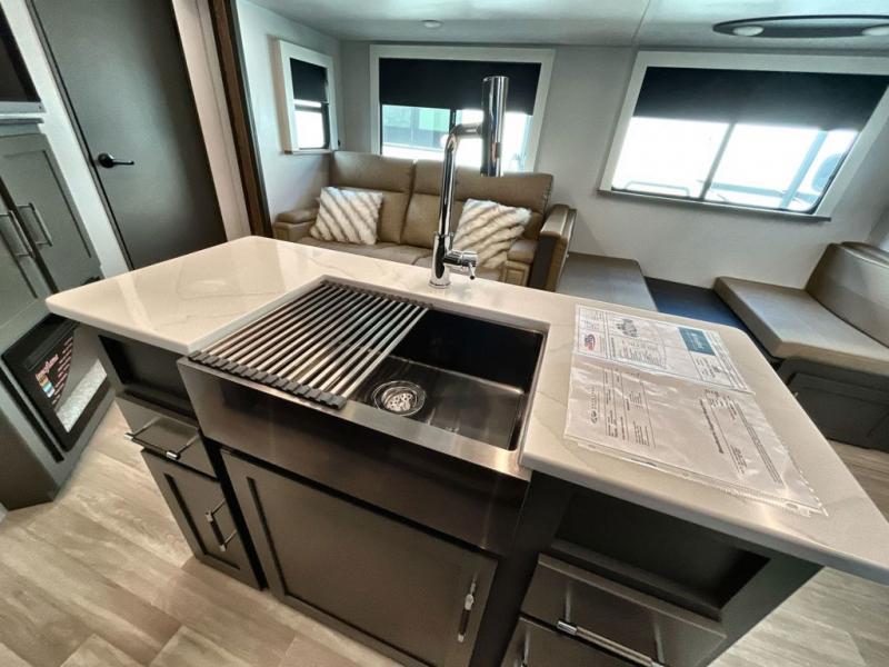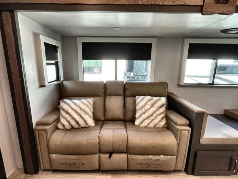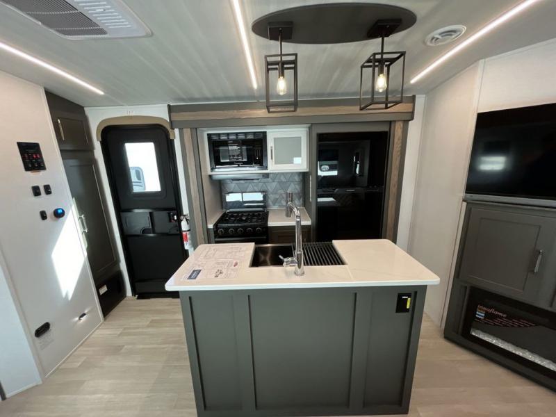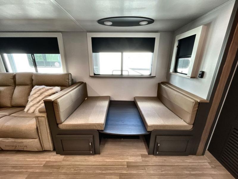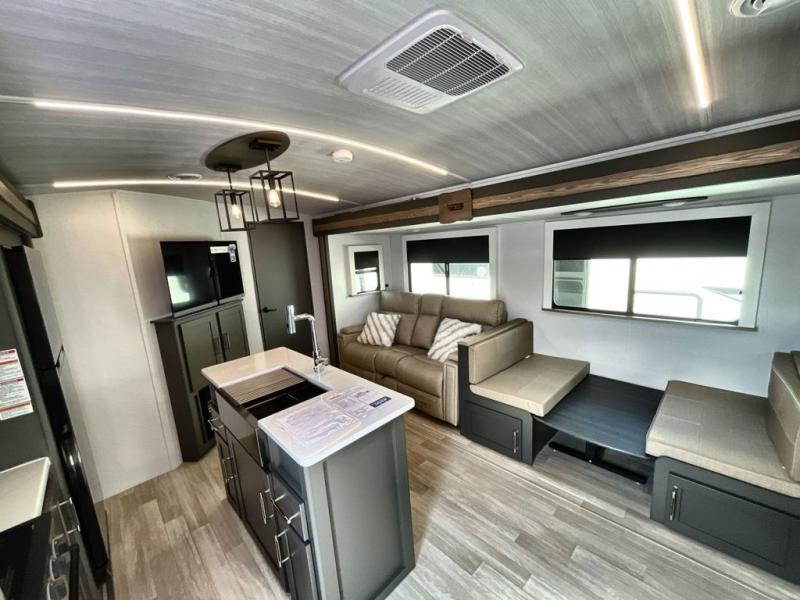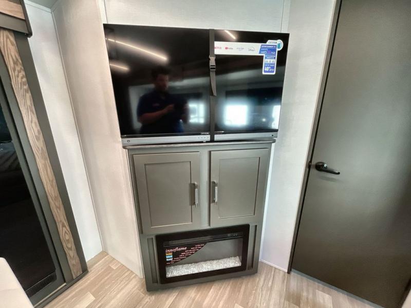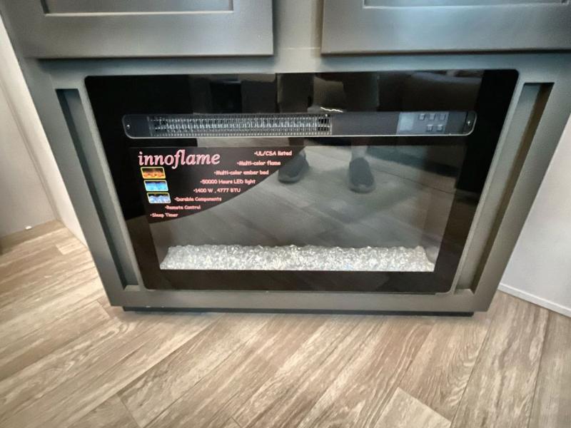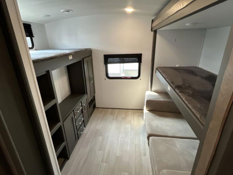 This travel trailer is one the whole gang will love! There is a rear private bunkhouse suite for your guests or the kids, plus a front master bedroom for you. The bunkhouse includes a tri-fold sofa with a flip-up bunk across from a second bunk, plus there is a half bath with its own exterior entry door! The full walk-through bath leads into the front bedroom where you'll find a queen bed, dual wardrobes and a laundry chute so you can throw clothes directly into the pass-through. A super slide in the combined living area and kitchen will provide ample space to move about, and you will find comfy seating on the tri-fold sofa and Do-More dinette table. There is even a fireplace and an entertainment center!