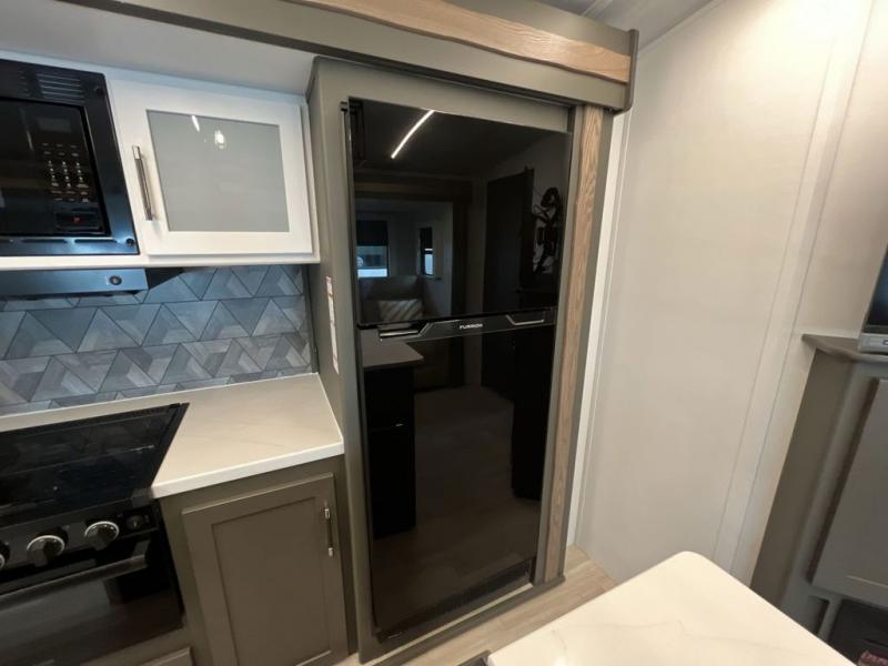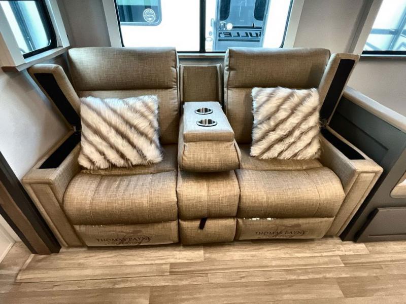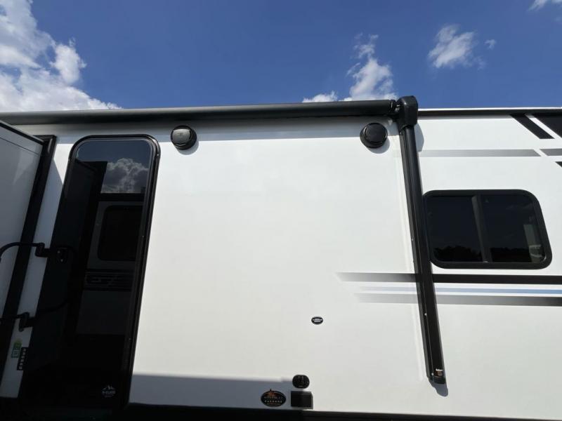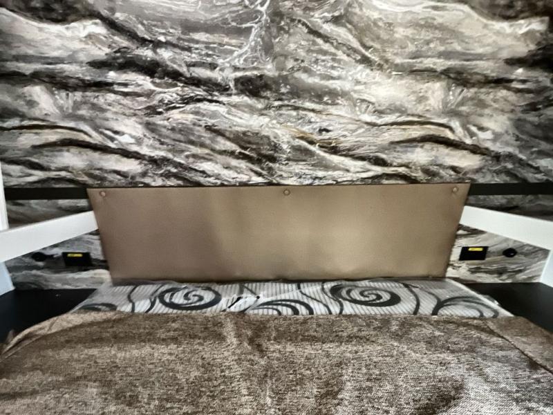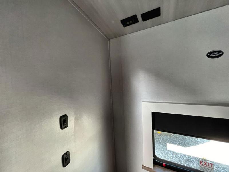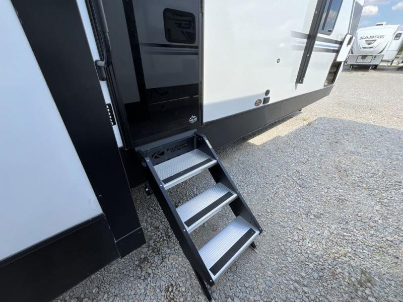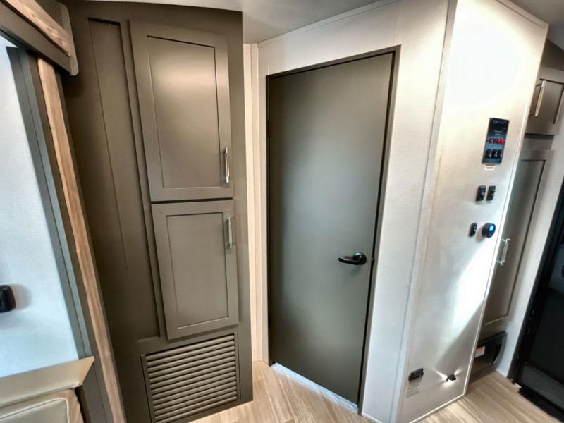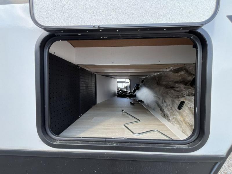 This travel trailer is one the whole gang will love! There is a rear private bunkhouse suite for your guests or the kids, plus a front master bedroom for you. The bunkhouse includes a tri-fold sofa with a flip-up bunk across from a second bunk, plus there is a half bath with its own exterior entry door! The full walk-through bath leads into the front bedroom where you'll find a queen bed, dual wardrobes and a laundry chute so you can throw clothes directly into the pass-through. A super slide in the combined living area and kitchen will provide ample space to move about, and you will find comfy seating on the tri-fold sofa and Do-More dinette table. There is even a fireplace and an entertainment center!