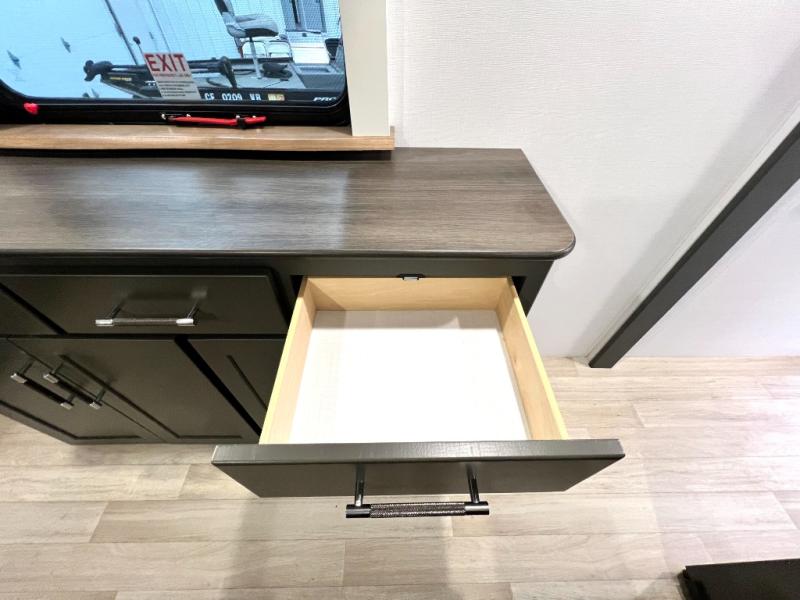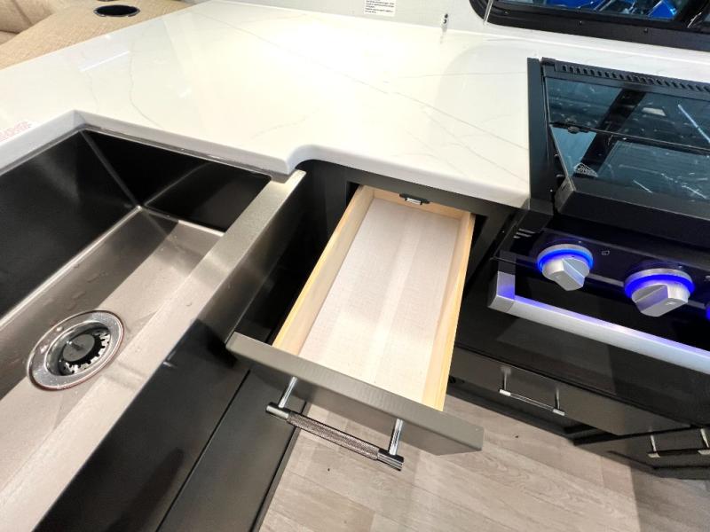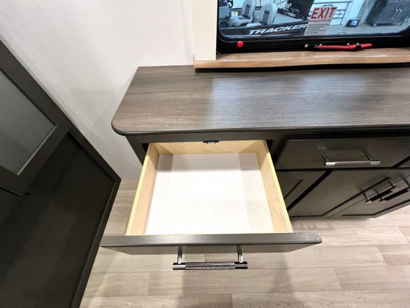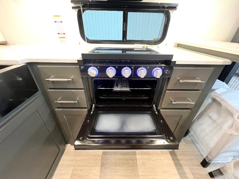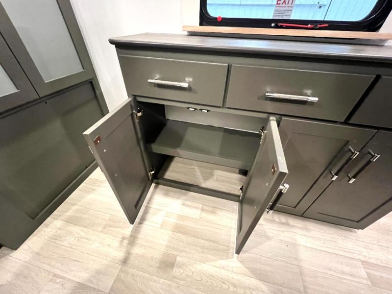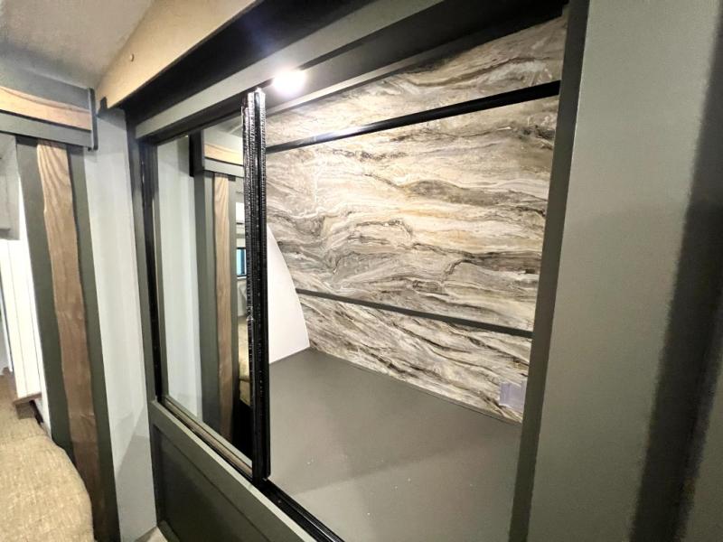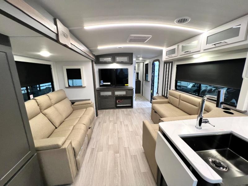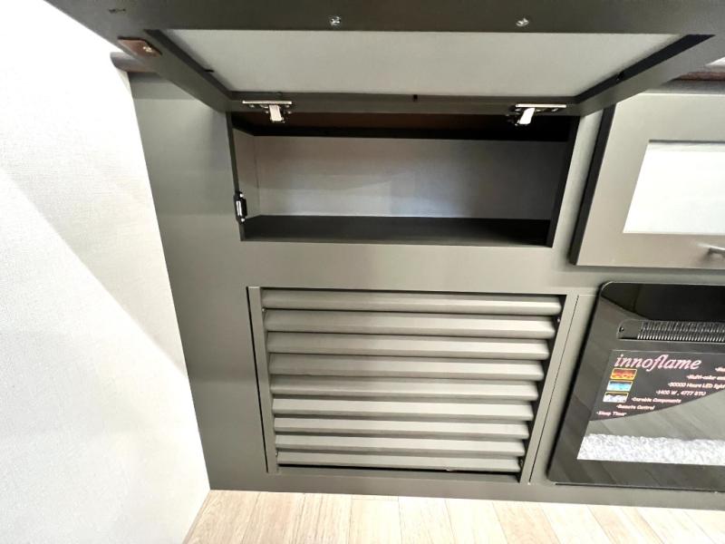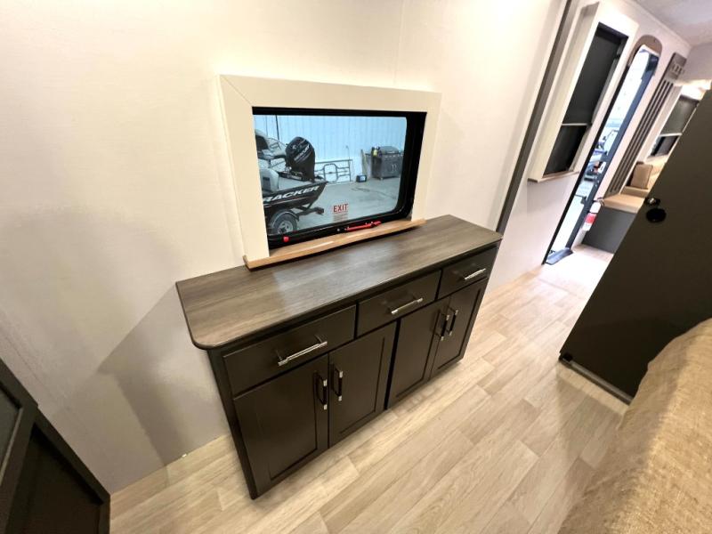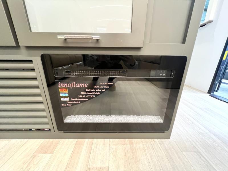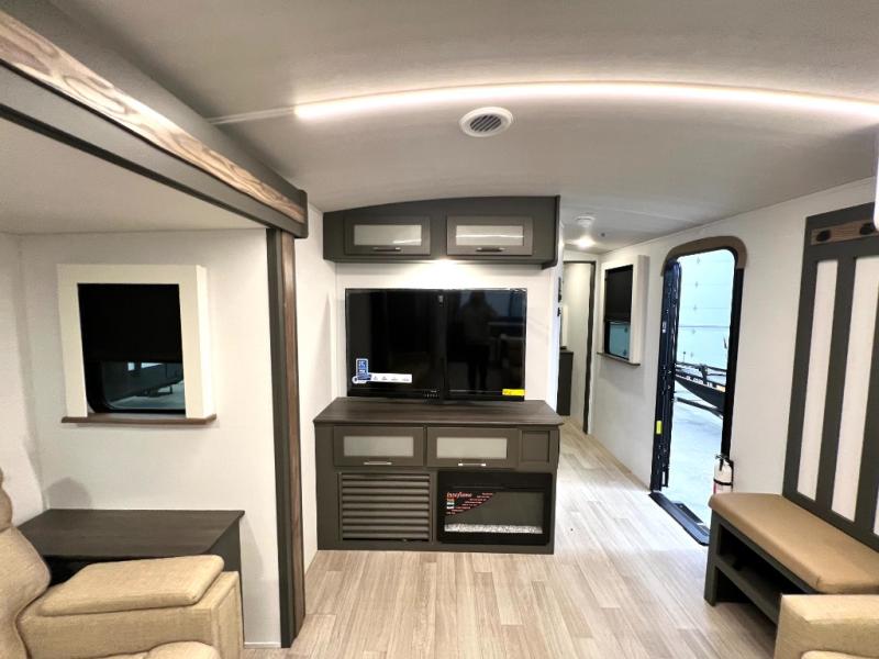 If you're looking for the perfect travel trailer to entertain guests, this is the one! The rear kitchen features a bartop with stools and a rear balcony where you can enjoy great outdoor views. The flip-up counter extension will provide the chef with more space to prep food, and there is a spacious refrigerator and pantry for food storage. Your crew can get comfy on the theater seating or L-shaped section sofa, and there is a 50" Smart TV and fireplace to make it a movie night! A full bath onboard lets you clean up after a day outdoors, and the front private bedroom with a king bed slide provides all the comfort you need. You'll also find two closets, washer and dryer prep, and a dresser to keep your things neat and organized.