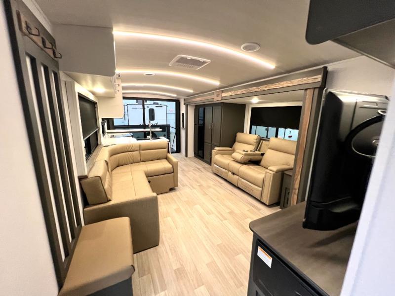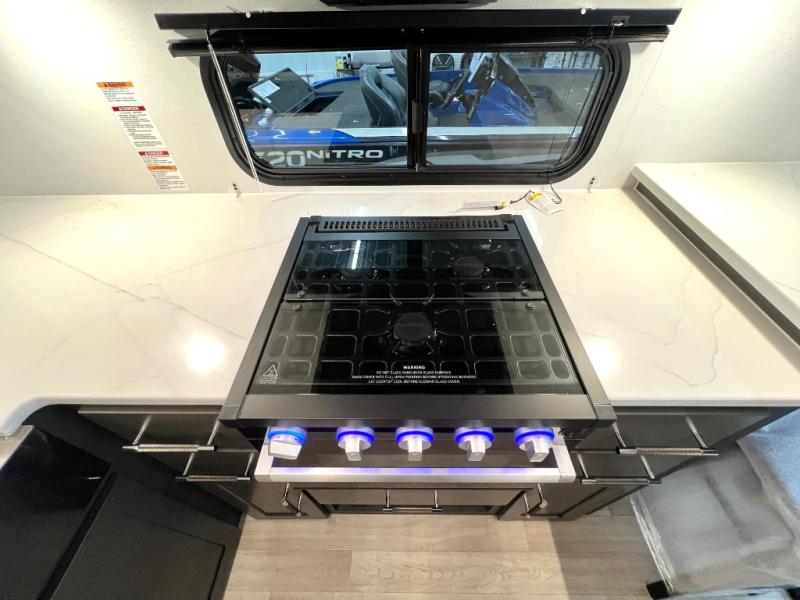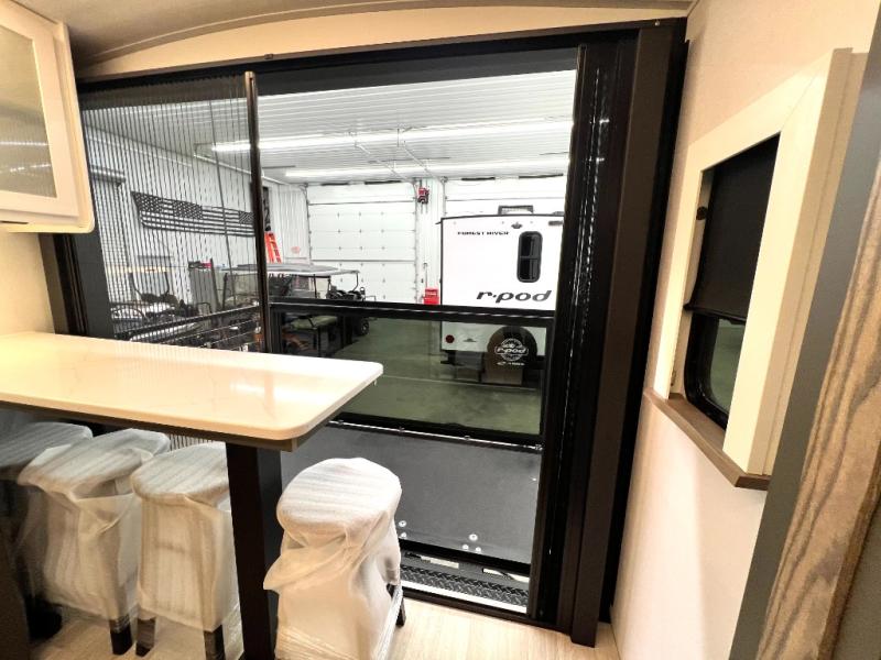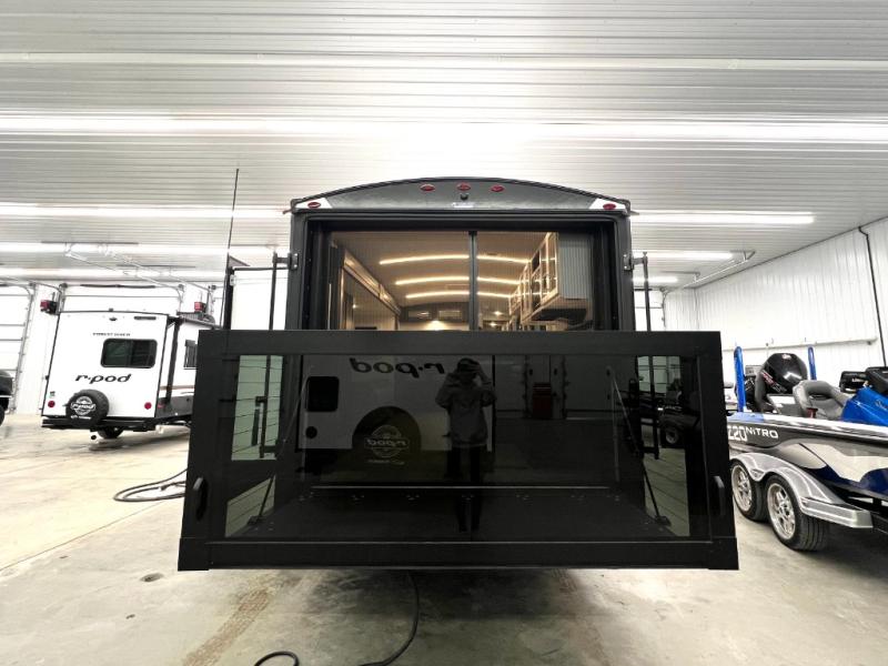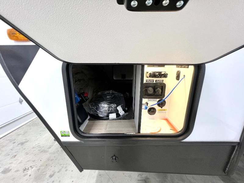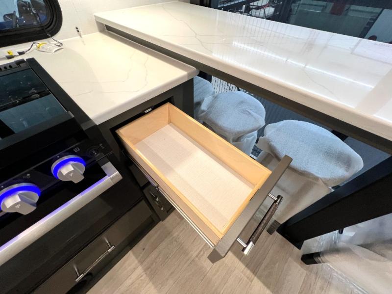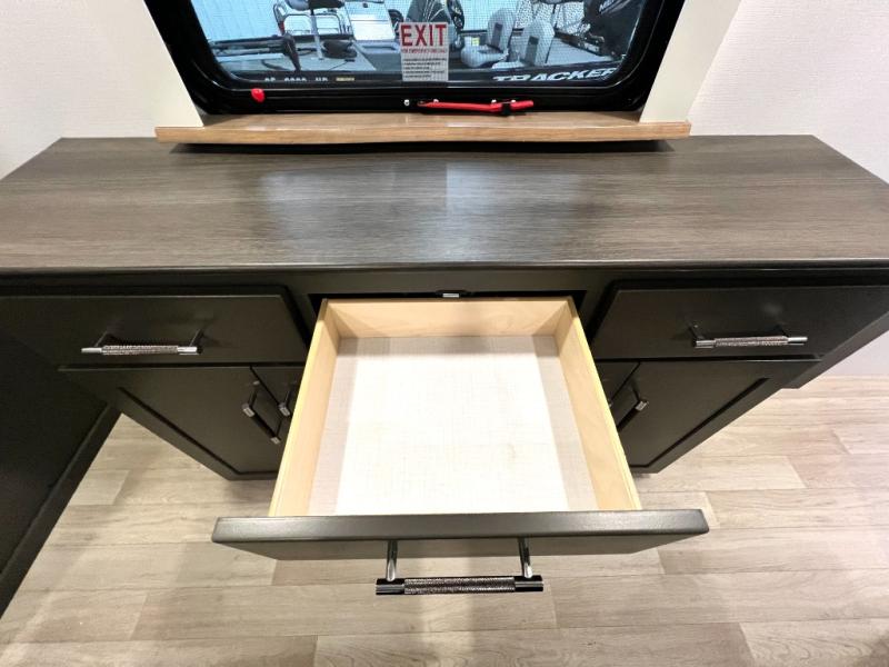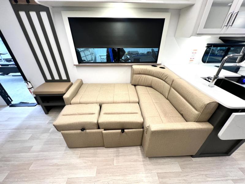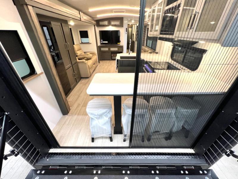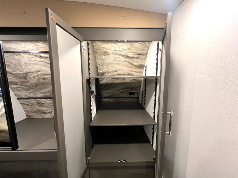If you're looking for the perfect travel trailer to entertain guests, this is the one! The rear kitchen features a bartop with stools and a rear balcony where you can enjoy great outdoor views. The flip-up counter extension will provide the chef with more space to prep food, and there is a spacious refrigerator and pantry for food storage. Your crew can get comfy on the theater seating or L-shaped section sofa, and there is a 50" Smart TV and fireplace to make it a movie night! A full bath onboard lets you clean up after a day outdoors, and the front private bedroom with a king bed slide provides all the comfort you need. You'll also find two closets, washer and dryer prep, and a dresser to keep your things neat and organized.