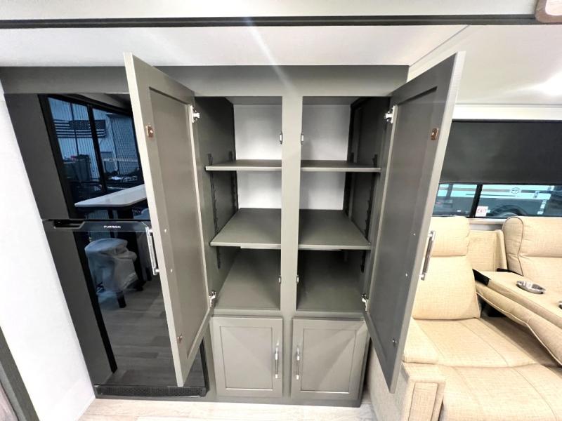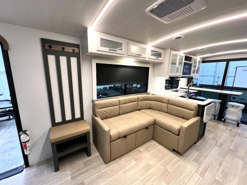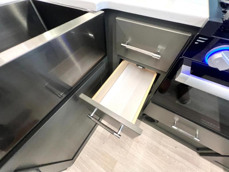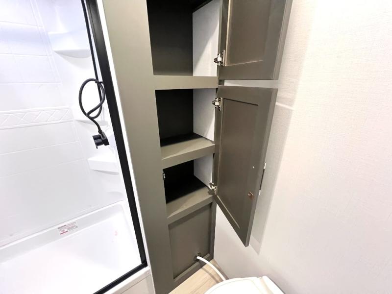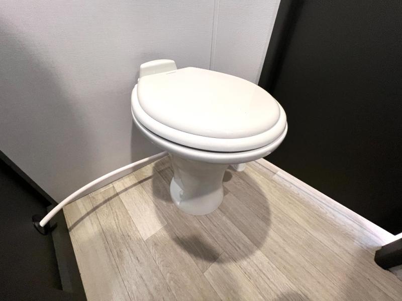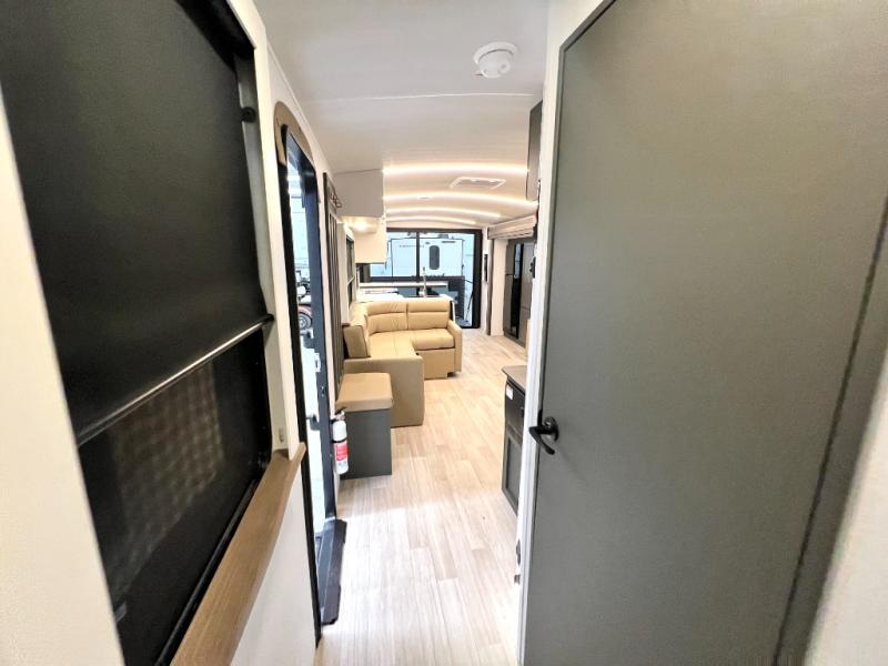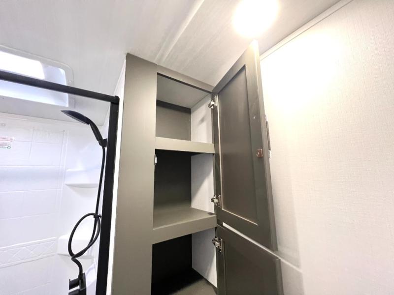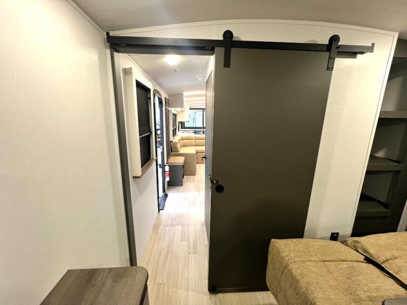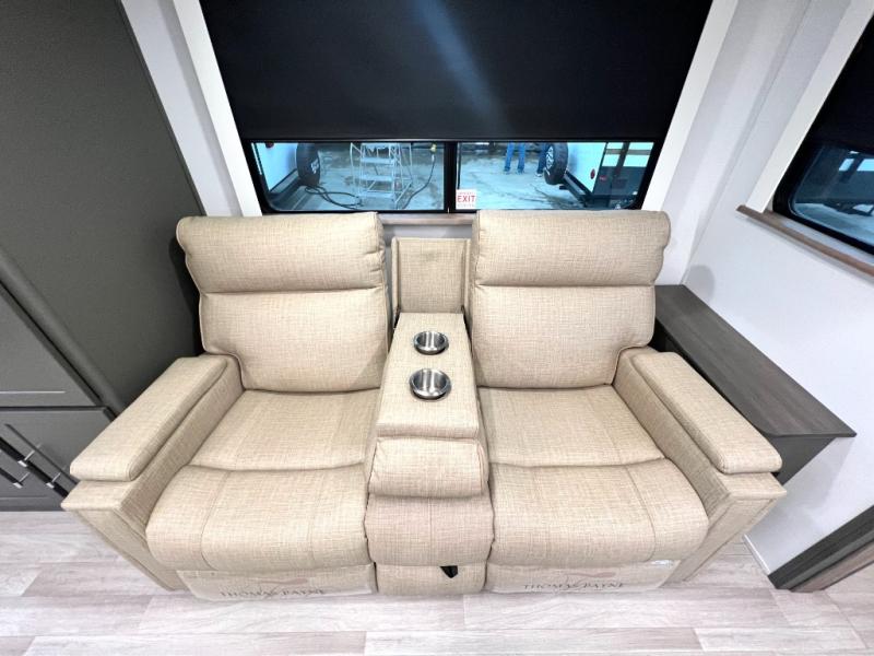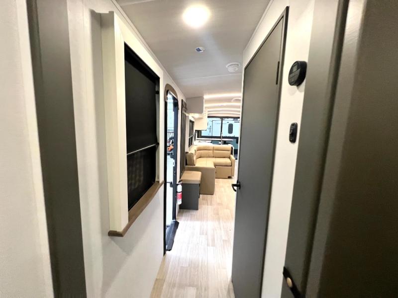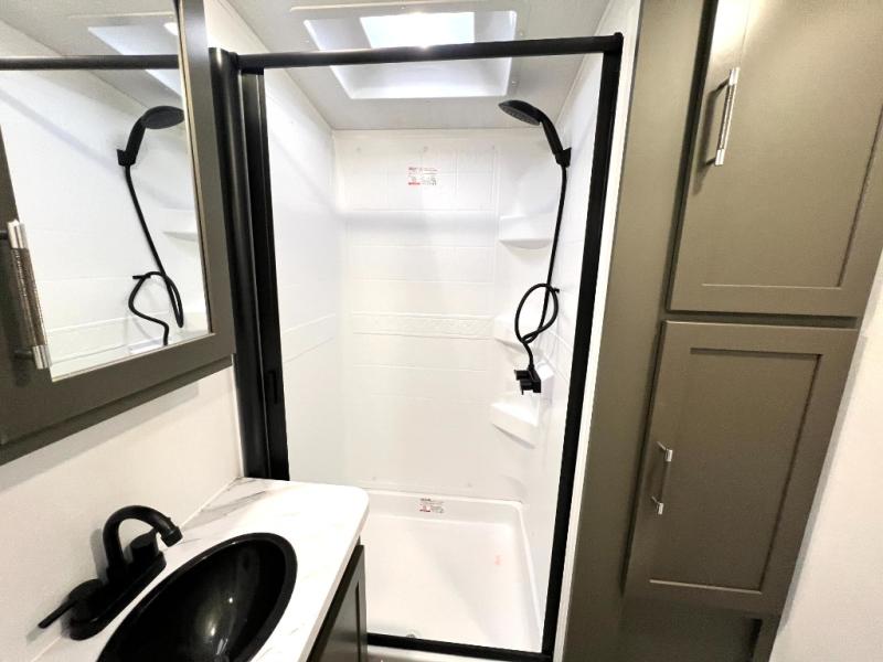 If you're looking for the perfect travel trailer to entertain guests, this is the one! The rear kitchen features a bartop with stools and a rear balcony where you can enjoy great outdoor views. The flip-up counter extension will provide the chef with more space to prep food, and there is a spacious refrigerator and pantry for food storage. Your crew can get comfy on the theater seating or L-shaped section sofa, and there is a 50" Smart TV and fireplace to make it a movie night! A full bath onboard lets you clean up after a day outdoors, and the front private bedroom with a king bed slide provides all the comfort you need. You'll also find two closets, washer and dryer prep, and a dresser to keep your things neat and organized.