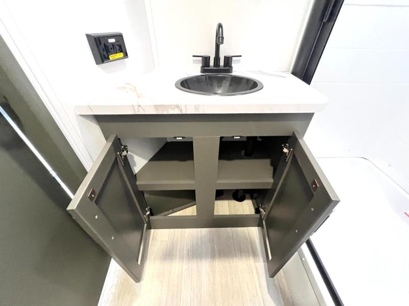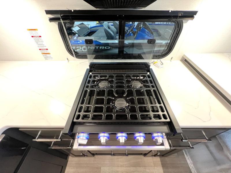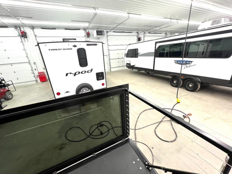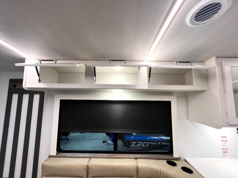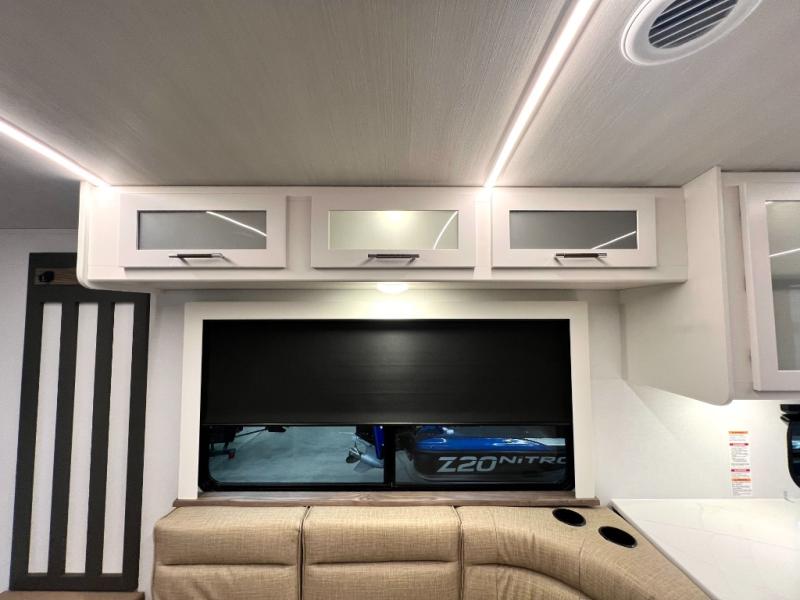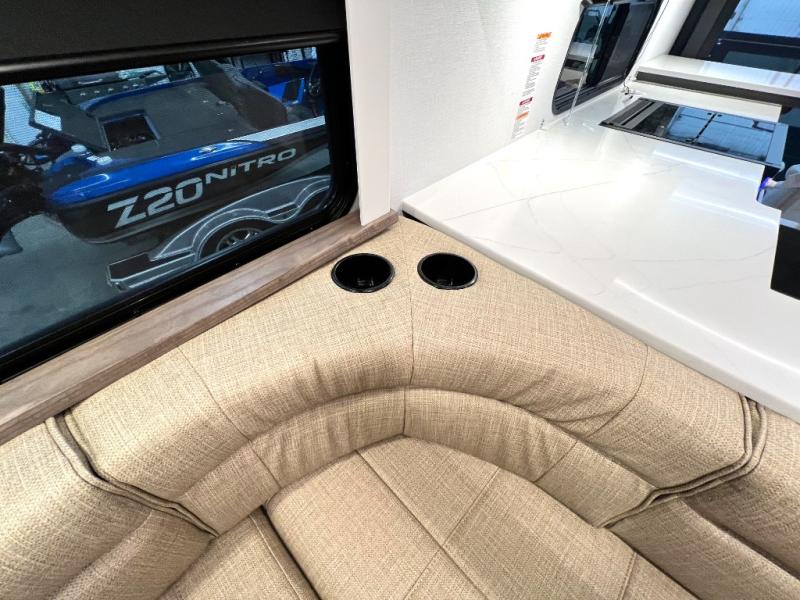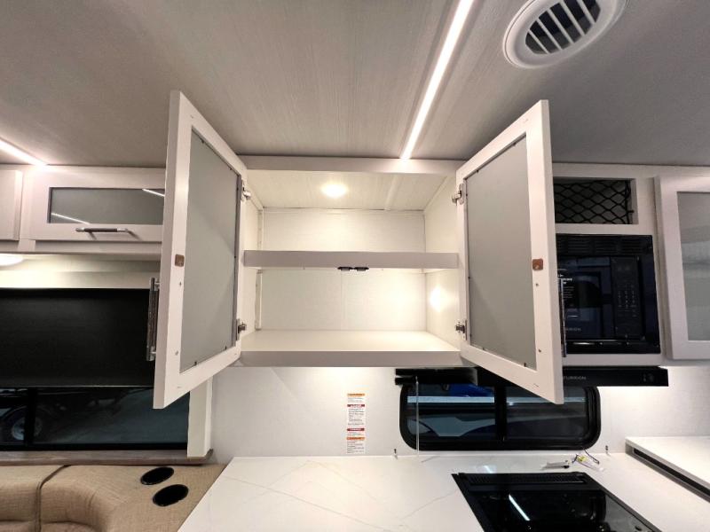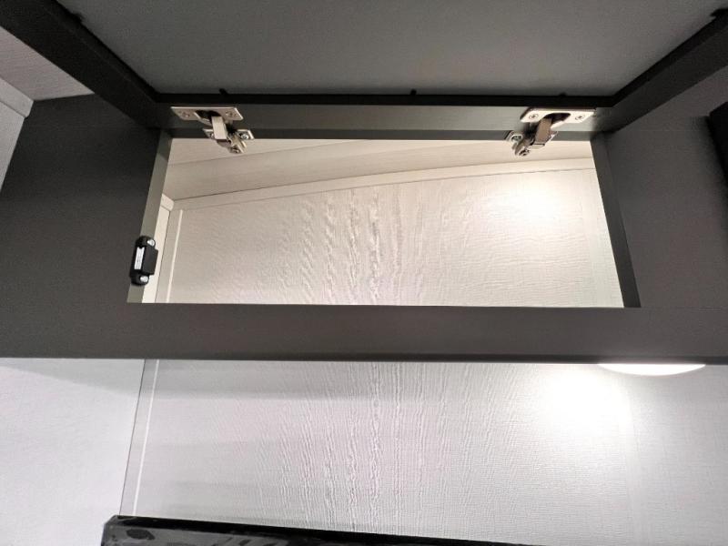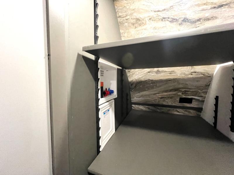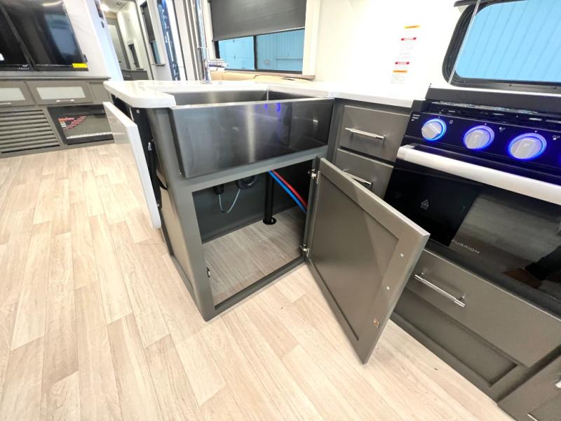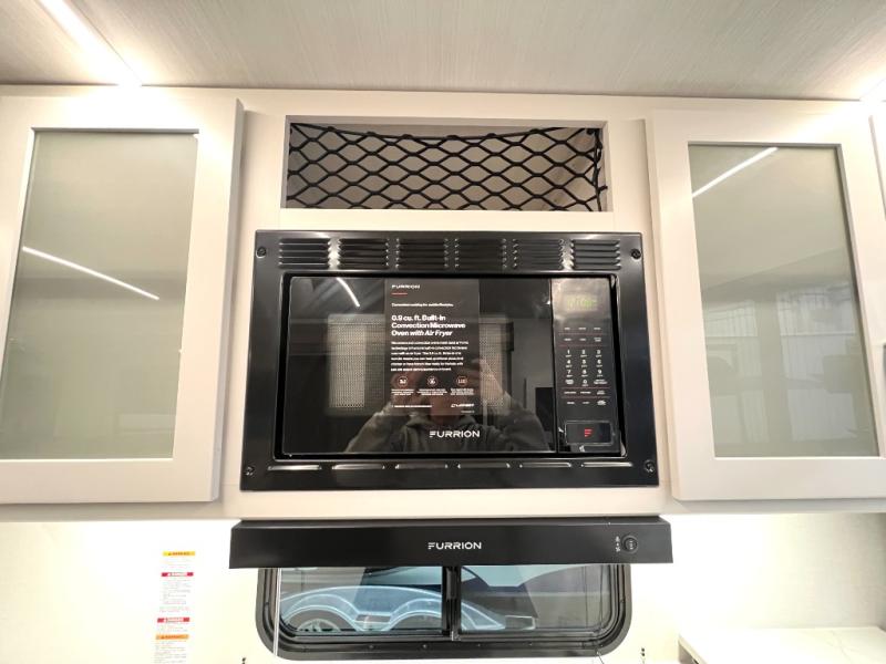 If you're looking for the perfect travel trailer to entertain guests, this is the one! The rear kitchen features a bartop with stools and a rear balcony where you can enjoy great outdoor views. The flip-up counter extension will provide the chef with more space to prep food, and there is a spacious refrigerator and pantry for food storage. Your crew can get comfy on the theater seating or L-shaped section sofa, and there is a 50" Smart TV and fireplace to make it a movie night! A full bath onboard lets you clean up after a day outdoors, and the front private bedroom with a king bed slide provides all the comfort you need. You'll also find two closets, washer and dryer prep, and a dresser to keep your things neat and organized.