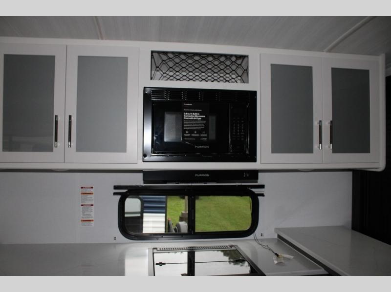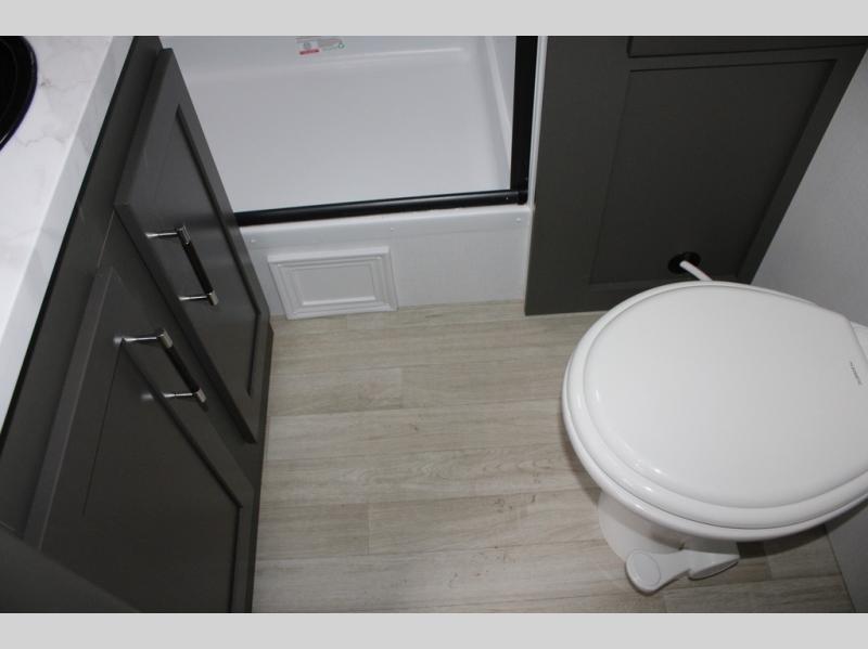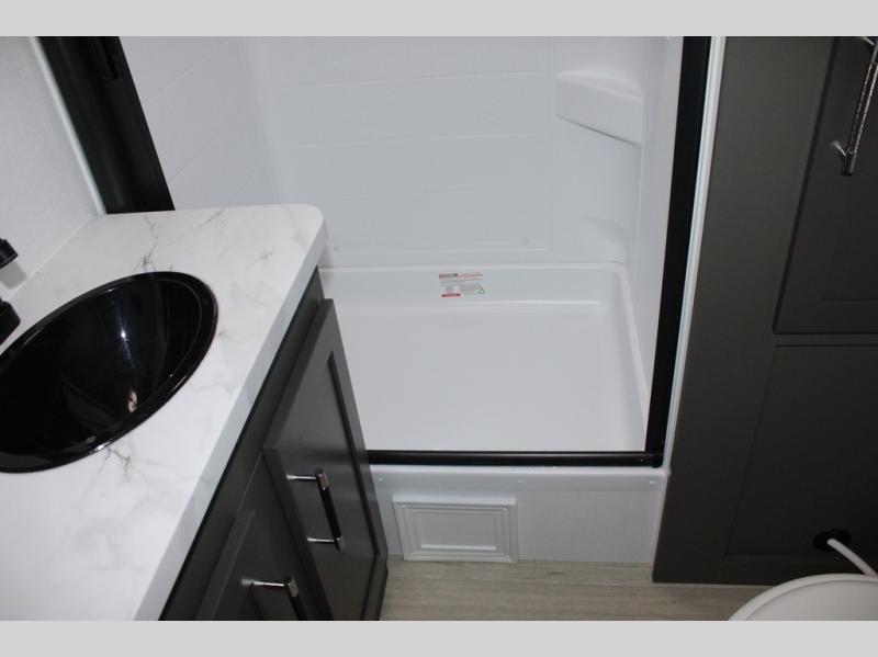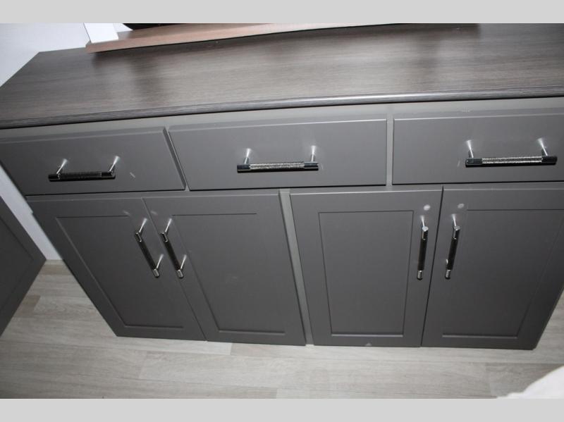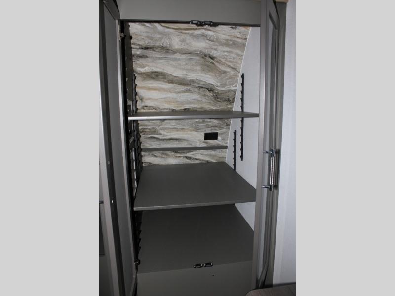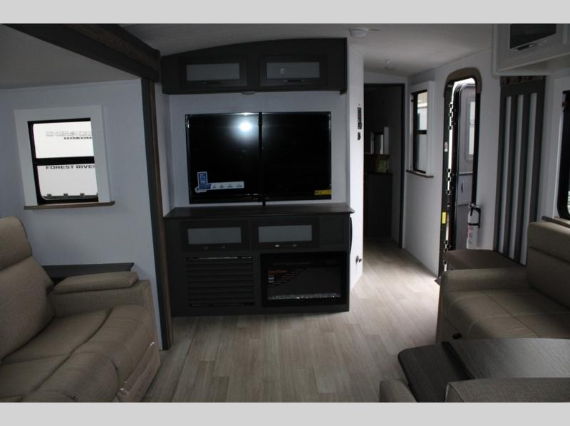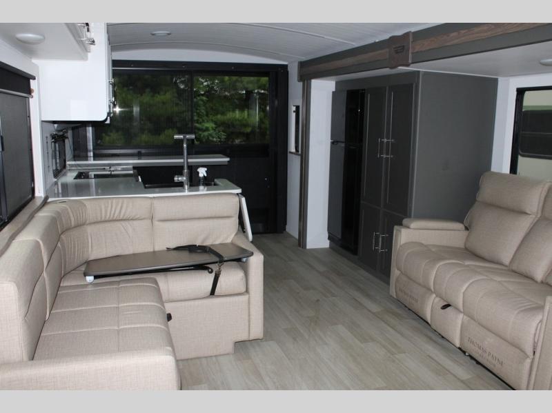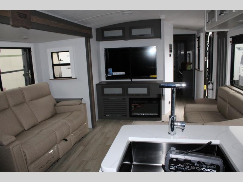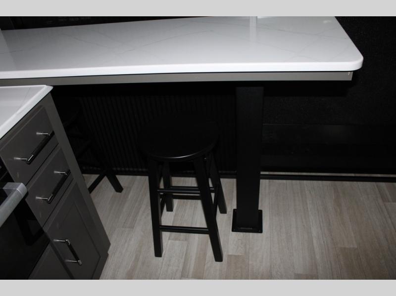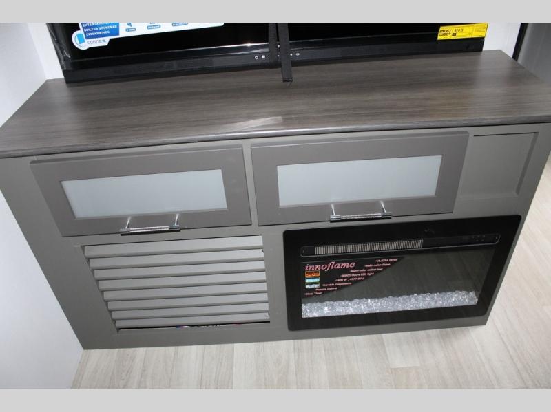If you're looking for the perfect travel trailer to entertain guests, this is the one! The rear kitchen features a bartop with stools and a rear balcony where you can enjoy great outdoor views. The flip-up counter extension will provide the chef with more space to prep food, and there is a spacious refrigerator and pantry for food storage. Your crew can get comfy on the theater seating or L-shaped section sofa, and there is a 50" Smart TV and fireplace to make it a movie night! A full bath onboard lets you clean up after a day outdoors, and the front private bedroom with a king bed slide provides all the comfort you need. You'll also find two closets, washer and dryer prep, and a dresser to keep your things neat and organized.