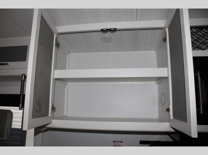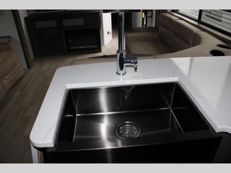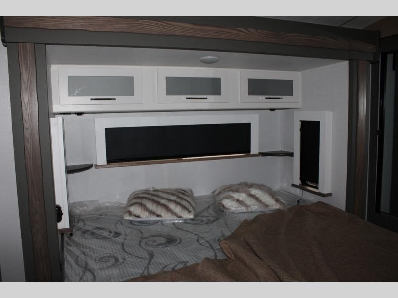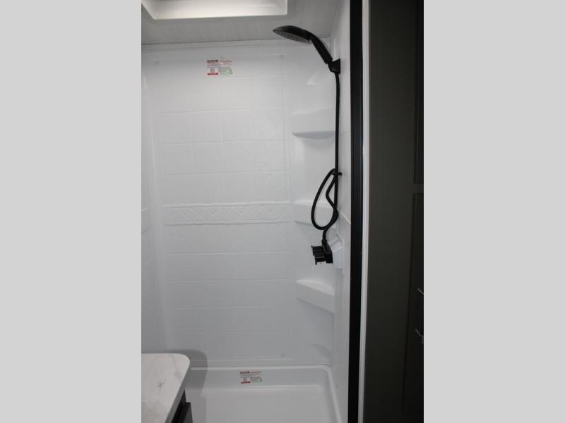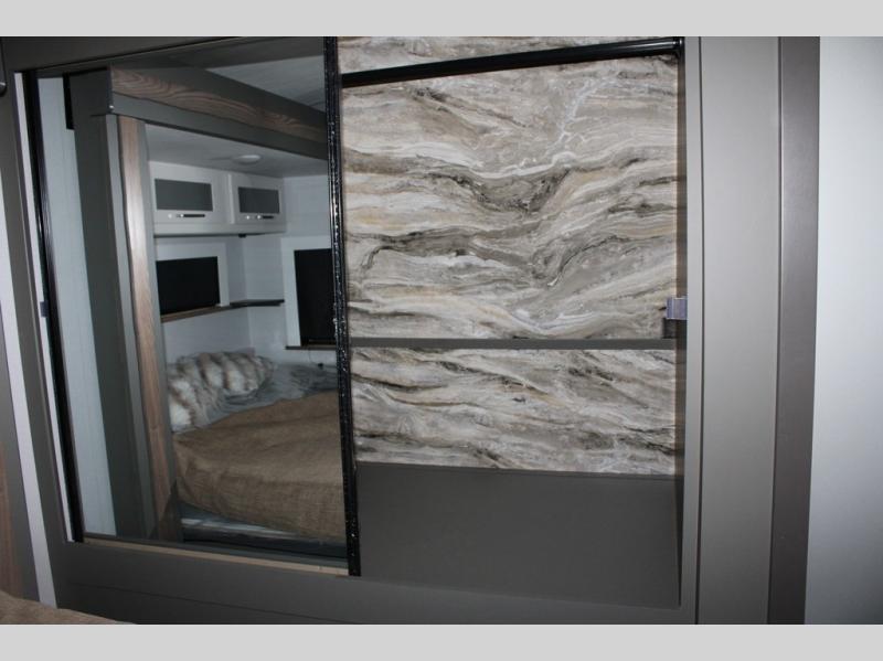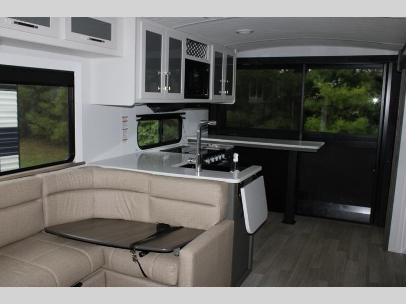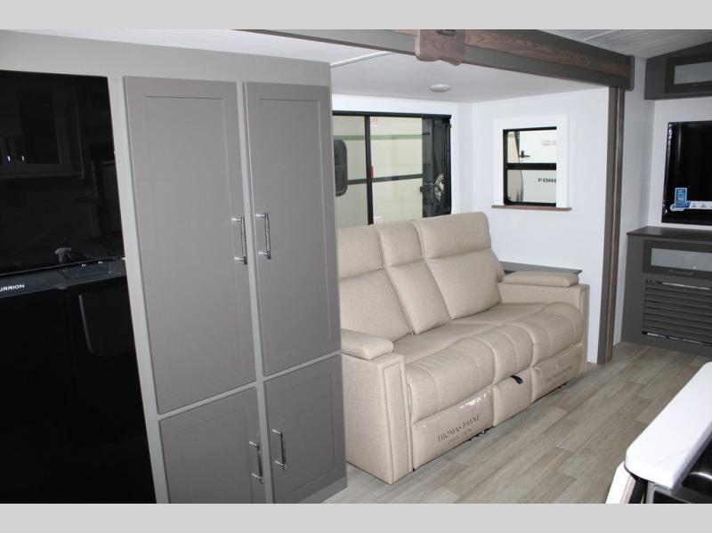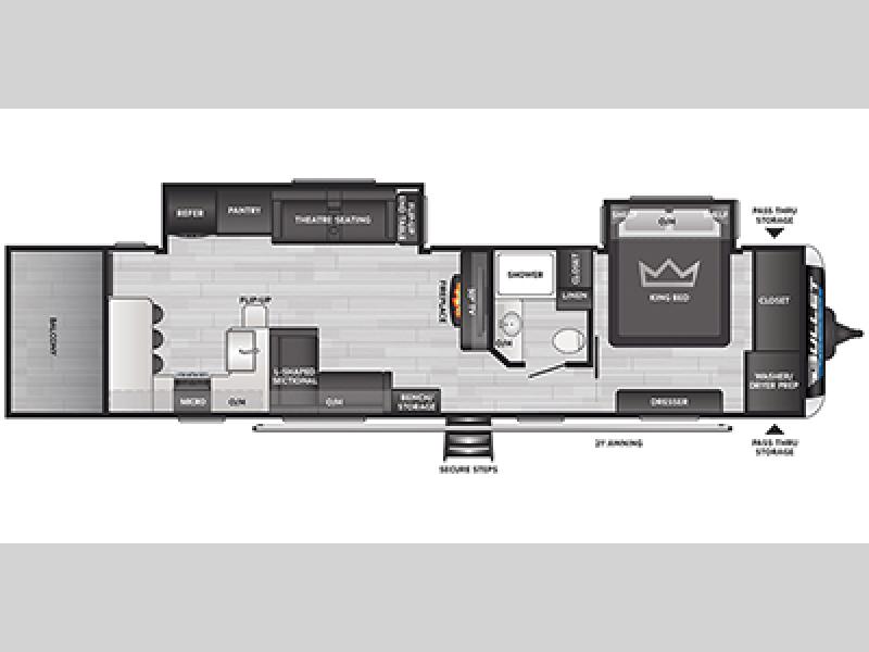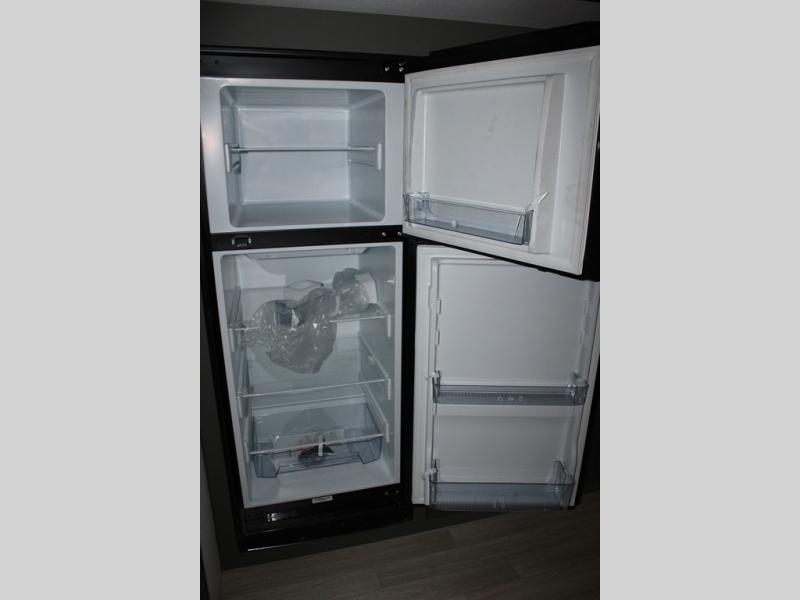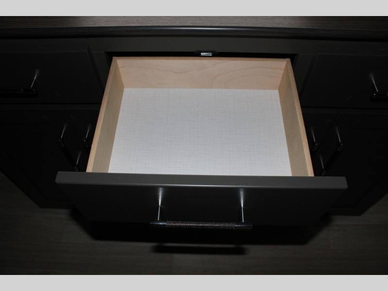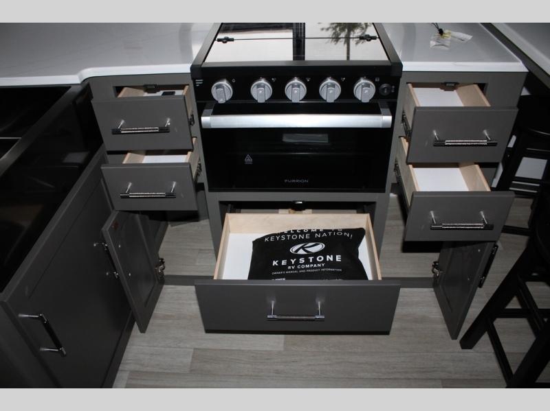 If you're looking for the perfect travel trailer to entertain guests, this is the one! The rear kitchen features a bartop with stools and a rear balcony where you can enjoy great outdoor views. The flip-up counter extension will provide the chef with more space to prep food, and there is a spacious refrigerator and pantry for food storage. Your crew can get comfy on the theater seating or L-shaped section sofa, and there is a 50" Smart TV and fireplace to make it a movie night! A full bath onboard lets you clean up after a day outdoors, and the front private bedroom with a king bed slide provides all the comfort you need. You'll also find two closets, washer and dryer prep, and a dresser to keep your things neat and organized.