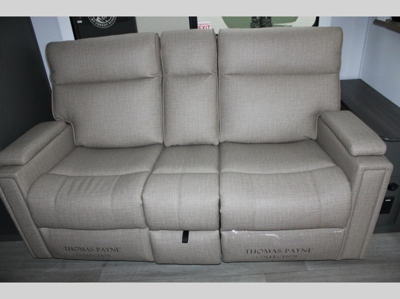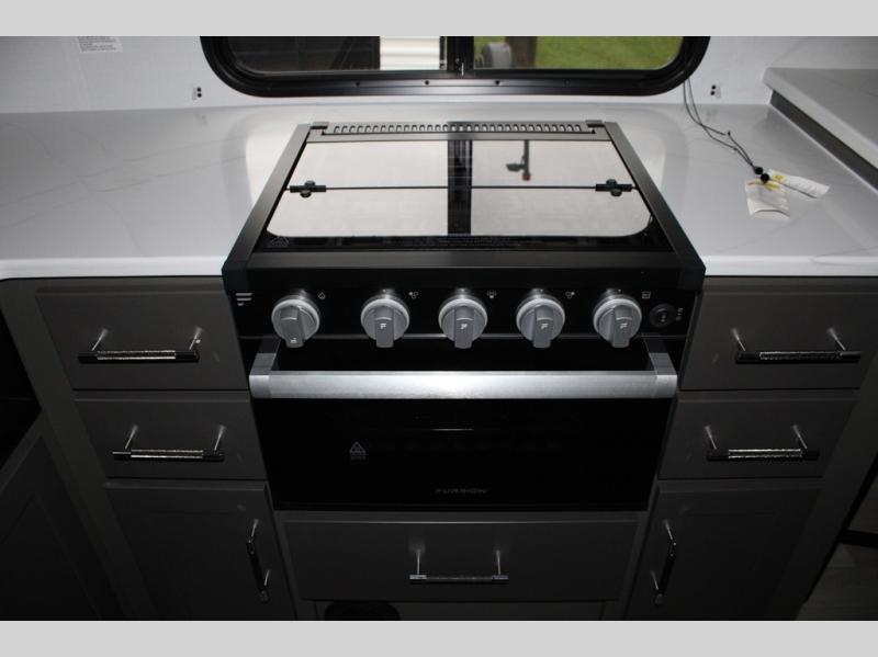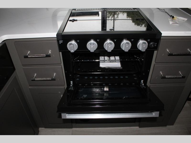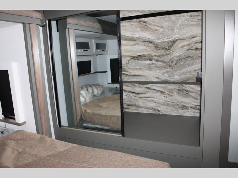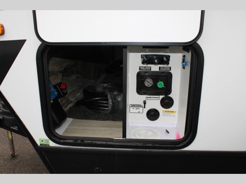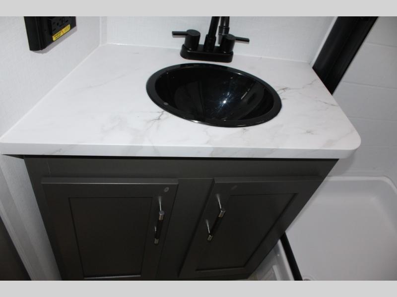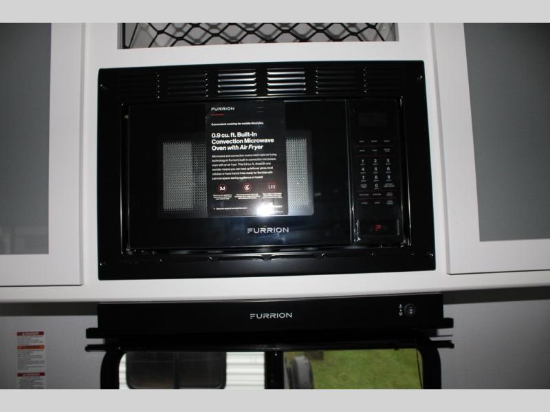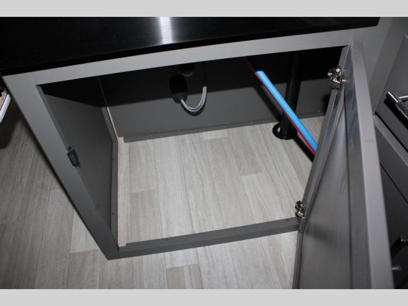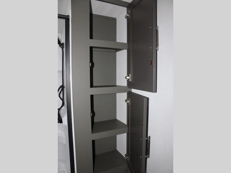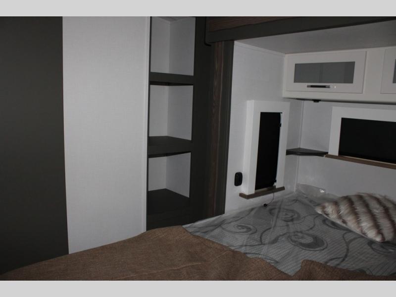 If you're looking for the perfect travel trailer to entertain guests, this is the one! The rear kitchen features a bartop with stools and a rear balcony where you can enjoy great outdoor views. The flip-up counter extension will provide the chef with more space to prep food, and there is a spacious refrigerator and pantry for food storage. Your crew can get comfy on the theater seating or L-shaped section sofa, and there is a 50" Smart TV and fireplace to make it a movie night! A full bath onboard lets you clean up after a day outdoors, and the front private bedroom with a king bed slide provides all the comfort you need. You'll also find two closets, washer and dryer prep, and a dresser to keep your things neat and organized.