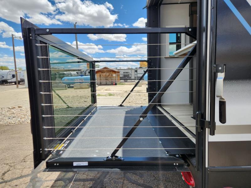 If you're looking for the perfect travel trailer to entertain guests, this is the one! The rear kitchen features a bartop with stools and a rear balcony where you can enjoy great outdoor views. The flip-up counter extension will provide the chef with more space to prep food, and there is a spacious refrigerator and pantry for food storage. Your crew can get comfy on the theater seating or L-shaped section sofa, and there is a 50" Smart TV and fireplace to make it a movie night! A full bath onboard lets you clean up after a day outdoors, and the front private bedroom with a king bed slide provides all the comfort you need. You'll also find two closets, washer and dryer prep, and a dresser to keep your things neat and organized.