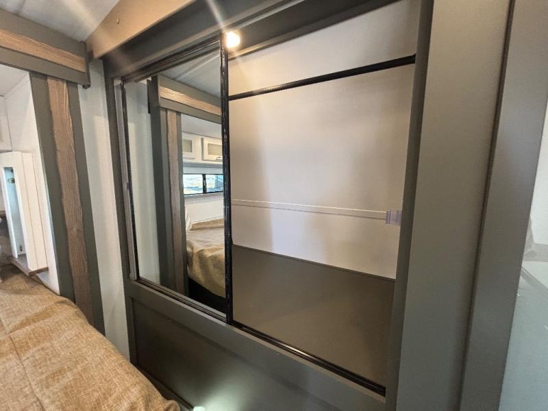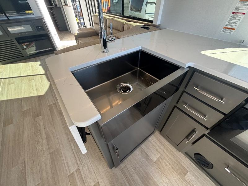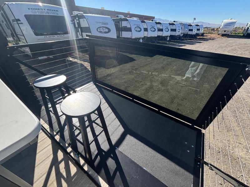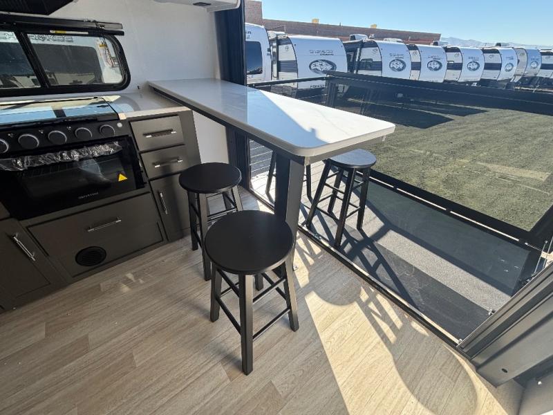 If you're looking for the perfect travel trailer to entertain guests, this is the one! The rear kitchen features a bartop with stools and a rear balcony where you can enjoy great outdoor views. The flip-up counter extension will provide the chef with more space to prep food, and there is a spacious refrigerator and pantry for food storage. Your crew can get comfy on the theater seating or L-shaped section sofa, and there is a 50" Smart TV and fireplace to make it a movie night! A full bath onboard lets you clean up after a day outdoors, and the front private bedroom with a king bed slide provides all the comfort you need. You'll also find two closets, washer and dryer prep, and a dresser to keep your things neat and organized.