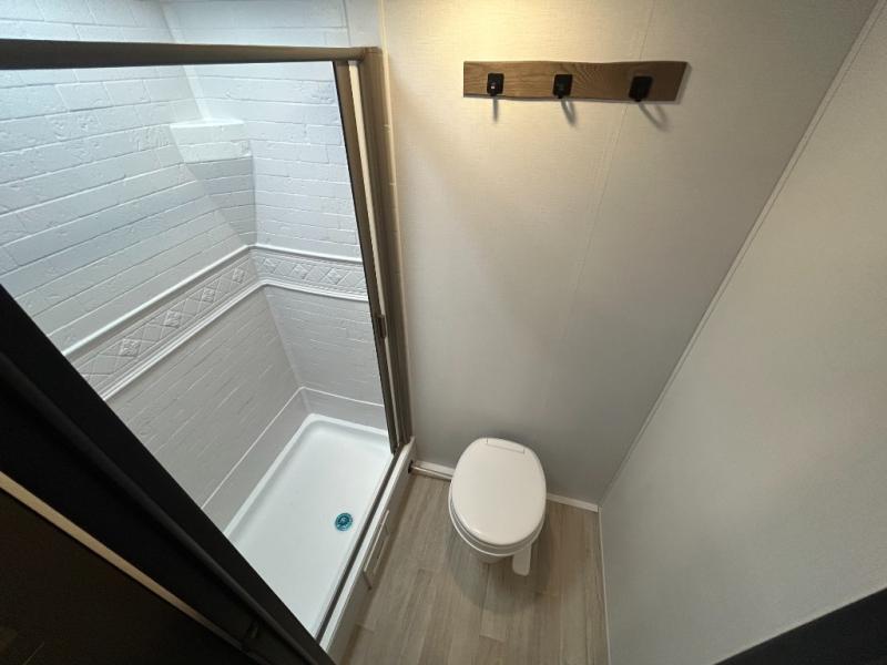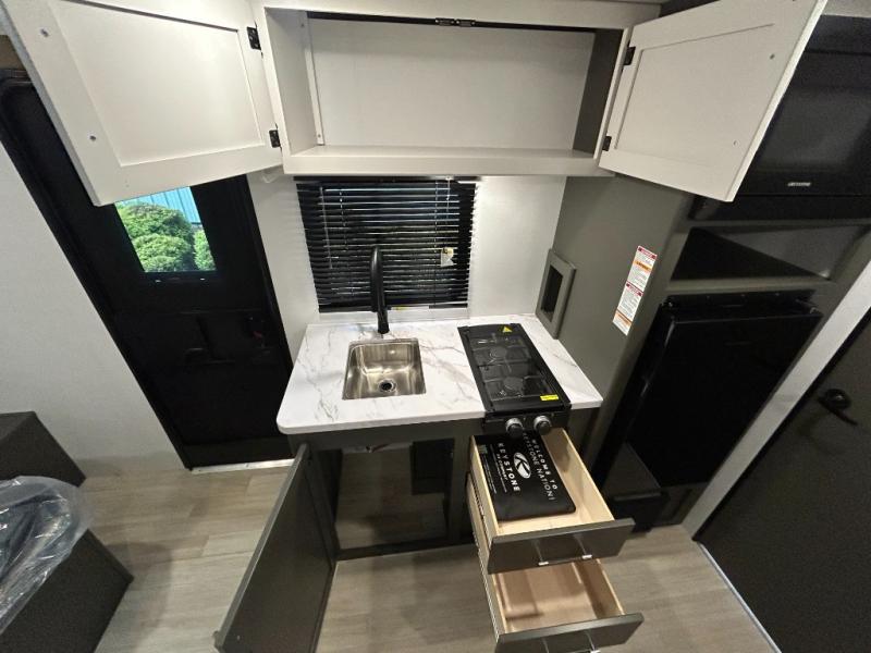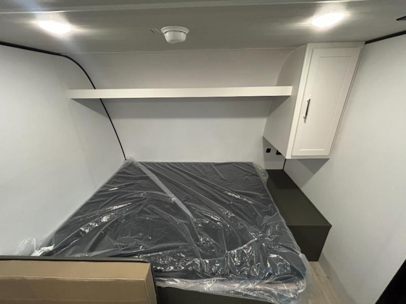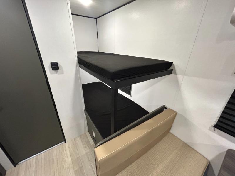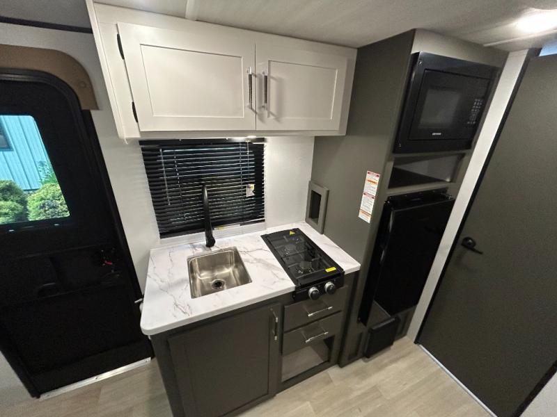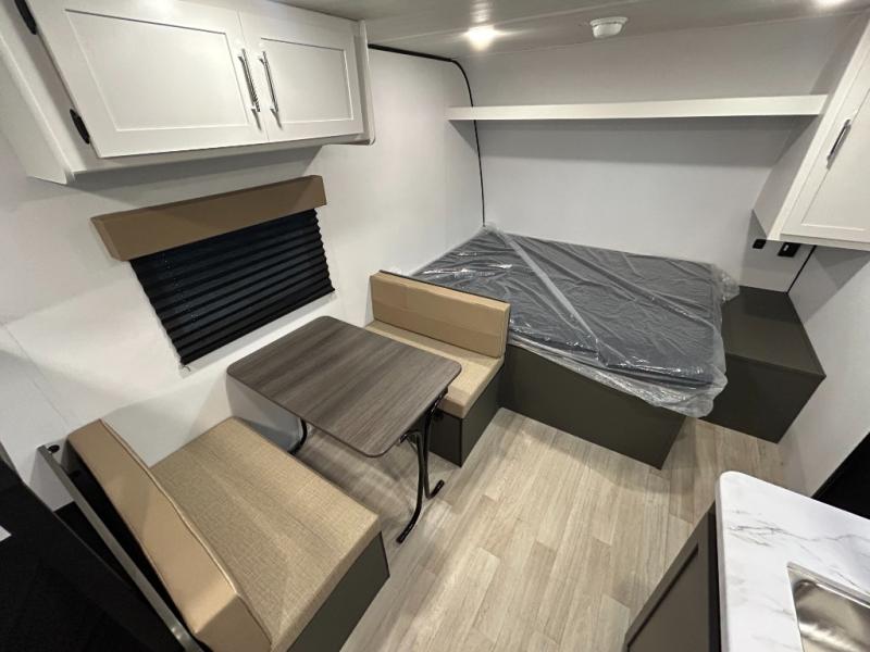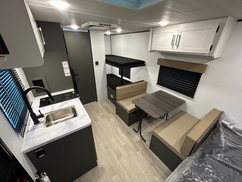 Trips to the Grand Canyon are made comfortable in this travel trailer for five. You will enjoy your own queen bed up front with a wardrobe for your clothes. The kids or your guests will love the bunk beds right next to the full bath, and there is also a booth dinette that can serve as both dining and sleeping space. Prepare all your meals in the microwave oven or use the cooktop, and the 8 cu. ft. refrigerator will be perfect for all your perishables.