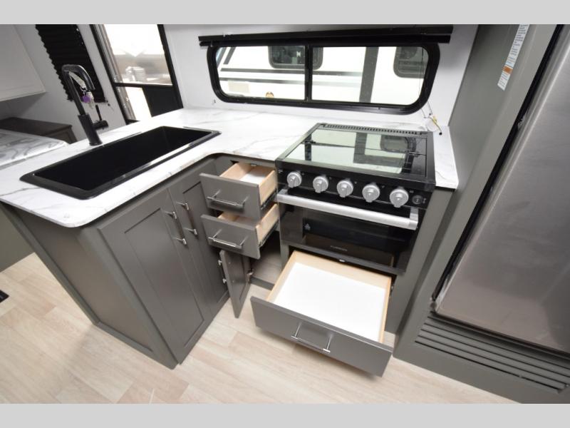 Say goodbye to shared campgrounds facilities! The full rear bath offers all the comforts of home, including ample space for easy nighttime trips. No more walking to the camp restroom in the dark!