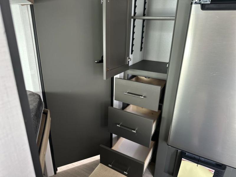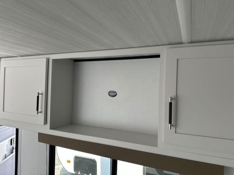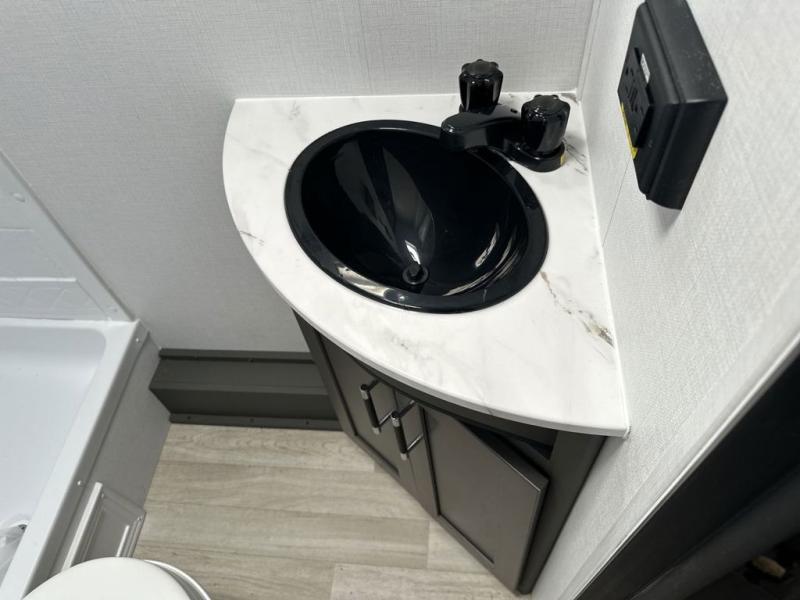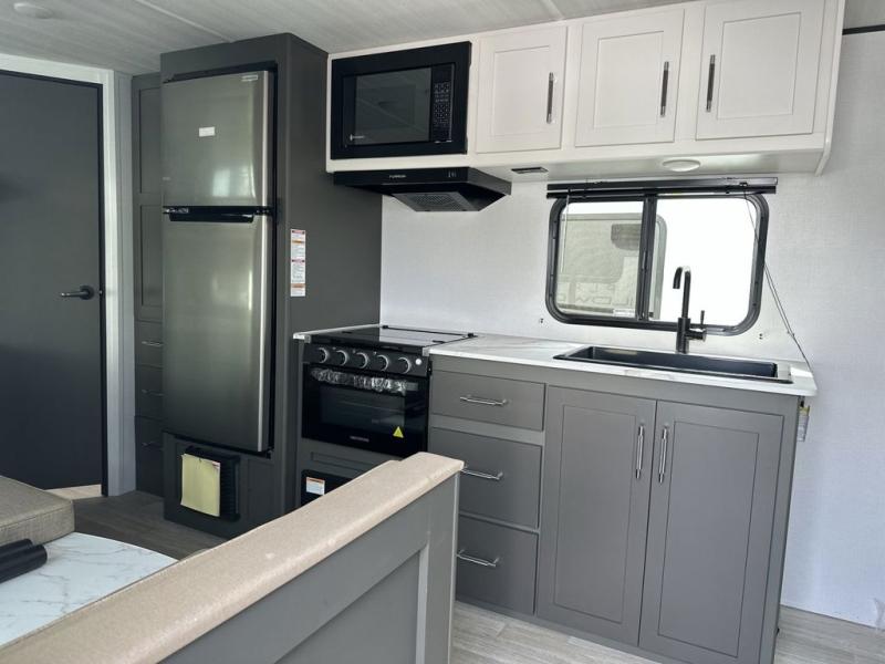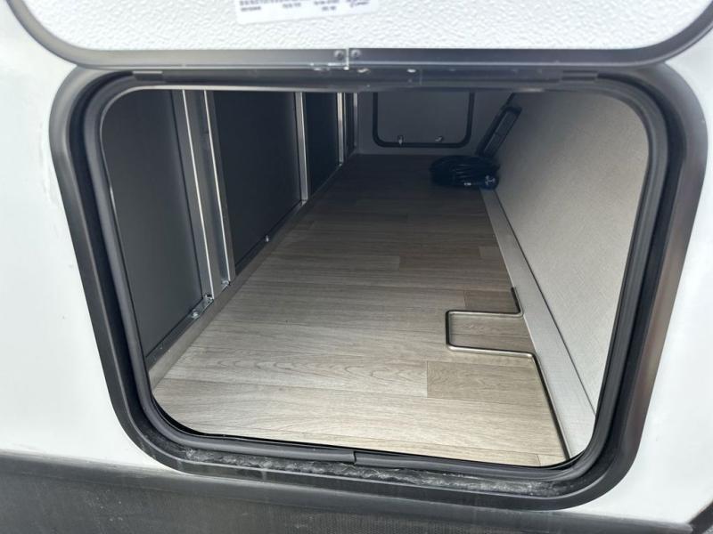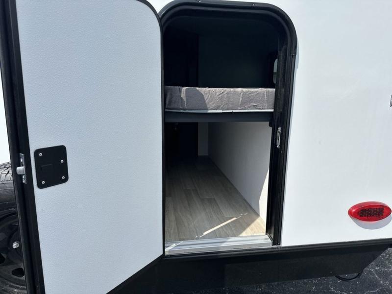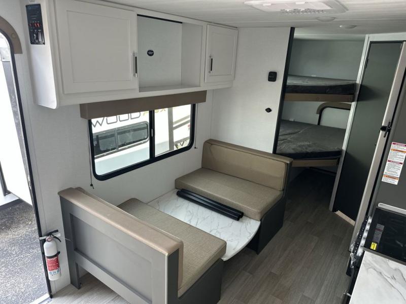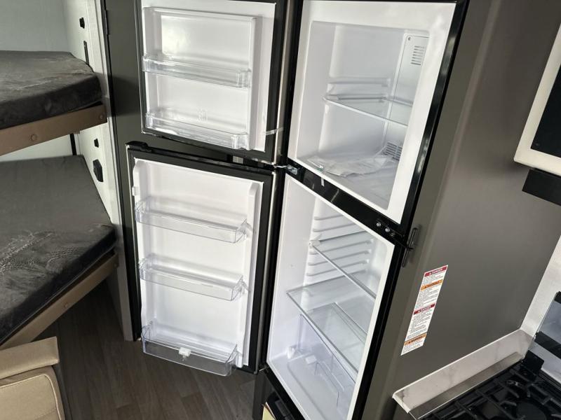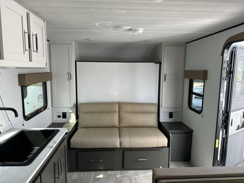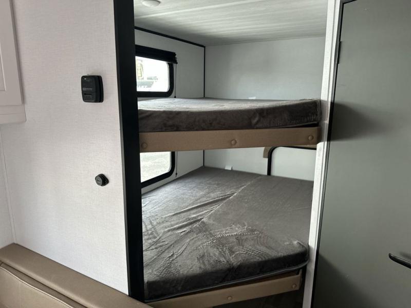 You'll love trips to the campground in this travel trailer that can sleep seven each night. The double-size bunks feature a flip-up bunk for added storage, and the bunks are right next to the full bath for easy nighttime use for the little ones. A front Murphy bed can be folded away during the day so you can enjoy added space and the sofa, and there is a Do-More dinette table to dine together or play a board game. The chef of your group will have a full kitchen with a cooktop and microwave oven plus an 8 cu. ft. refrigerator and pantry for food storage. Head outside to enjoy the 15' awning, LP quick connect, and pass-thru storage!