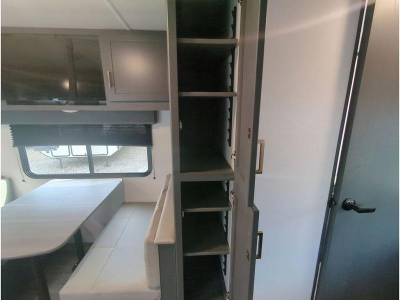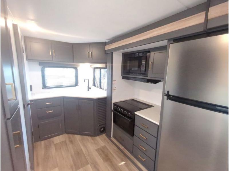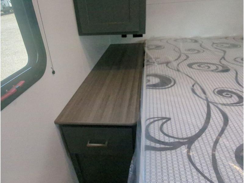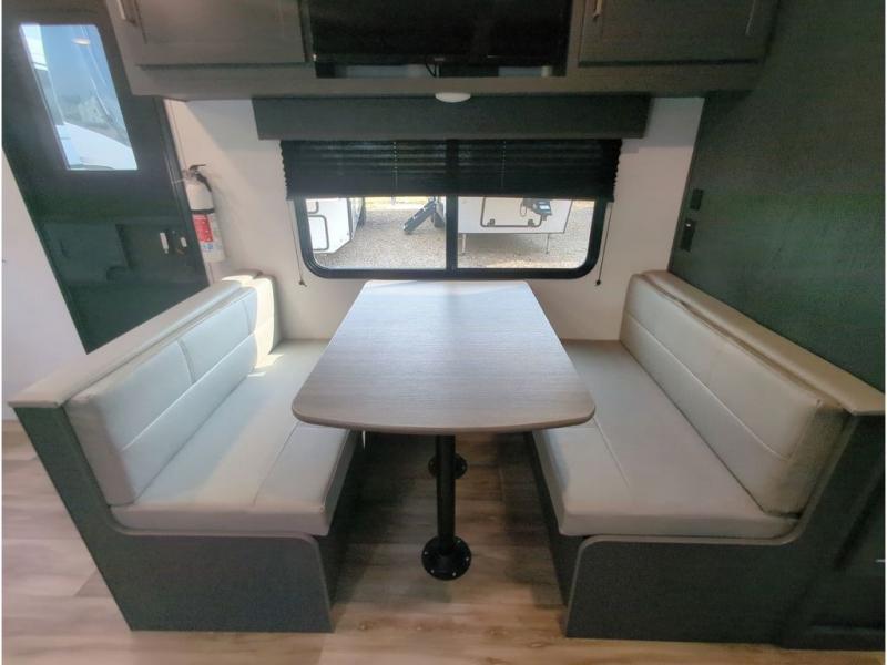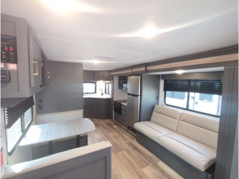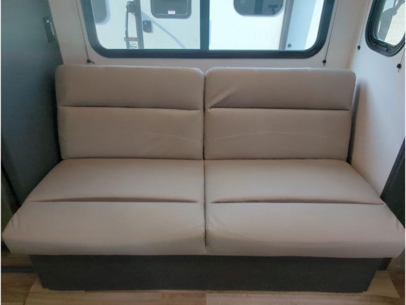 This travel trailer with a large slide out is sure to meet all your needs. When you arrive at the campground, you can put out the patio awning, unload the pass-thru storage, and relax in your camp chairs. The cooktop and microwave oven in the rear corner kitchen will let you make lunch for everyone, and the 8 cu. ft. refrigerator and pantry will help you keep food stocked. You will love having a queen bed to sleep on each night, and the booth dinette and jack knife sofa provide seating and sleeping space for guests!