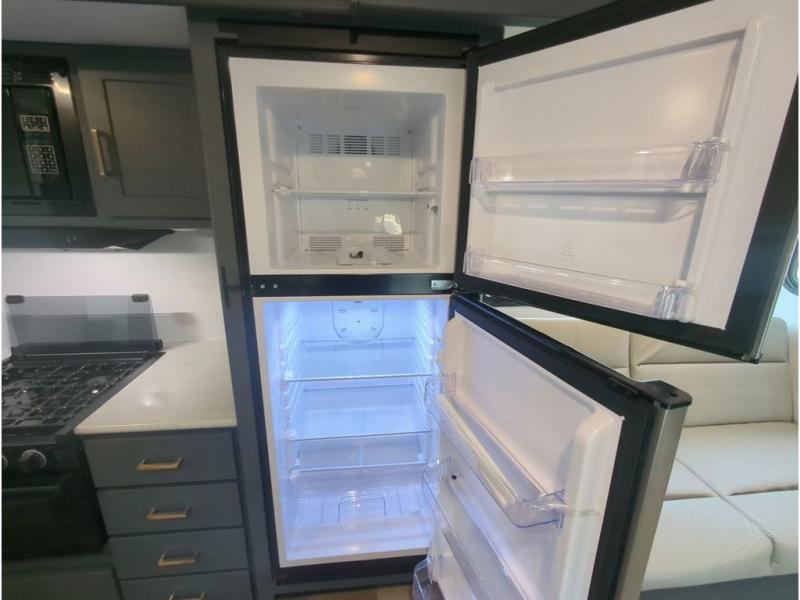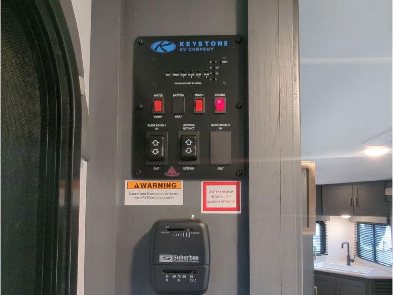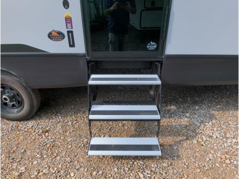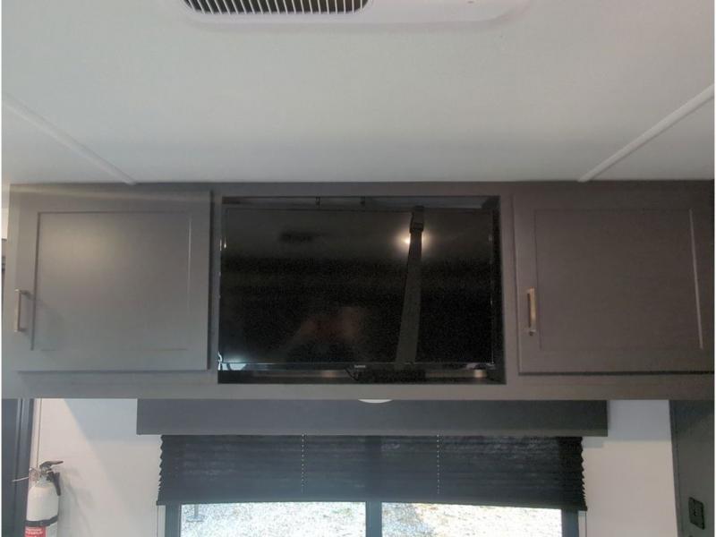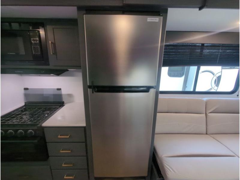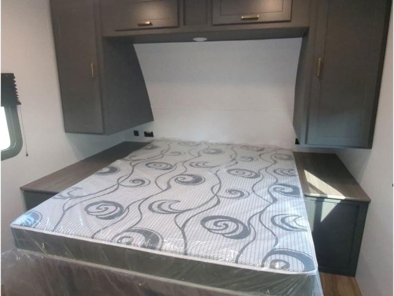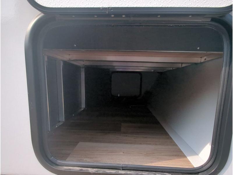 This travel trailer with a large slide out is sure to meet all your needs. When you arrive at the campground, you can put out the patio awning, unload the pass-thru storage, and relax in your camp chairs. The cooktop and microwave oven in the rear corner kitchen will let you make lunch for everyone, and the 8 cu. ft. refrigerator and pantry will help you keep food stocked. You will love having a queen bed to sleep on each night, and the booth dinette and jack knife sofa provide seating and sleeping space for guests!