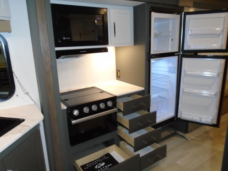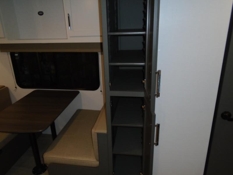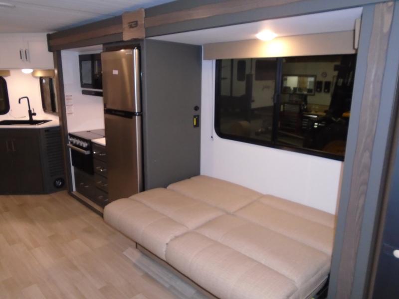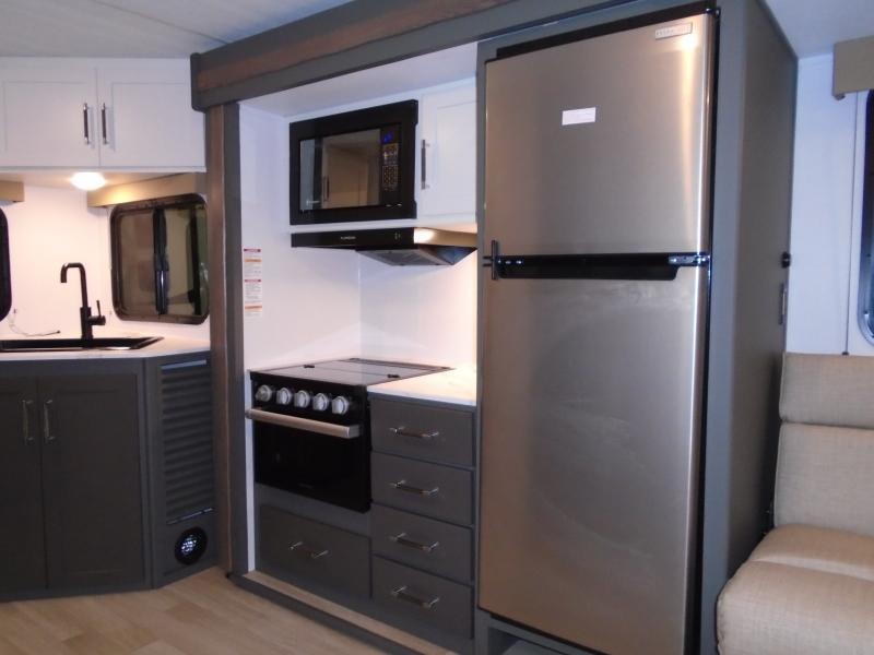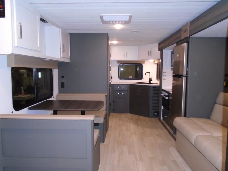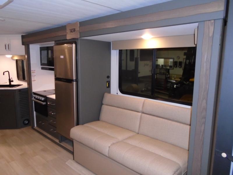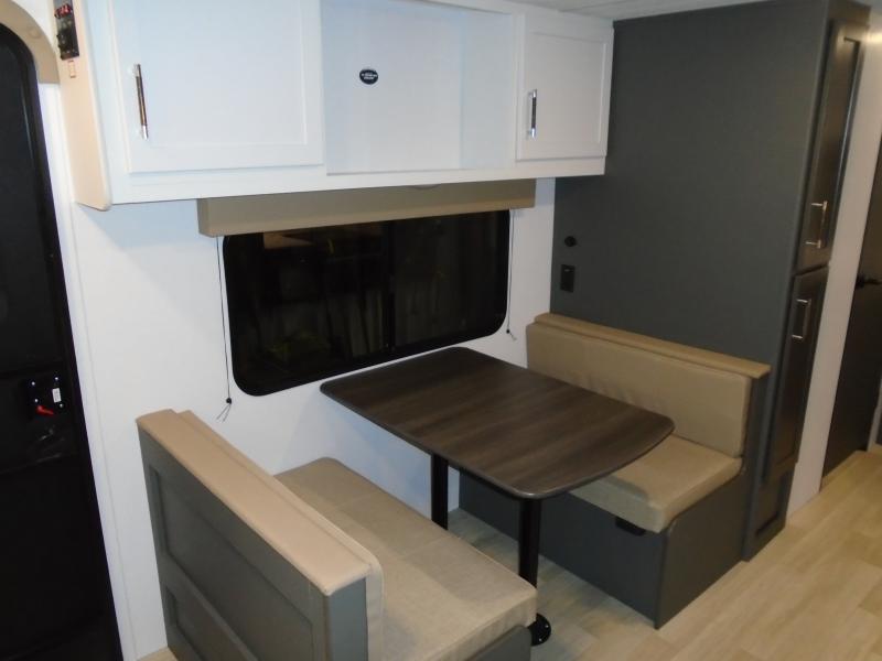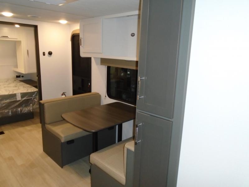This travel trailer with a large slide out is sure to meet all your needs. When you arrive at the campground, you can put out the patio awning, unload the pass-thru storage, and relax in your camp chairs. The cooktop and microwave oven in the rear corner kitchen will let you make lunch for everyone, and the 8 cu. ft. refrigerator and pantry will help you keep food stocked. You will love having a queen bed to sleep on each night, and the booth dinette and jack knife sofa provide seating and sleeping space for guests!