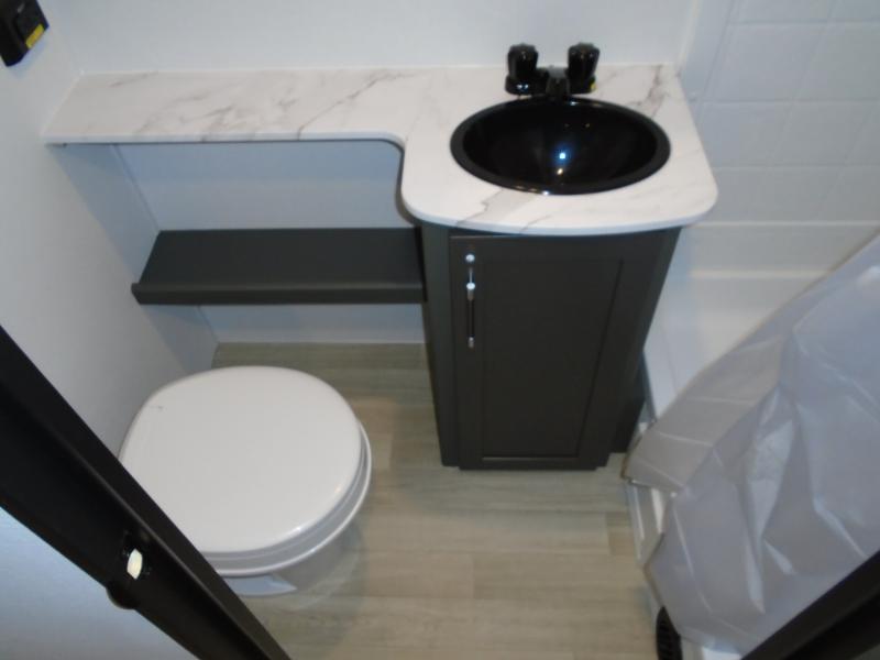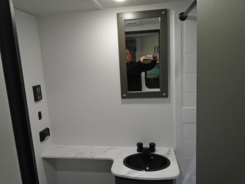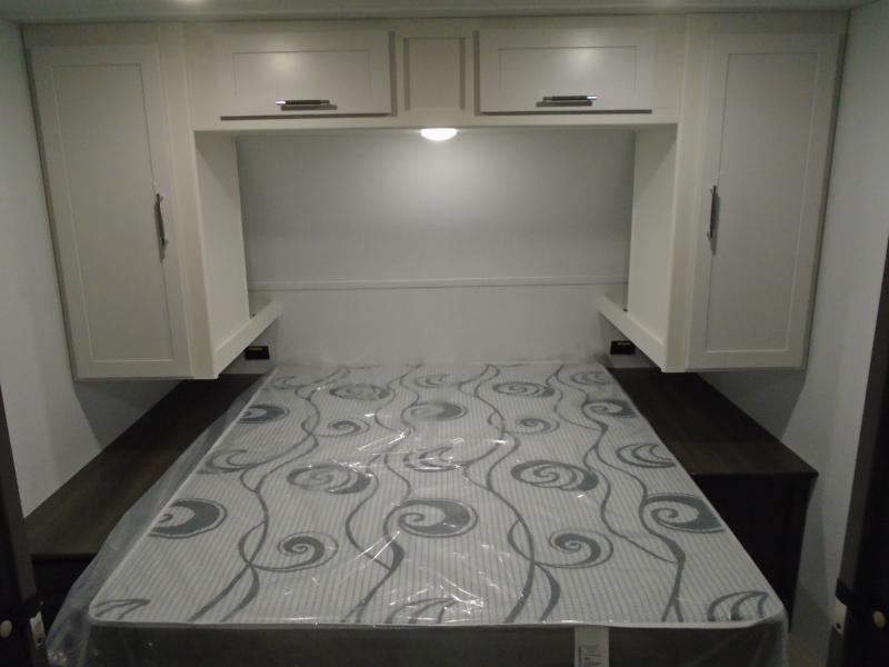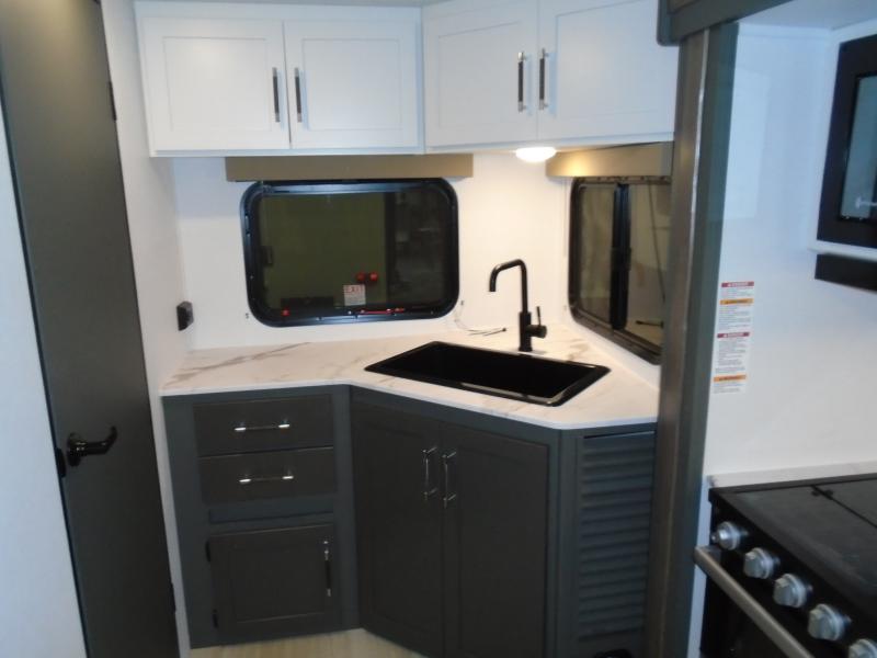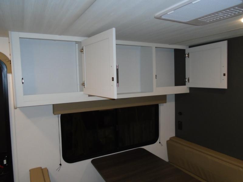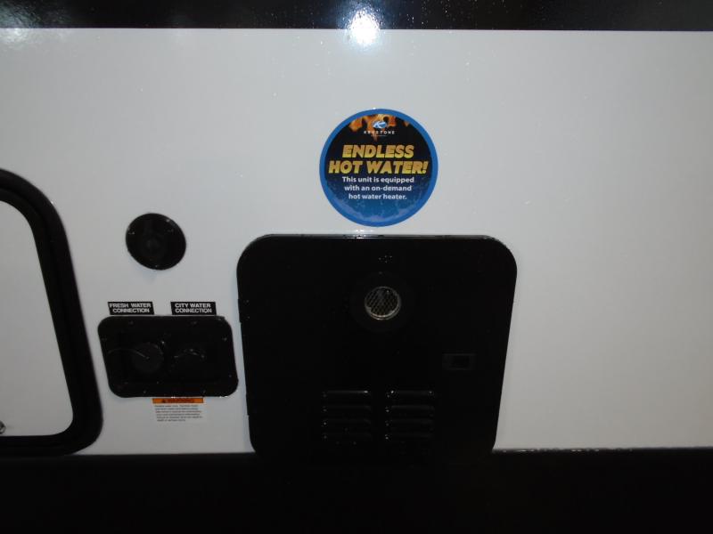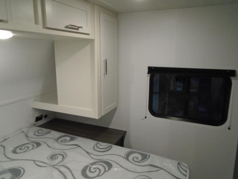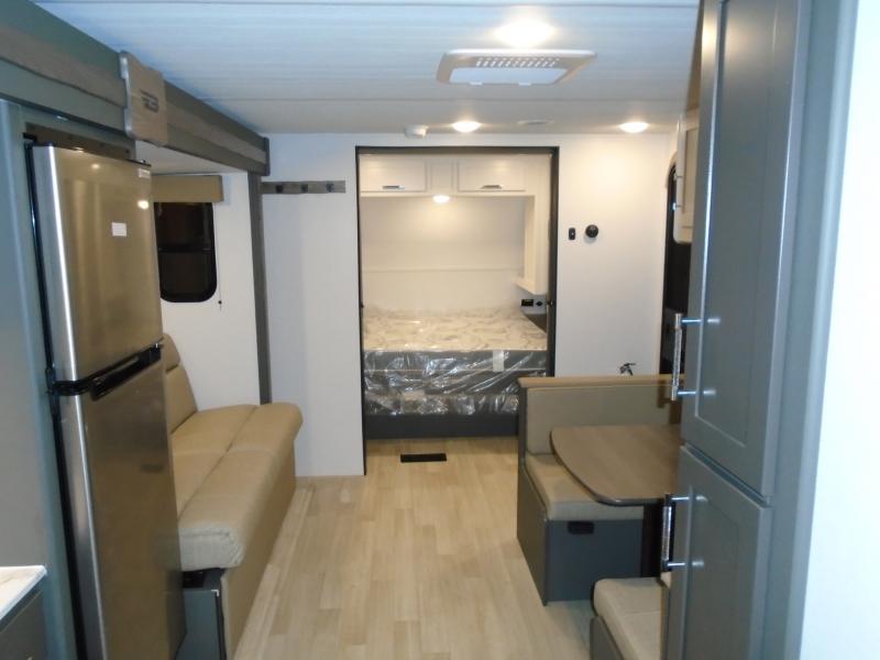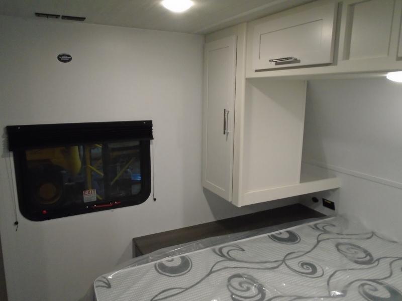 This travel trailer with a large slide out is sure to meet all your needs. When you arrive at the campground, you can put out the patio awning, unload the pass-thru storage, and relax in your camp chairs. The cooktop and microwave oven in the rear corner kitchen will let you make lunch for everyone, and the 8 cu. ft. refrigerator and pantry will help you keep food stocked. You will love having a queen bed to sleep on each night, and the booth dinette and jack knife sofa provide seating and sleeping space for guests!