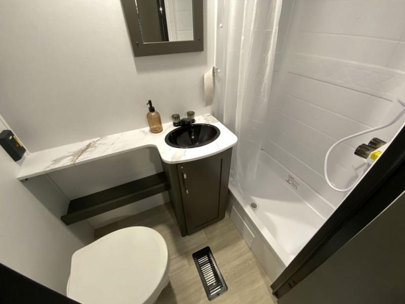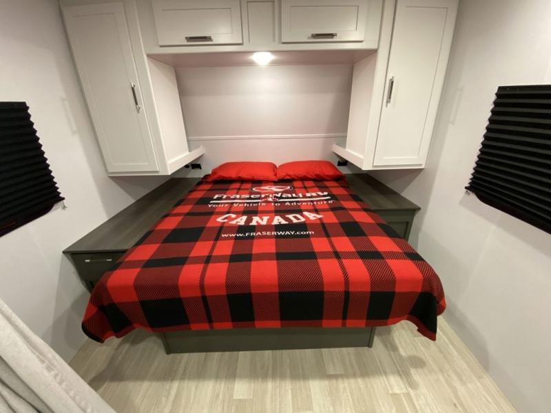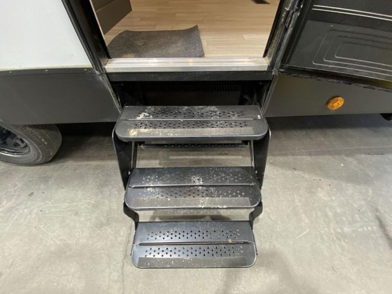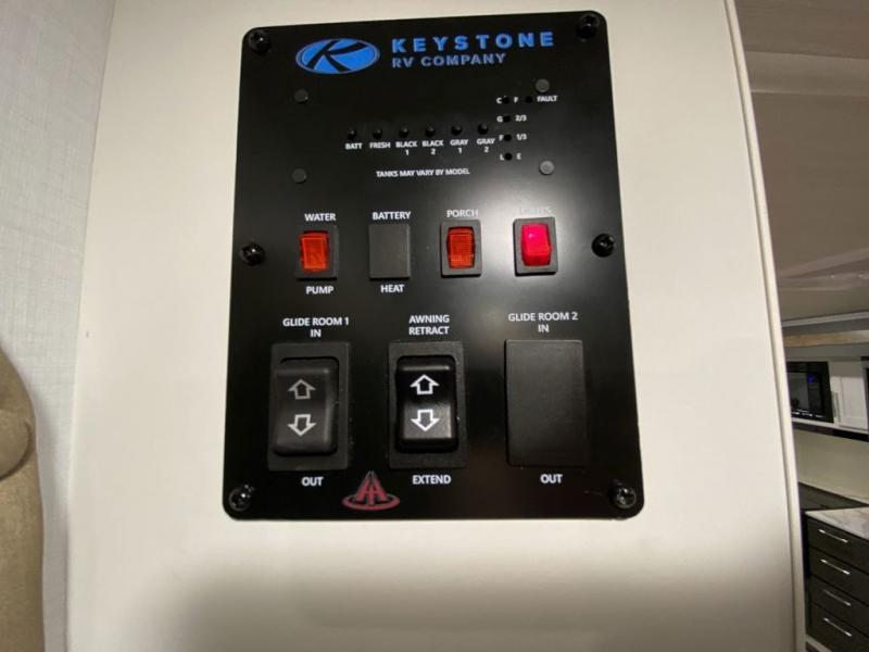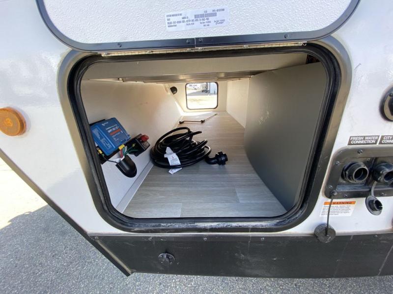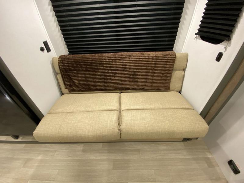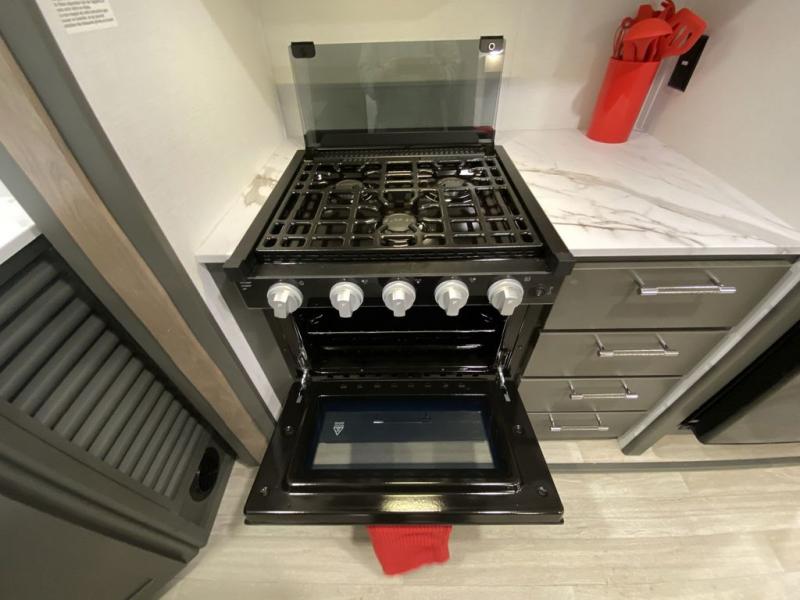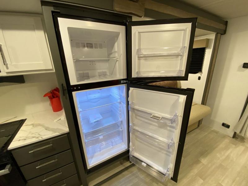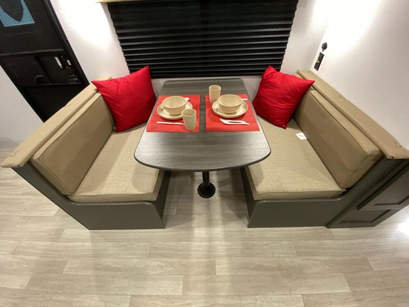 This travel trailer with a large slide out is sure to meet all your needs. When you arrive at the campground, you can put out the patio awning, unload the pass-thru storage, and relax in your camp chairs. The cooktop and microwave oven in the rear corner kitchen will let you make lunch for everyone, and the 8 cu. ft. refrigerator and pantry will help you keep food stocked. You will love having a queen bed to sleep on each night, and the booth dinette and jack knife sofa provide seating and sleeping space for guests!