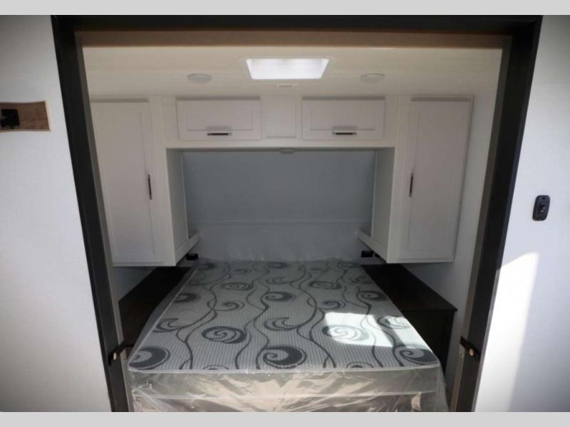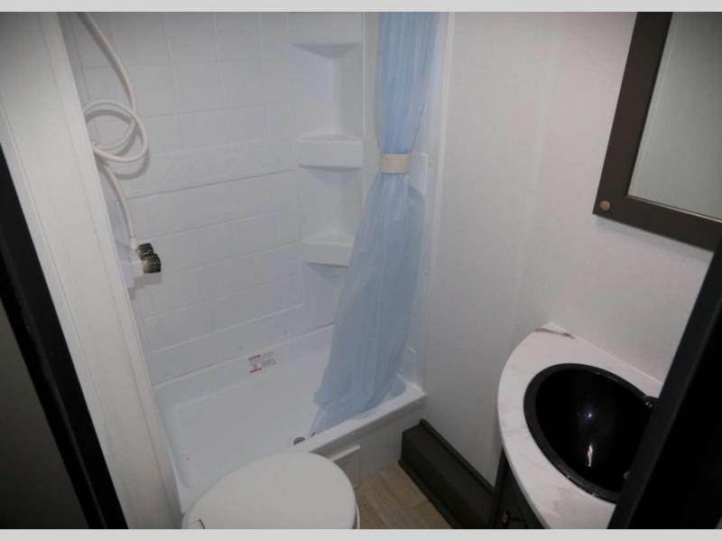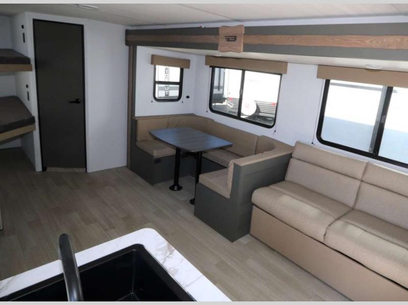 You can't go wrong with this travel trailer in tow! The double-size bunks feature a flip-up bunk for added storage, and they are right next to the full bath for easy nighttime use. You'll find the front semi-private bedroom to be accommodating with its queen bed and dual wardrobes to keep your things tidy. Head to the combined kitchen and living room to relax on the jack knife sofa or play a game around the U-shaped dinette, and these areas can even double as additional sleeping space if needed! The full kitchen includes a cooktop and microwave to make meals, plus an 8 cu.ft. refrigerator and pantry for food storage. And don't overlook the exterior with its patio awning and pass-thru storage!