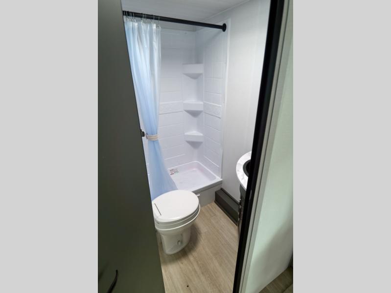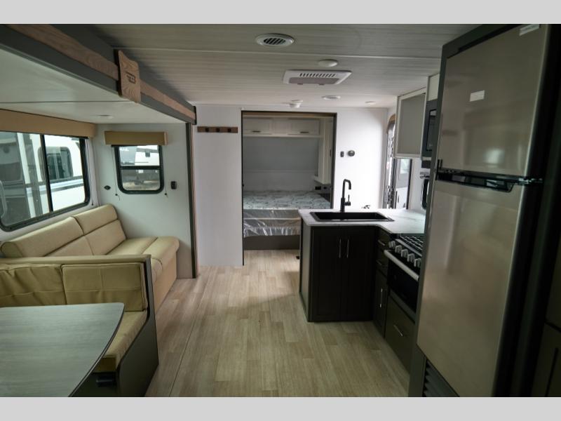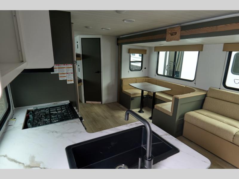 You can't go wrong with this travel trailer in tow! The double-size bunks feature a flip-up bunk for added storage, and they are right next to the full bath for easy nighttime use. You'll find the front semi-private bedroom to be accommodating with its queen bed and dual wardrobes to keep your things tidy. Head to the combined kitchen and living room to relax on the jack knife sofa or play a game around the U-shaped dinette, and these areas can even double as additional sleeping space if needed! The full kitchen includes a cooktop and microwave to make meals, plus an 8 cu.ft. refrigerator and pantry for food storage. And don't overlook the exterior with its patio awning and pass-thru storage!