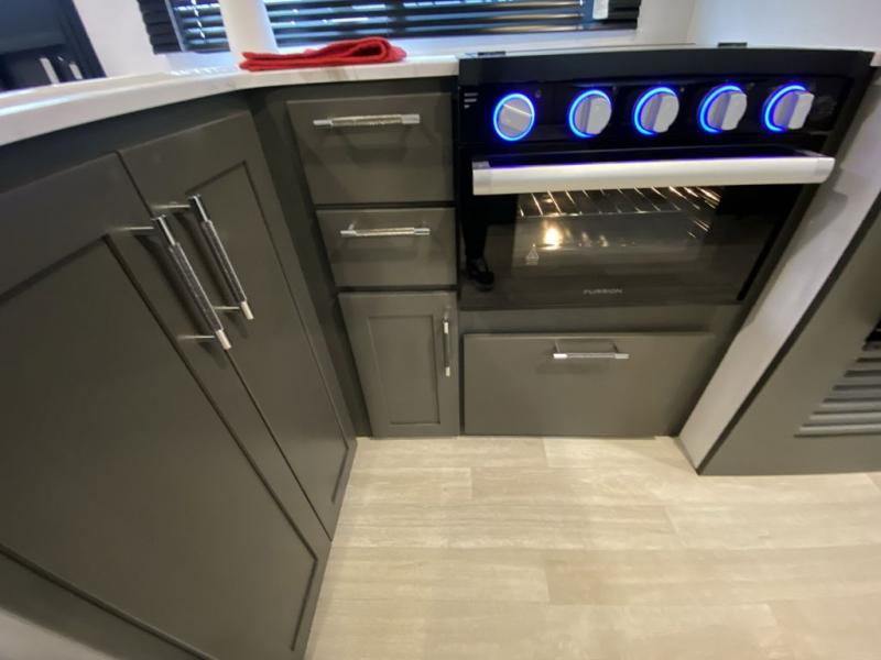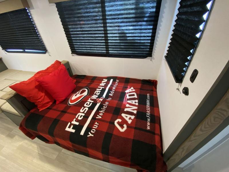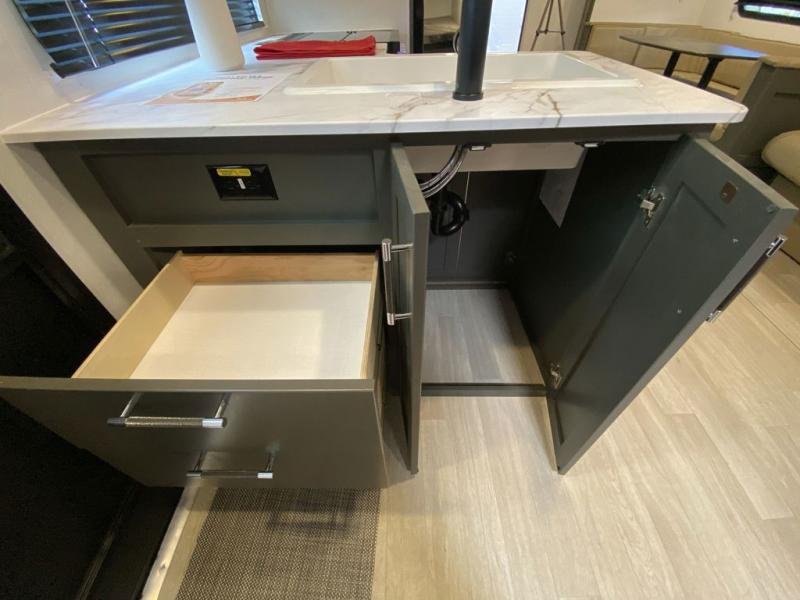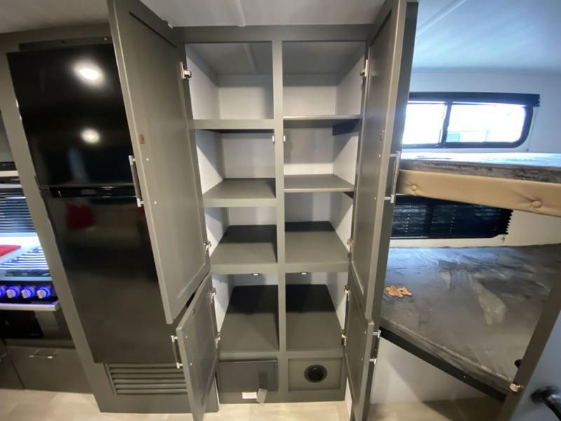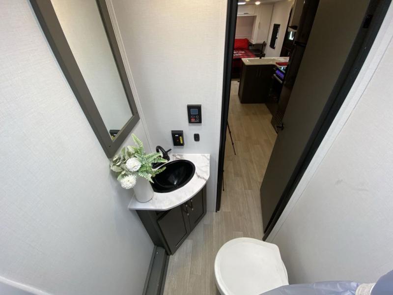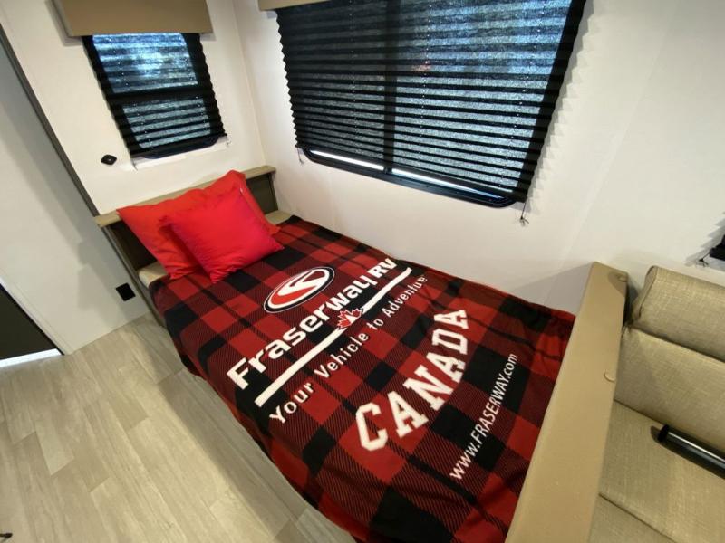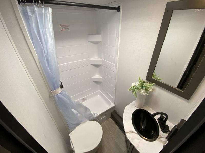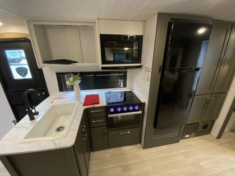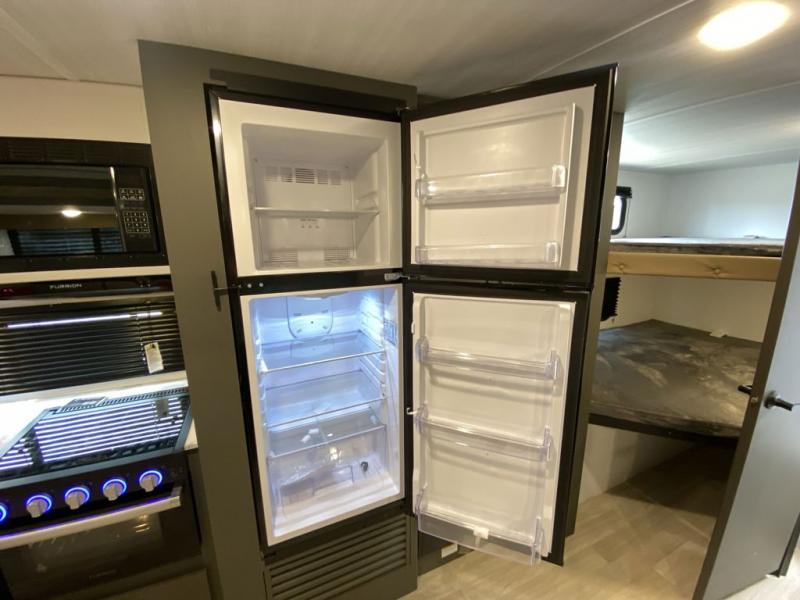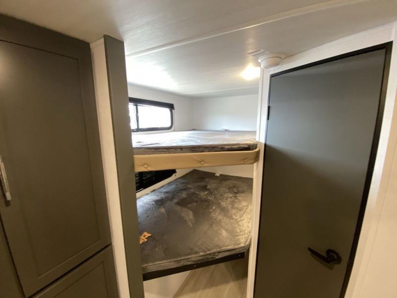 You can't go wrong with this travel trailer in tow! The double-size bunks feature a flip-up bunk for added storage, and they are right next to the full bath for easy nighttime use. You'll find the front semi-private bedroom to be accommodating with its queen bed and dual wardrobes to keep your things tidy. Head to the combined kitchen and living room to relax on the jack knife sofa or play a game around the U-shaped dinette, and these areas can even double as additional sleeping space if needed! The full kitchen includes a cooktop and microwave to make meals, plus an 8 cu.ft. refrigerator and pantry for food storage. And don't overlook the exterior with its patio awning, pull out step, and pass-thru storage!