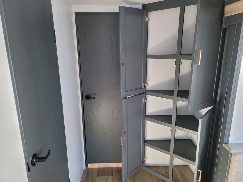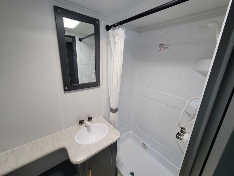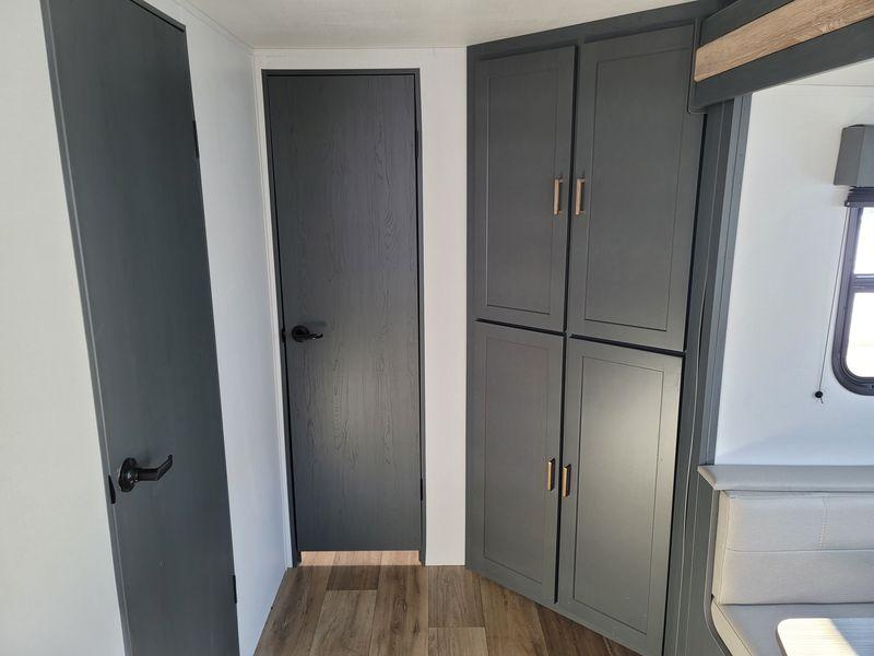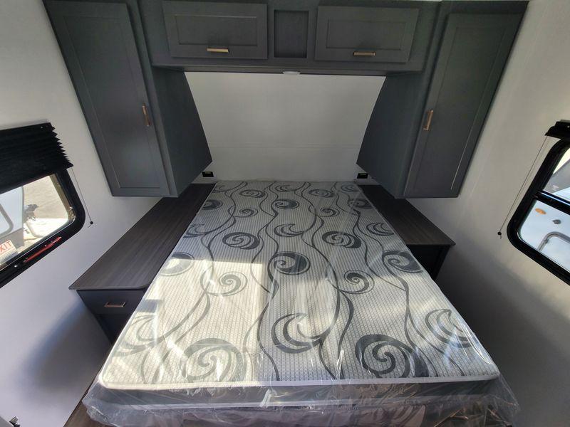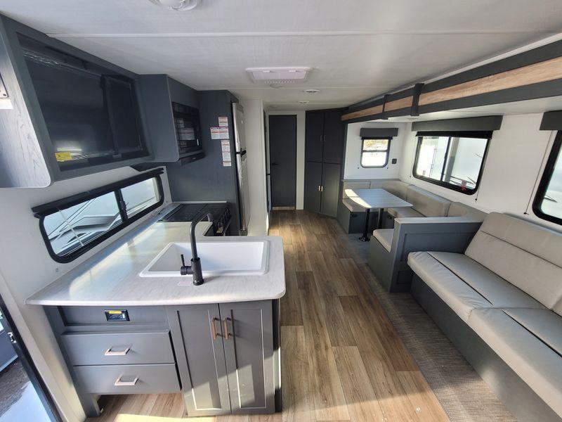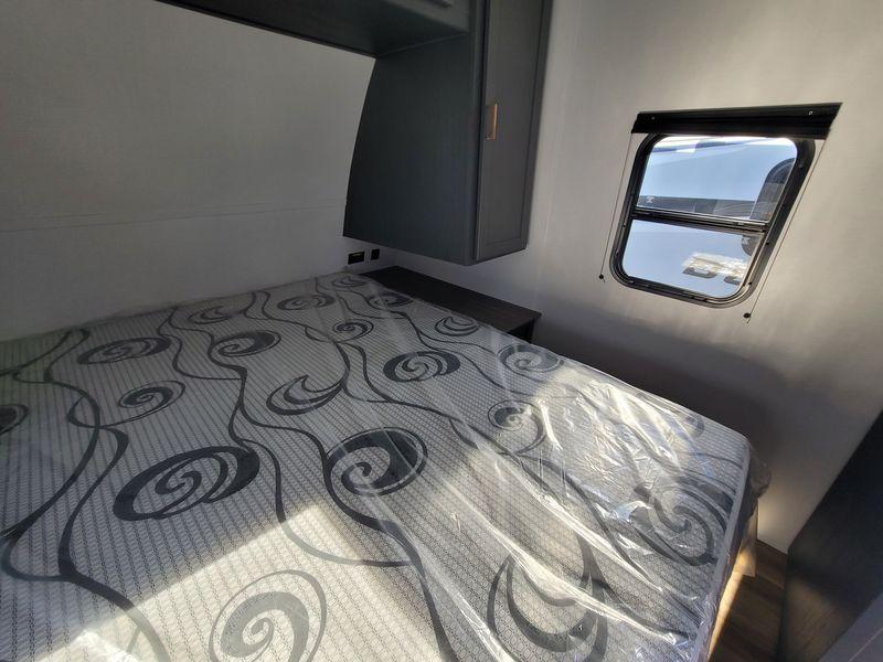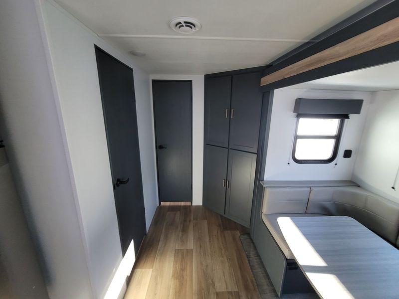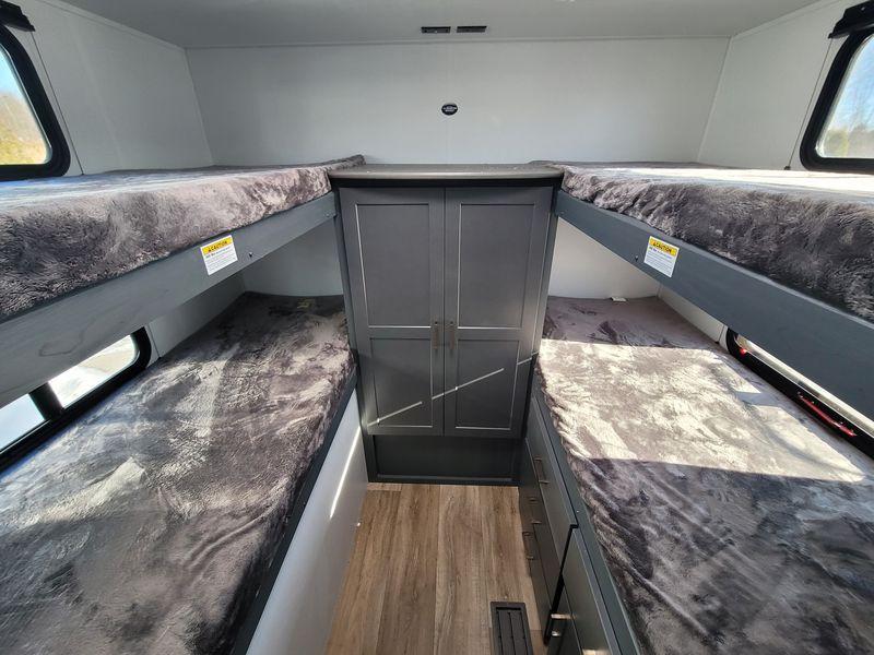 You're going to love this travel trailer with a front private bedroom for you and a rear private bunkhouse for your guests. There are four bunk beds, plus a wardrobe and additional storage to keep this space tidy. And the front bedroom includes a queen bed, dual wardrobes and dual nightstands to keep your phone and books on. Everyone can meet in the main living area that is made spacious by the large slide out. When your crew has worked up an appetite, you can make lunch on the two burner range or use the microwave oven. There is also a large 12V refrigerator to keep cold drinks stocked. Outside, you'll appreciate multiple pass-through storage compartments and a power awning to provide shade!