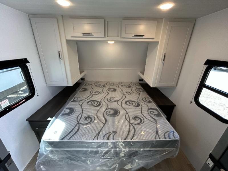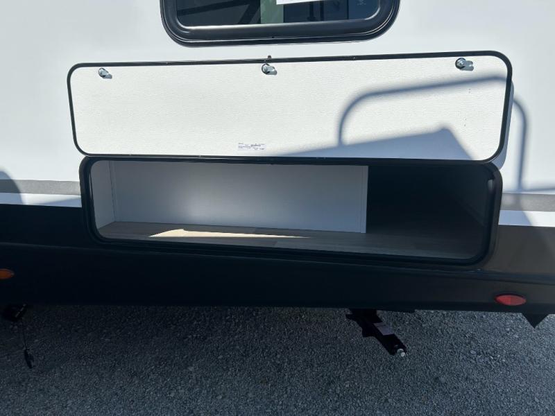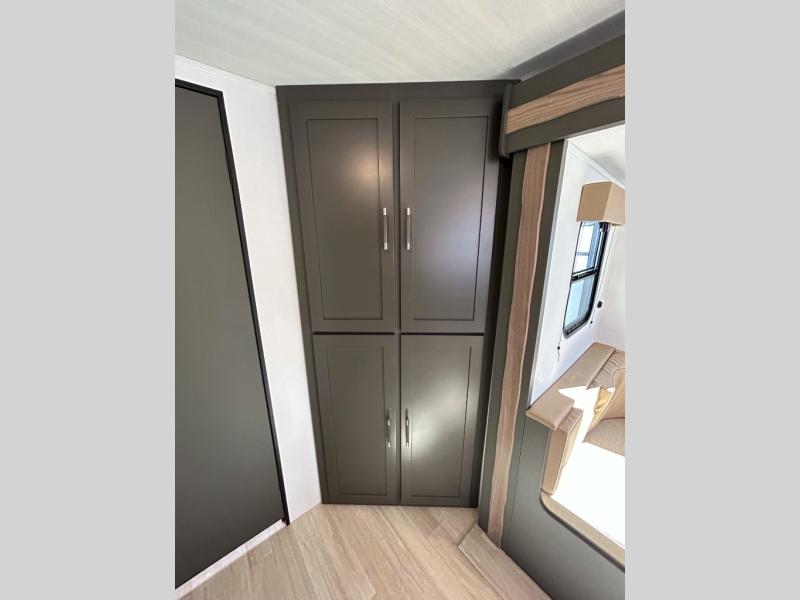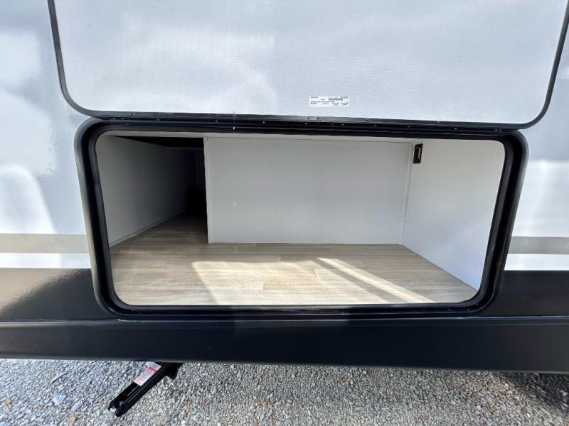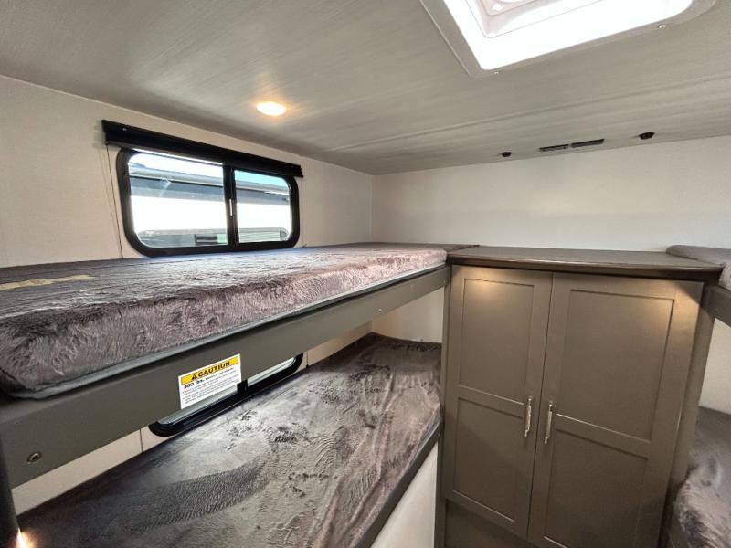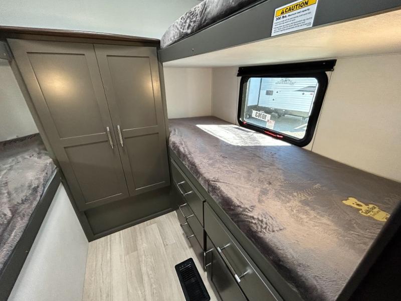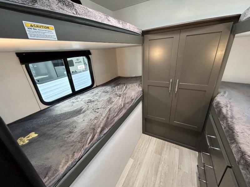 You're going to love this travel trailer with a front private bedroom for you and a rear private bunkhouse for your guests. There are four bunk beds, plus a wardrobe and additional storage to keep this space tidy. And the front bedroom includes a queen bed, dual wardrobes and dual nightstands to keep your phone and books on. Everyone can meet in the main living area that is made spacious by the large slide out. When your crew has worked up an appetite, you can make lunch on the two burner range or use the microwave oven. There is also a large 12V refrigerator to keep cold drinks stocked. Outside, you'll appreciate multiple pass-through storage compartments and a power awning to provide shade!