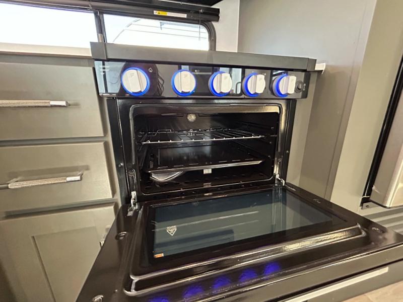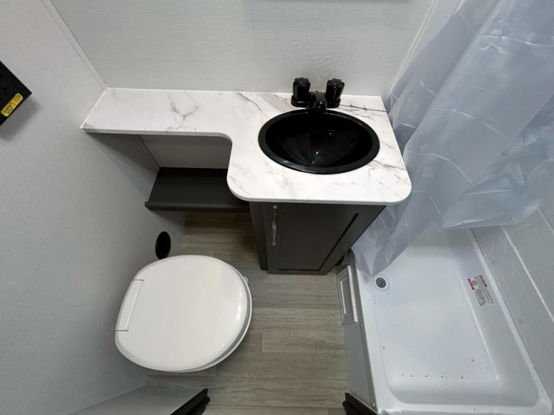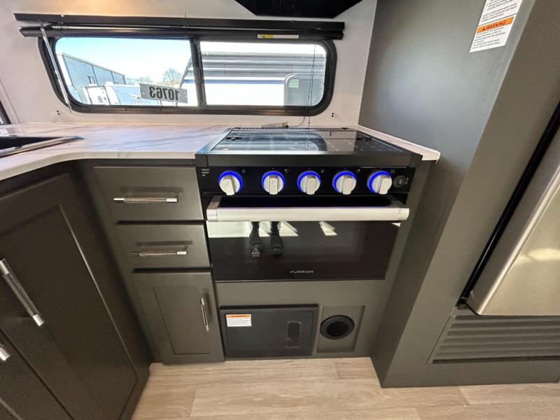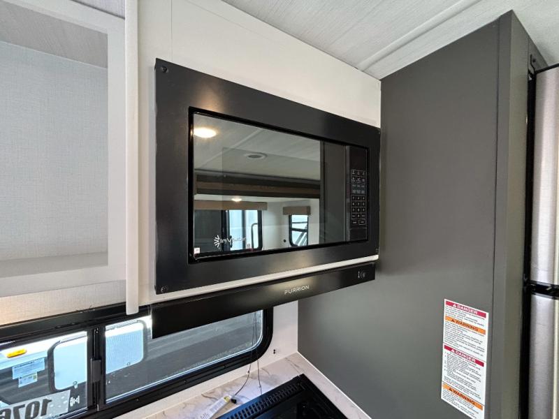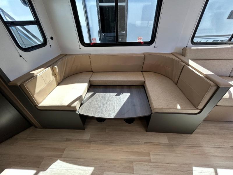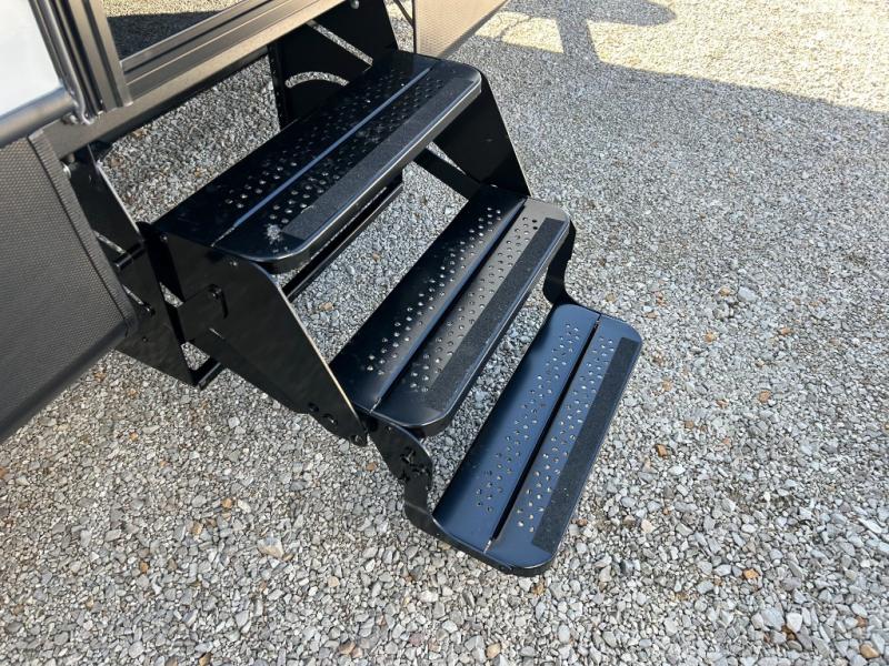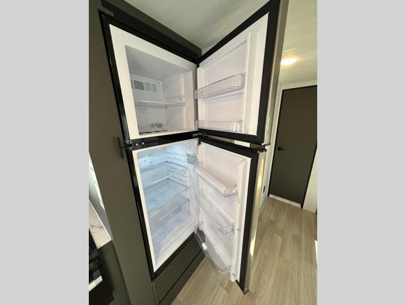 You're going to love this travel trailer with a front private bedroom for you and a rear private bunkhouse for your guests. There are four bunk beds, plus a wardrobe and additional storage to keep this space tidy. And the front bedroom includes a queen bed, dual wardrobes and dual nightstands to keep your phone and books on. Everyone can meet in the main living area that is made spacious by the large slide out. When your crew has worked up an appetite, you can make lunch on the two burner range or use the microwave oven. There is also a large 12V refrigerator to keep cold drinks stocked. Outside, you'll appreciate multiple pass-through storage compartments and a power awning to provide shade!