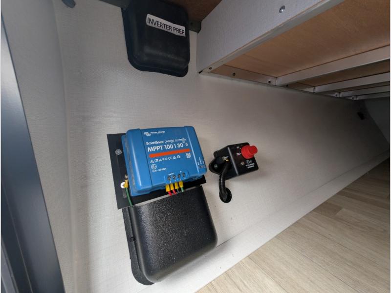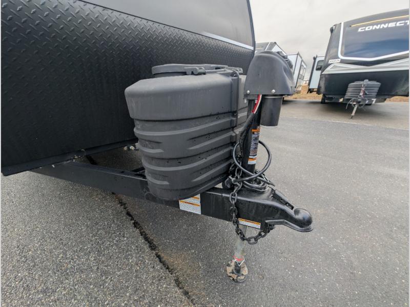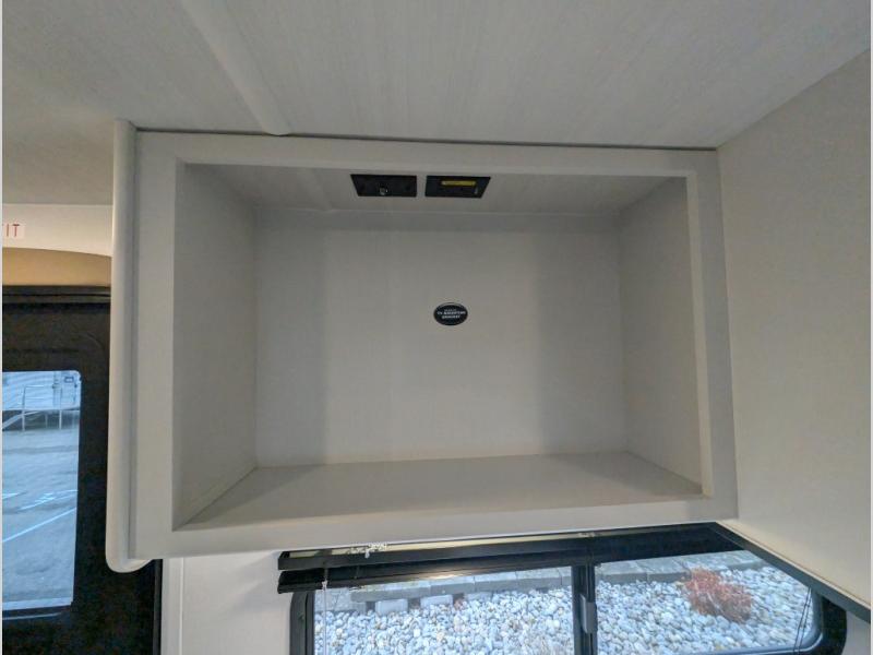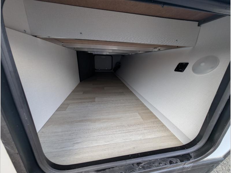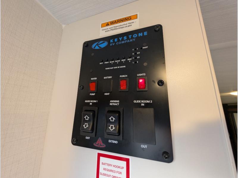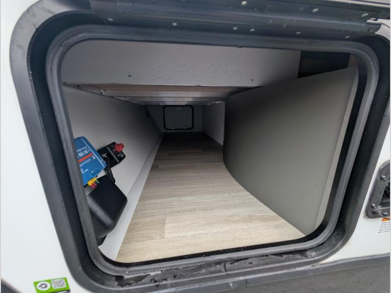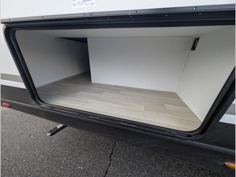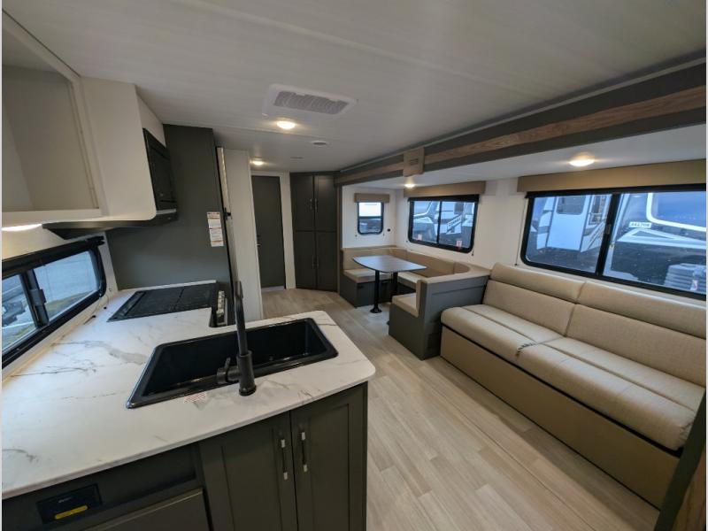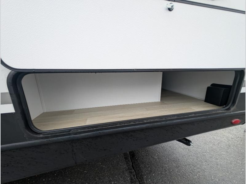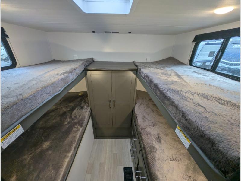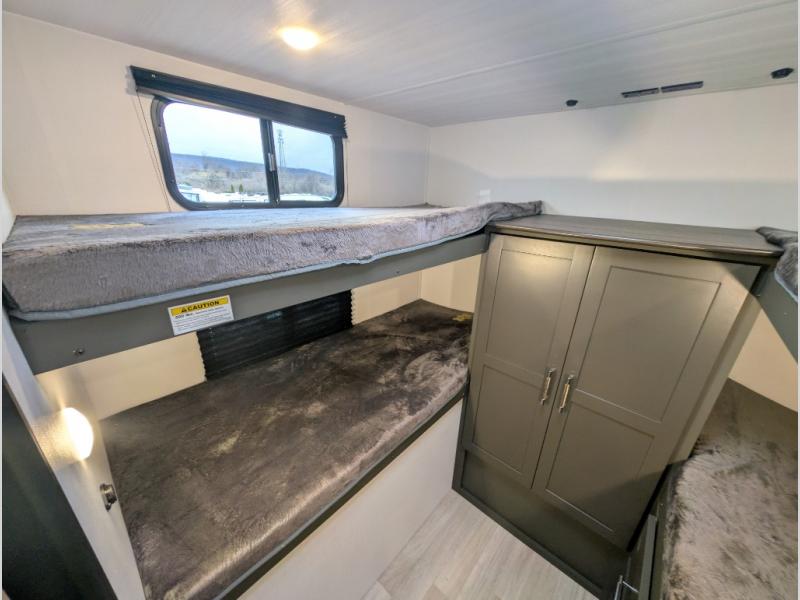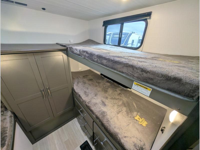 You're going to love this travel trailer with a front private bedroom for you and a rear private bunkhouse for your guests. There are four bunk beds, plus a wardrobe and additional storage to keep this space tidy. And the front bedroom includes a queen bed, dual wardrobes and dual nightstands to keep your phone and books on. Everyone can meet in the main living area that is made spacious by the large slide out. When your crew has worked up an appetite, you can make lunch on the two burner range or use the microwave oven. There is also a large 12V refrigerator to keep cold drinks stocked. Outside, you'll appreciate multiple pass-through storage compartments and a power awning to provide shade!