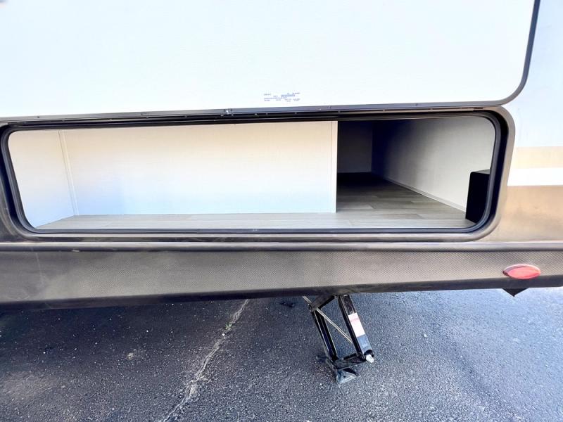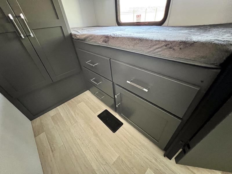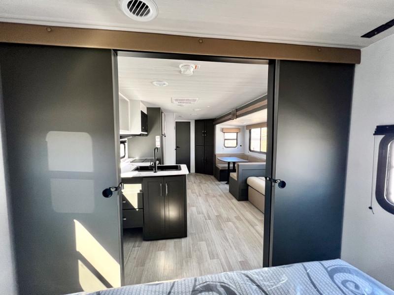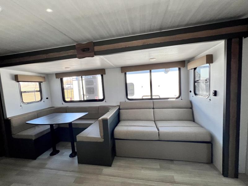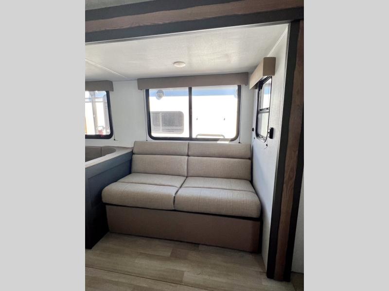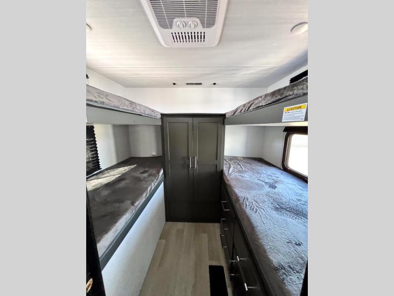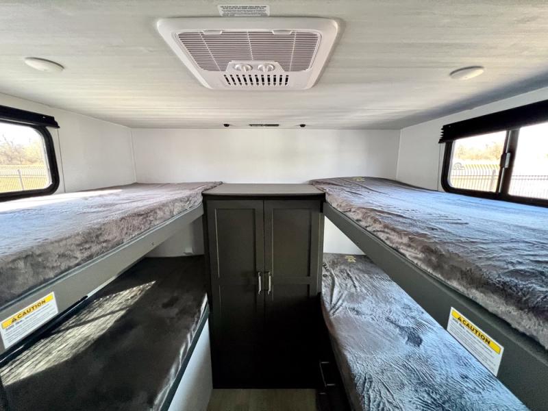 You're going to love this travel trailer with a front private bedroom for you and a rear private bunkhouse for your guests. There are four bunk beds, plus a wardrobe and additional storage to keep this space tidy. And the front bedroom includes a queen bed, dual wardrobes and dual nightstands to keep your phone and books on. Everyone can meet in the main living area that is made spacious by the large slide out. When your crew has worked up an appetite, you can make lunch on the two burner range or use the microwave oven. There is also a large 12V refrigerator to keep cold drinks stocked. Outside, you'll appreciate multiple pass-through storage compartments and a power awning to provide shade!