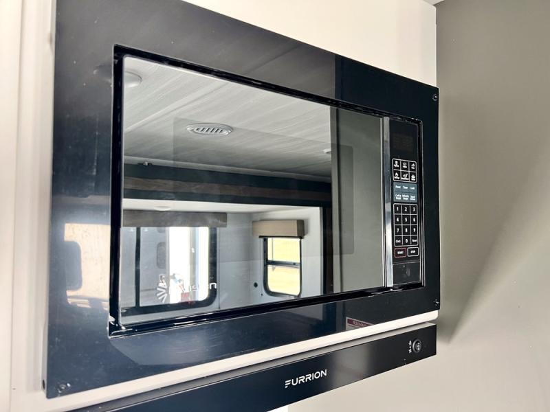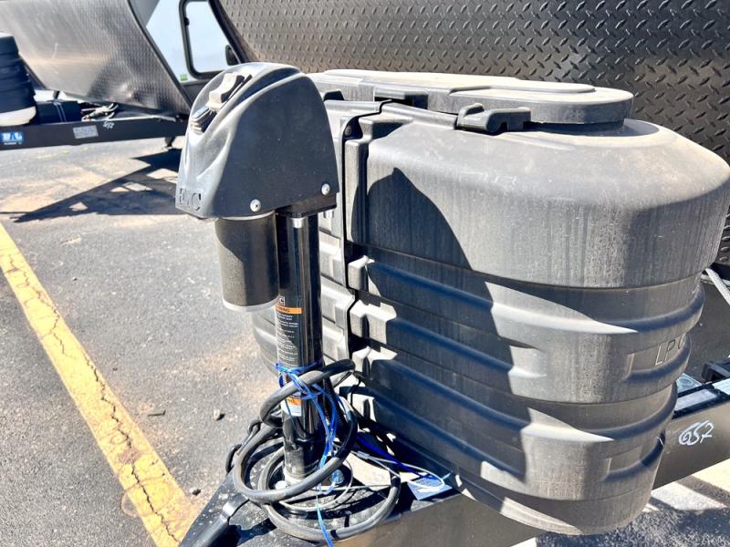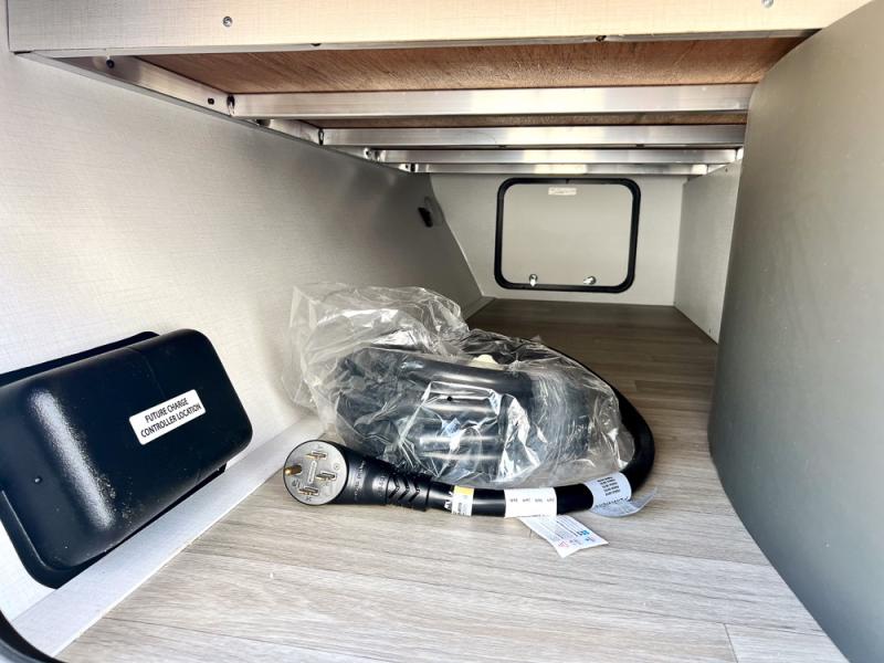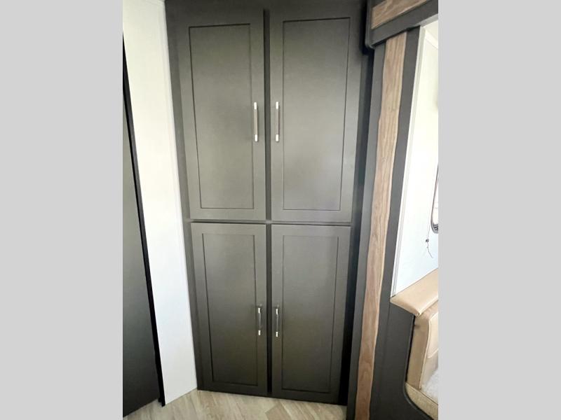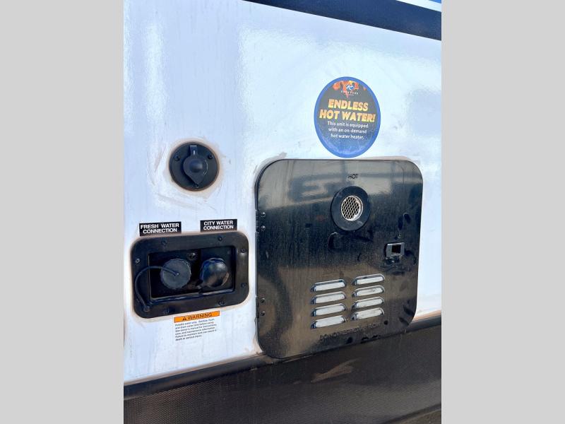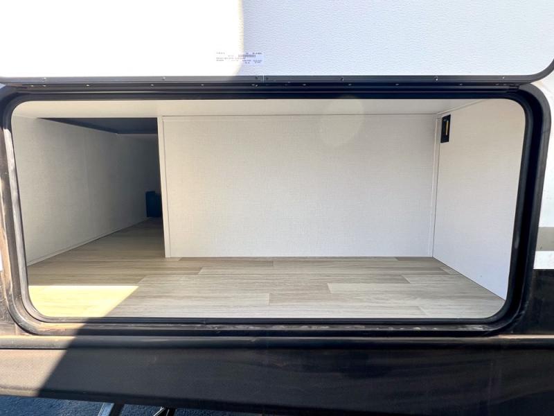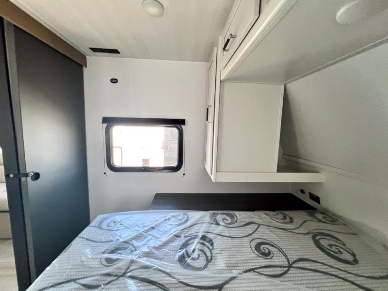 You're going to love this travel trailer with a front private bedroom for you and a rear private bunkhouse for your guests. There are four bunk beds, plus a wardrobe and additional storage to keep this space tidy. And the front bedroom includes a queen bed, dual wardrobes and dual nightstands to keep your phone and books on. Everyone can meet in the main living area that is made spacious by the large slide out. When your crew has worked up an appetite, you can make lunch on the two burner range or use the microwave oven. There is also a large 12V refrigerator to keep cold drinks stocked. Outside, you'll appreciate multiple pass-through storage compartments and a power awning to provide shade!
