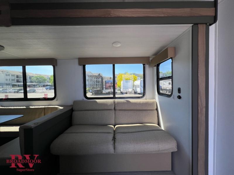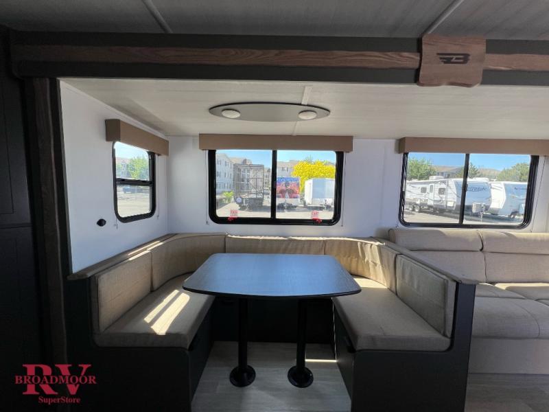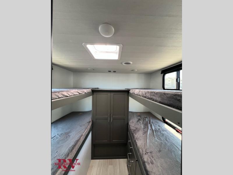 You're going to love this travel trailer with a front private bedroom for you and a rear private bunkhouse for your guests. There are four bunk beds, plus a wardrobe and additional storage to keep this space tidy. And the front bedroom includes a queen bed, dual wardrobes and dual nightstands to keep your phone and books on. Everyone can meet in the main living area that is made spacious by the large slide out. When your crew has worked up an appetite, you can make lunch on the two burner cooktop or use the microwave oven. There is also a large 12V refrigerator to keep cold drinks stocked. Outside, you'll appreciate multiple pass-through storage compartments and an awing to provide shade!
