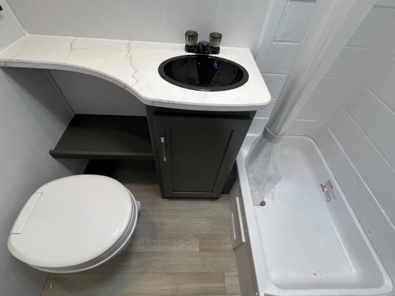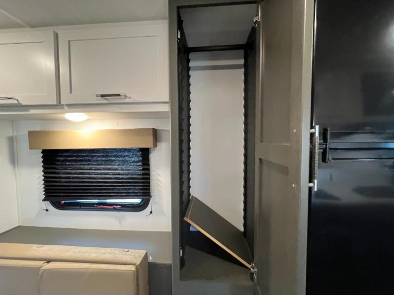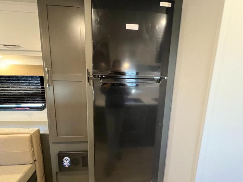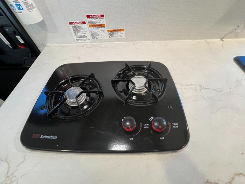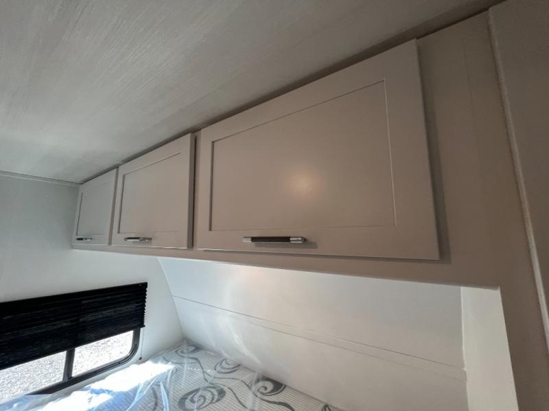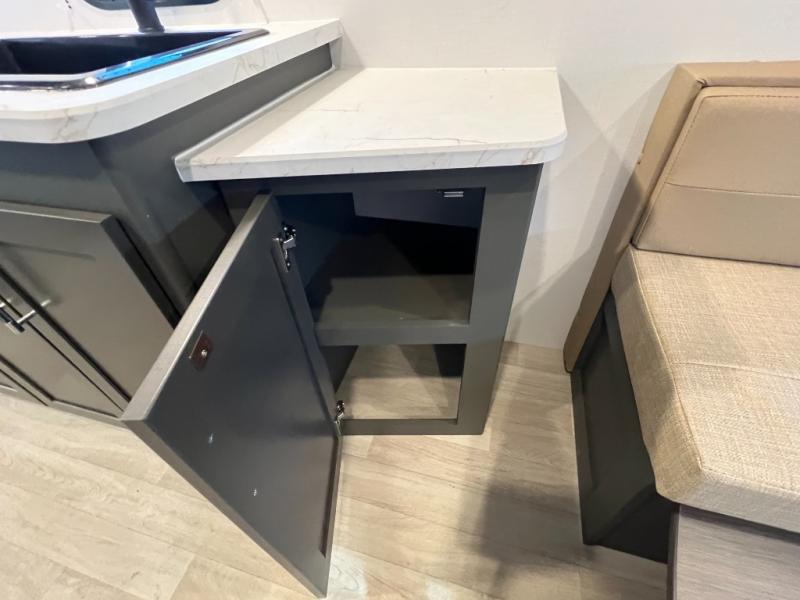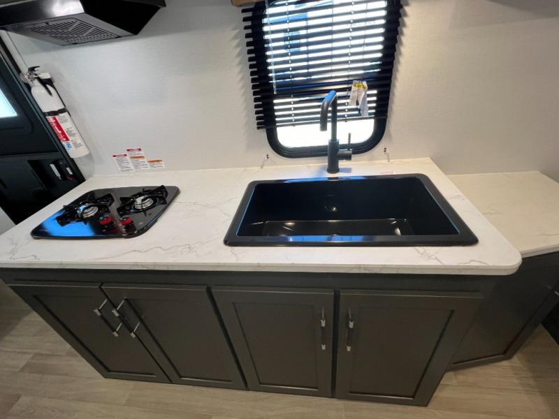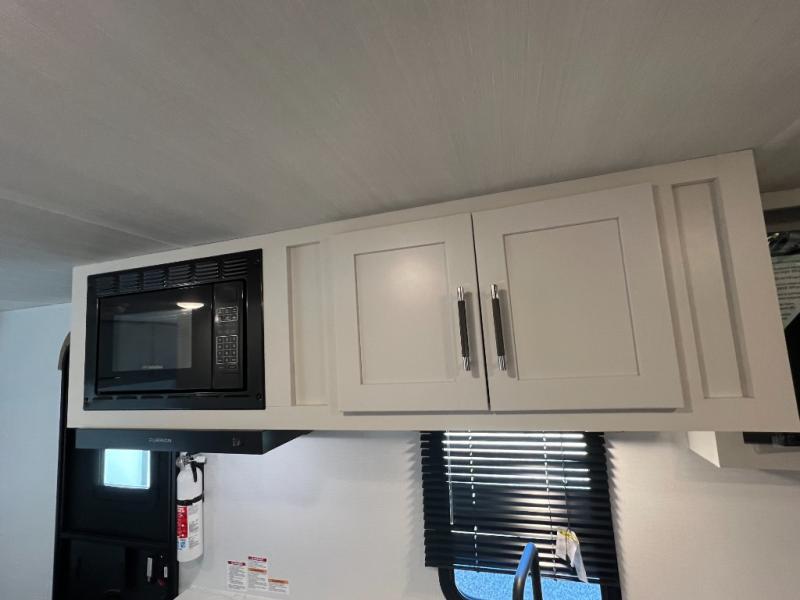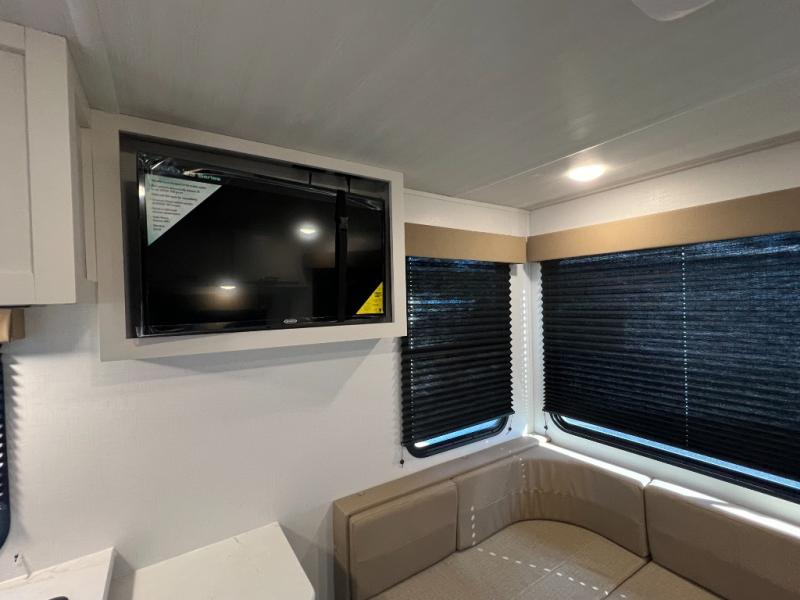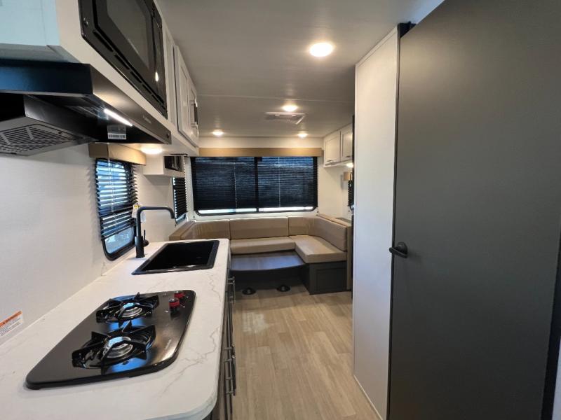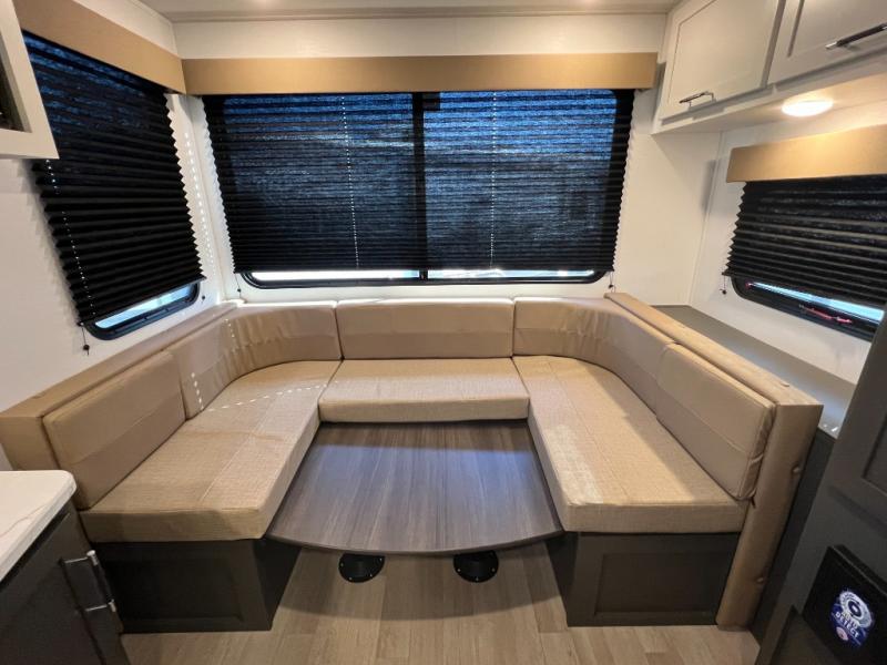 Simple and lightweight; this travel trailer is the unit you've been searching for! Once you arrive at your destination, unload the pass-thru storage, then head inside to start lunch in the full kitchen. Here, you'll find a microwave oven, two burner cooktop to cook meals on, and an 8 cu. ft. refrigerator for perishables. The rear U-shaped dinette can serve as dining and sleeping space for your guests, while you take the front corner queen bed. Don't let this travel trailer slip away!