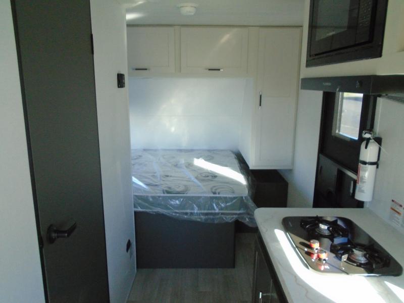 Simple and lightweight; this travel trailer is the unit you've been searching for! Once you arrive at your destination, unload the pass-thru storage, then head inside to start lunch in the full kitchen. Here, you'll find a microwave oven, two burner cooktop to cook meals on, and an 8 cu. ft. refrigerator for perishables. The rear U-shaped dinette can serve as dining and sleeping space for your guests, while you take the front corner queen bed. Don't let this travel trailer slip away!