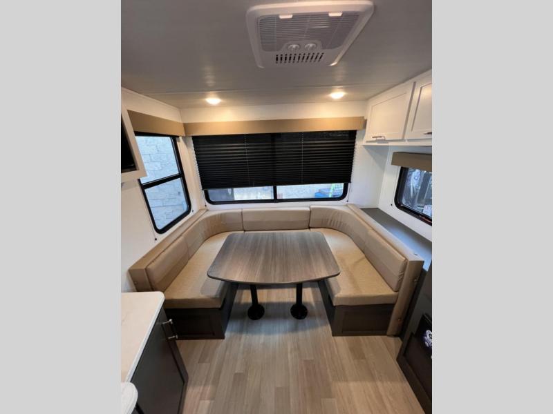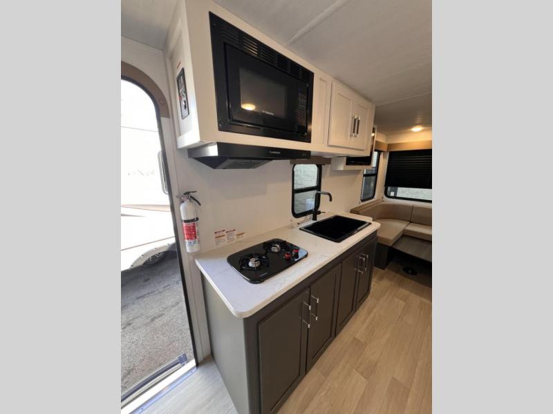 Simple and lightweight; this travel trailer is the unit you've been searching for! Once you arrive at your destination, unload the pass-thru storage, then head inside to start lunch in the full kitchen. Here, you'll find a microwave oven, two burner cooktop to cook meals on, and an 8 cu. ft. refrigerator for perishables. The rear U-shaped dinette can serve as dining and sleeping space for your guests, while you take the front corner queen bed. Don't let this travel trailer slip away!