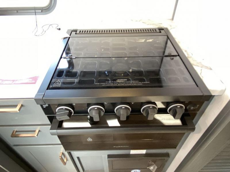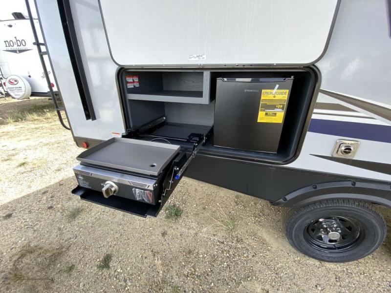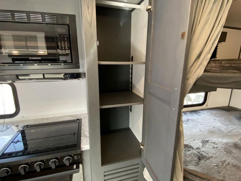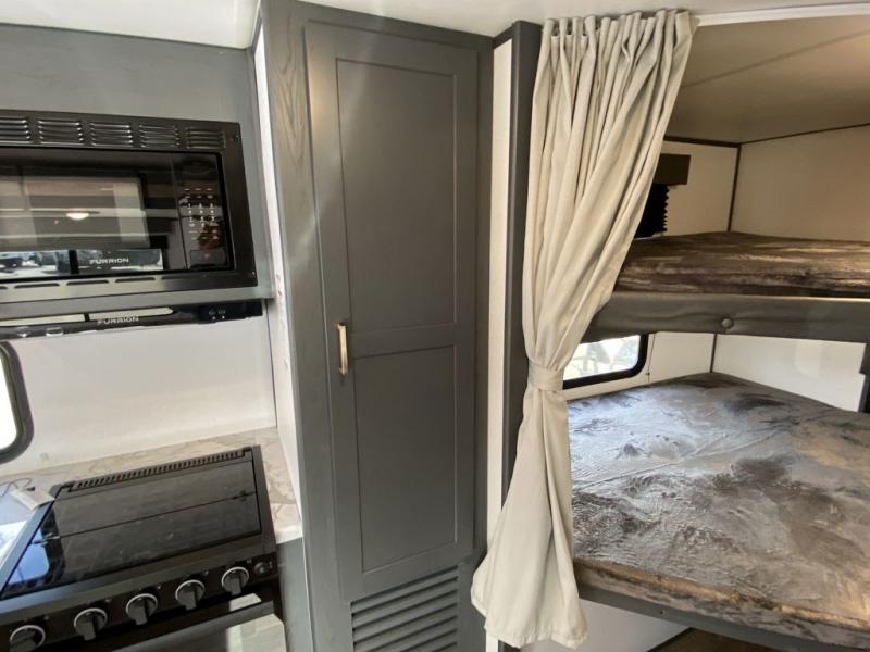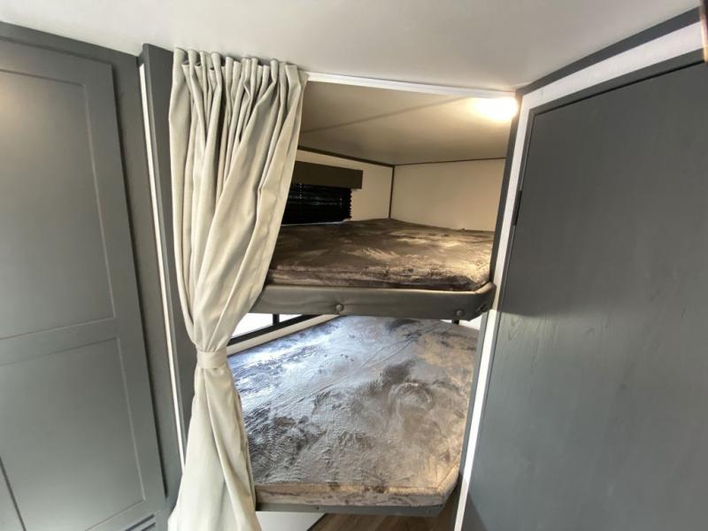You can easily sleep eight in this travel trailer thanks to the 51" x 74" double-size bunks, the U-shaped Do-More dinette table, and the queen bed in the front bedroom. Whip up your best meals on the three burner cooktop, or use the microwave oven. You can dine around the dinette, or take your plate outdoors to sit under the 15' awning, plus there is an outdoor kitchen with a pull-out griddle and refrigerator.