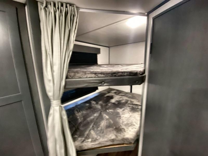 You can easily sleep eight in this travel trailer thanks to the 51" x 74" double-size bunks, the U-shaped Do-More dinette table, and the queen bed in the front bedroom. Whip up your best meals on the three burner cooktop, or use the microwave oven. You can dine around the dinette, or take your plate outdoors to sit under the 15' awning, plus there is an outdoor kitchen with a pull-out griddle and refrigerator.