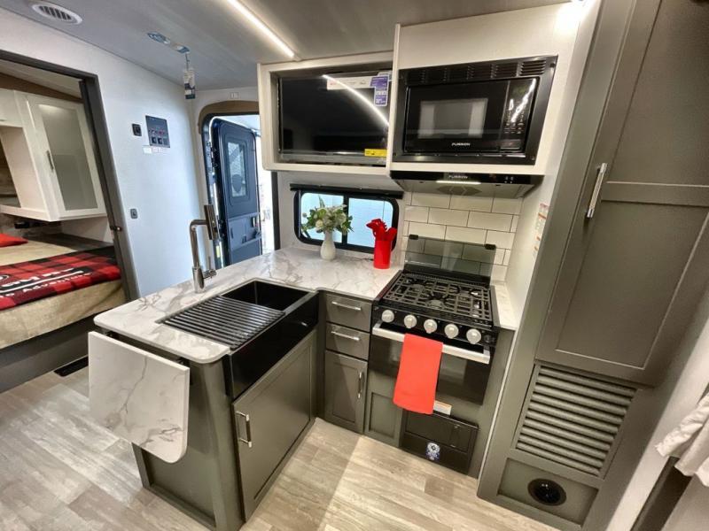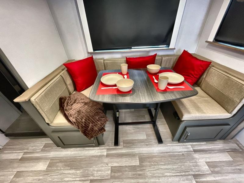 The Bullet Crossfire by Keystone are the perfect lightweight travel travel for rookie campers to seasoned RVers! Each one is built with a one-piece polypropylene underbelly, a fully walkable roof, and a high impact thermoset resin painted front cap for added durability. There is also a Dexter Torsion axle rubber ride suspension and Goodyear Endurance tires for a smooth tow plus a power tongue jack and power stabilizer jacks for easy set up. The interior will have you feeling right at home with deluxe night shades, updated Tranquil Timber decor, residential Beauflor vinyl flooring, and seamless kitchen countertops.
