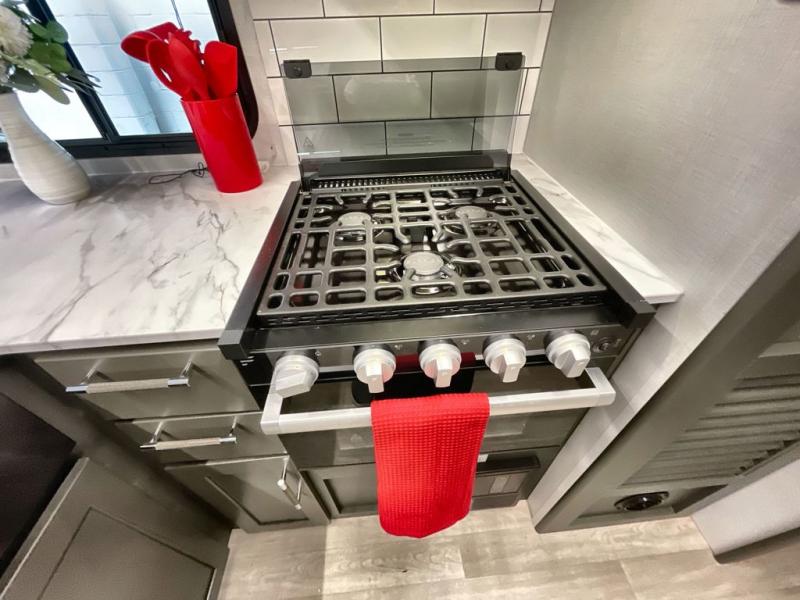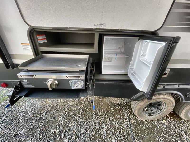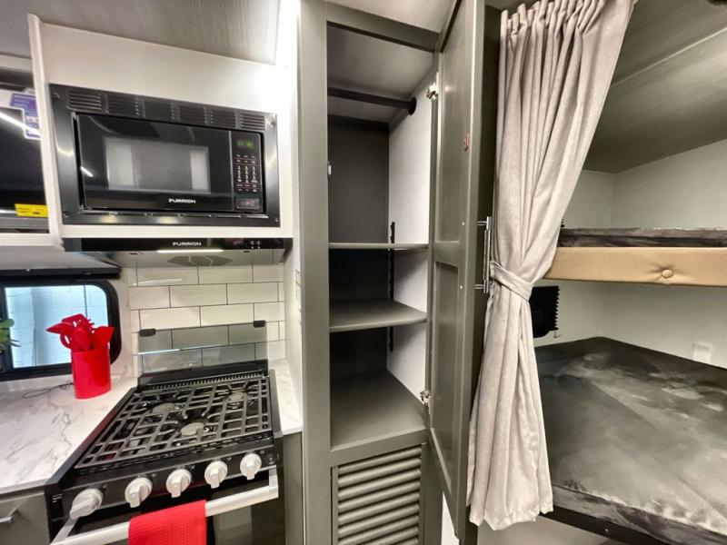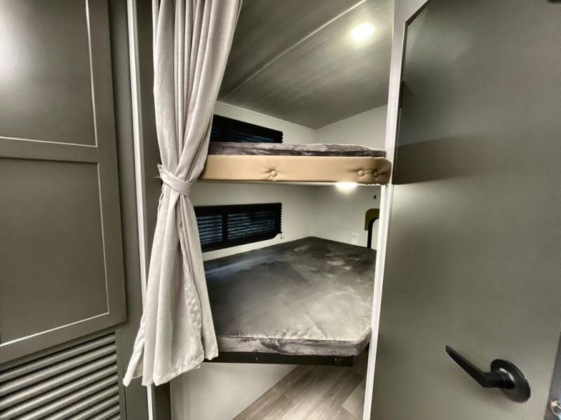 You can easily sleep eight in this travel trailer thanks to the 51" x 74" double-size bunks, the U-shaped Do-More dinette table, and the queen bed in the front bedroom. Whip up your best meals on the three burner cooktop, or use the microwave oven. You can dine around the dinette, or take your plate outdoors to sit under the 15' awning, plus there is an outdoor kitchen with a pull-out griddle and refrigerator.