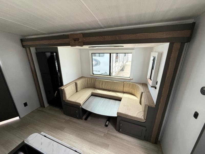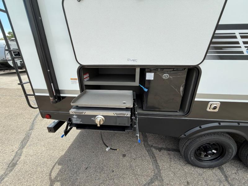 You can easily sleep eight in this travel trailer thanks to the 51" x 74" double-size bunks, the U-shaped Do-More dinette table, and the queen bed in the front bedroom. Whip up your best meals on the three burner cooktop, or use the microwave oven. You can dine around the dinette, or take your plate outdoors to sit under the 15' awning, plus there is an outdoor kitchen with a pull-out griddle and refrigerator.