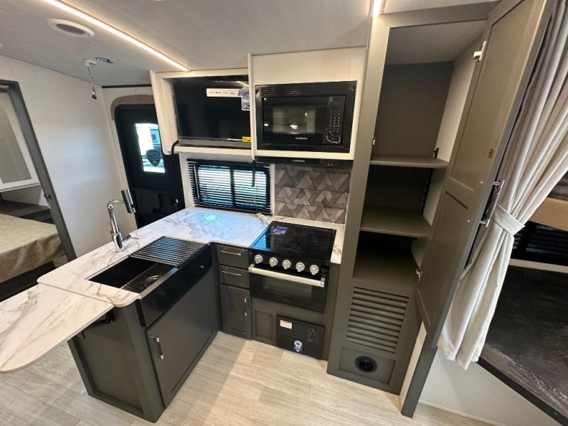 The Bullet Crossfire by Keystone are the perfect lightweight travel travel for rookie campers to seasoned RVers! Each one is built with a one-piece polypropylene underbelly, a fully walkable roof, and a high impact thermoset resin painted front cap for added durability. There is also a Dexter Torsion axle rubber ride suspension and Goodyear Endurance tires for a smooth tow plus a power tongue jack and power stabilizer jacks for easy set up. The interior will have you feeling right at home with deluxe night shades, updated Tranquil Timber decor, residential Beauflor vinyl flooring, and seamless kitchen countertops.